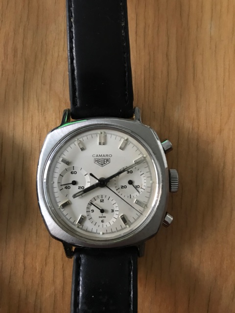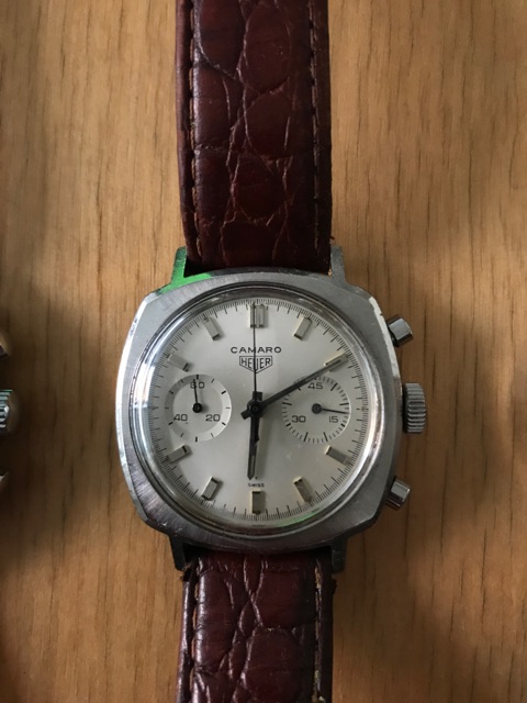 the 3 register one seems either very rare or not genuine, I cannot find a similar model with the same size difference between the Heuer logo and the Camaro text, I am also yet to find one where the hour markers overlap the face markings in the same way.