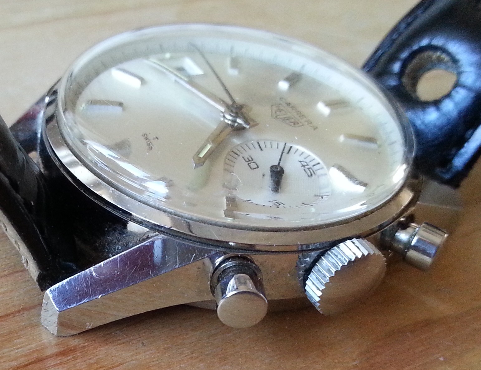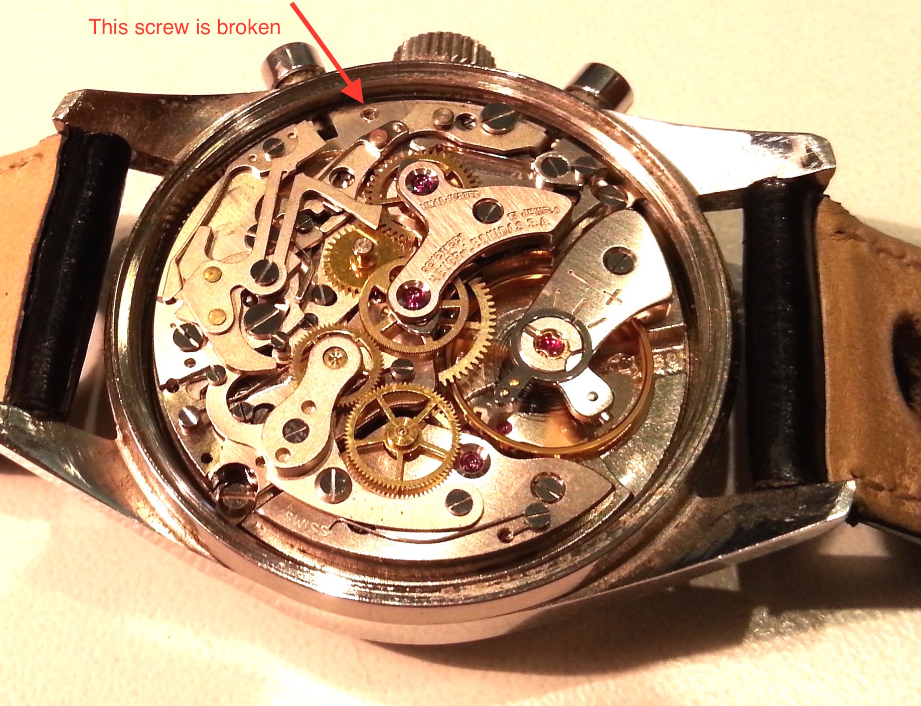 Its Landeron 189 is running well and strong, but the reset function does not work, because the screw, that holds the lever, to which the pusher is pushing, is broken (sorry I don`t know the correct denomination in english)