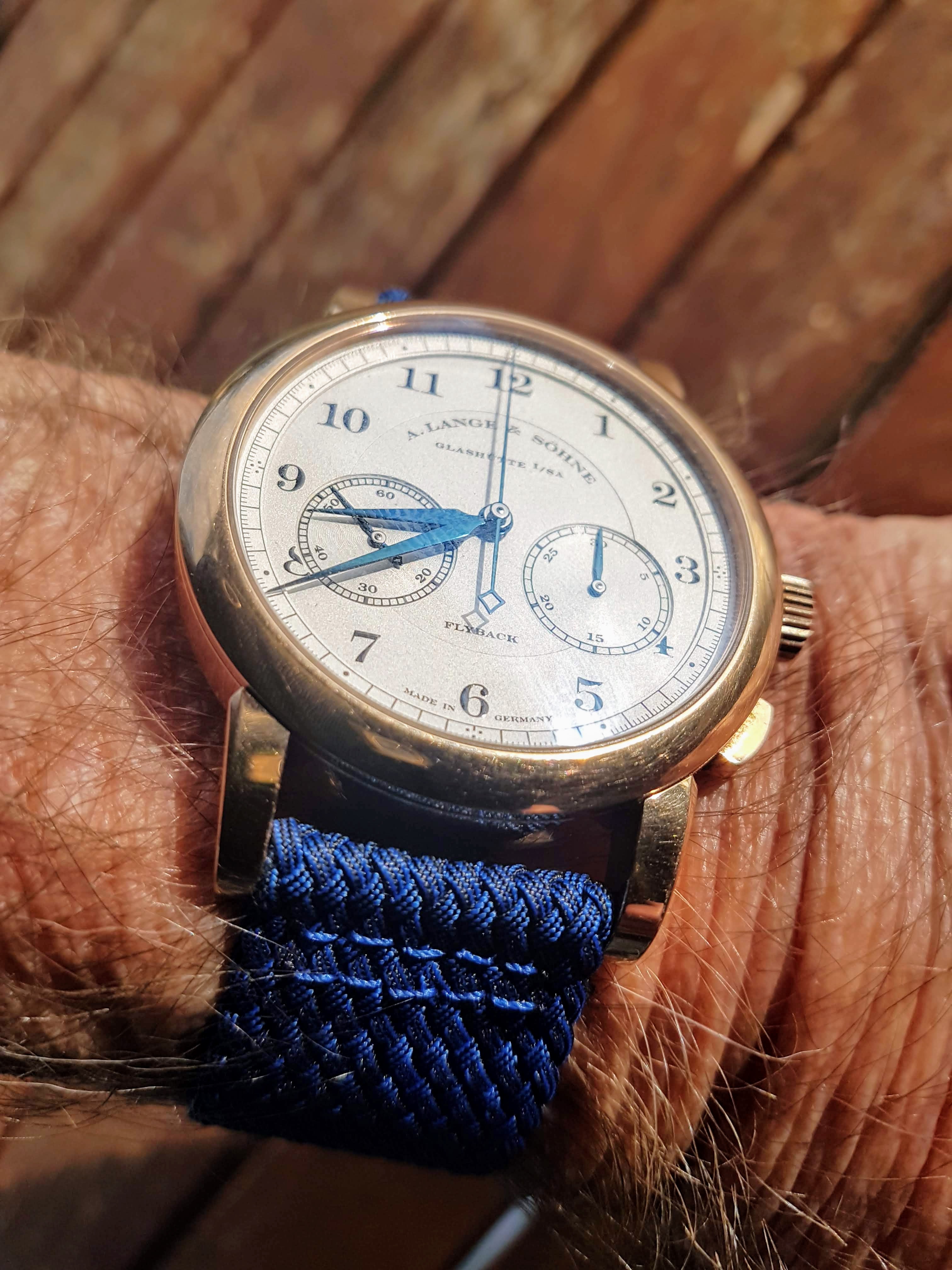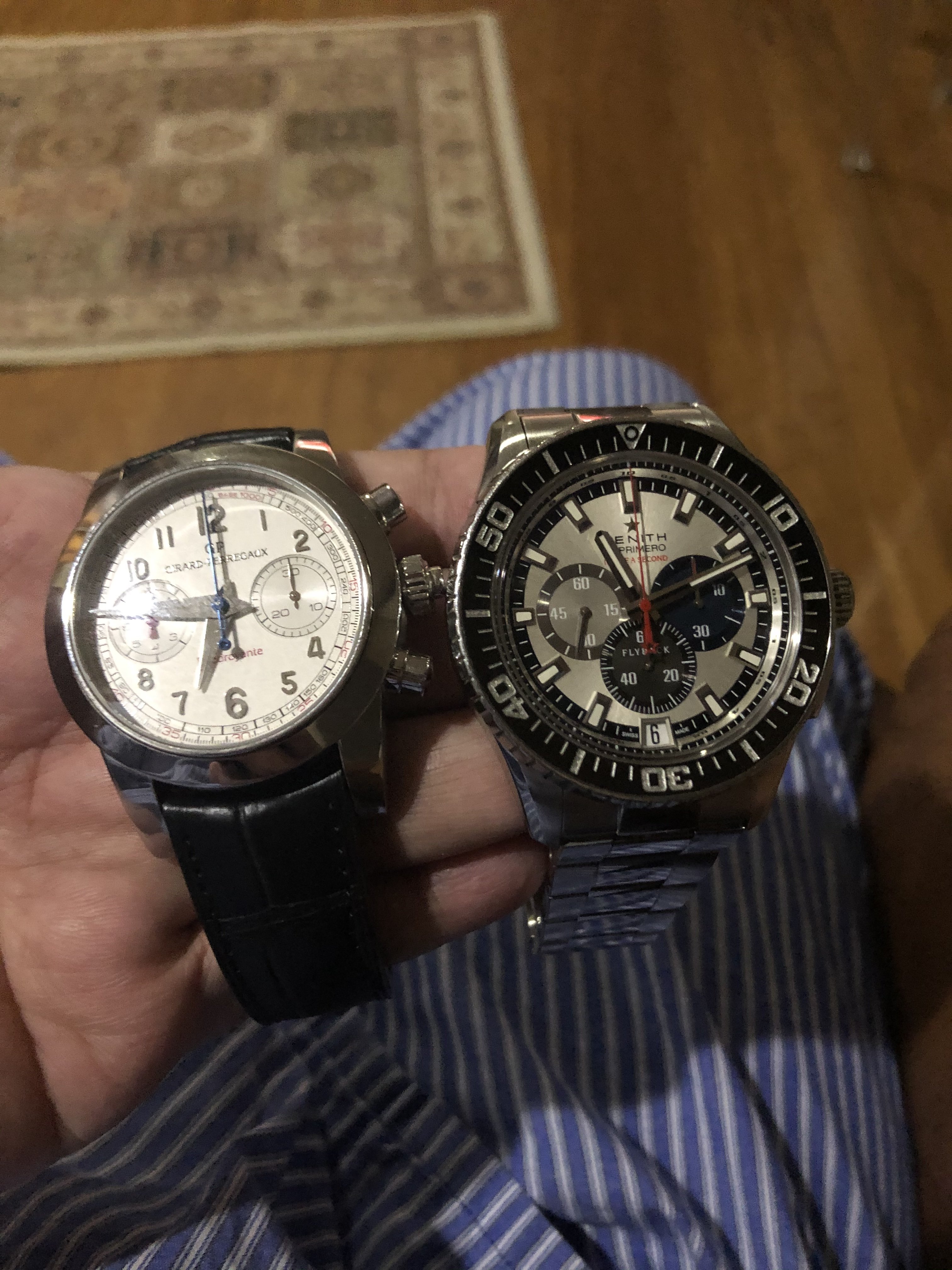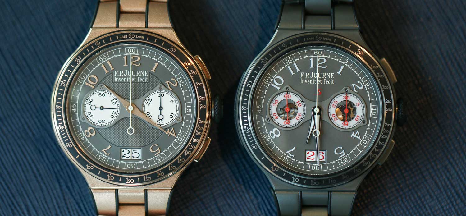Two individual timed chronographs at the bottom subdials with a third register acting as a split-second differential at the upper subdial. It’s a monophsher: The first push starts the two bottom subdials where they begin timing. The second push stops the dial on the lower left and begins the split-recording dial on the upper subdial. The third push stops the second time (lower right) and the split time (upper). The fourth and final push brings everything back to zero.
