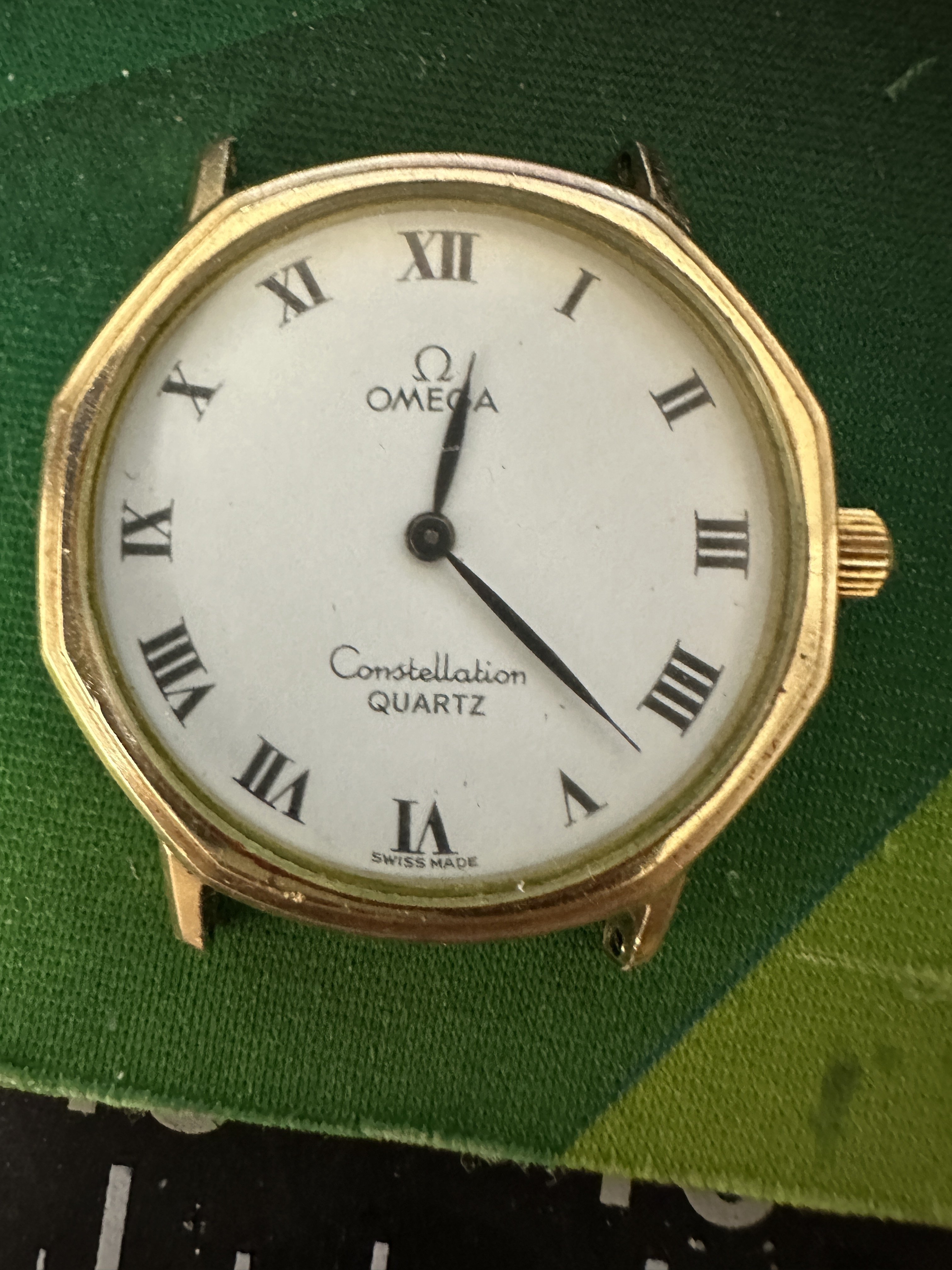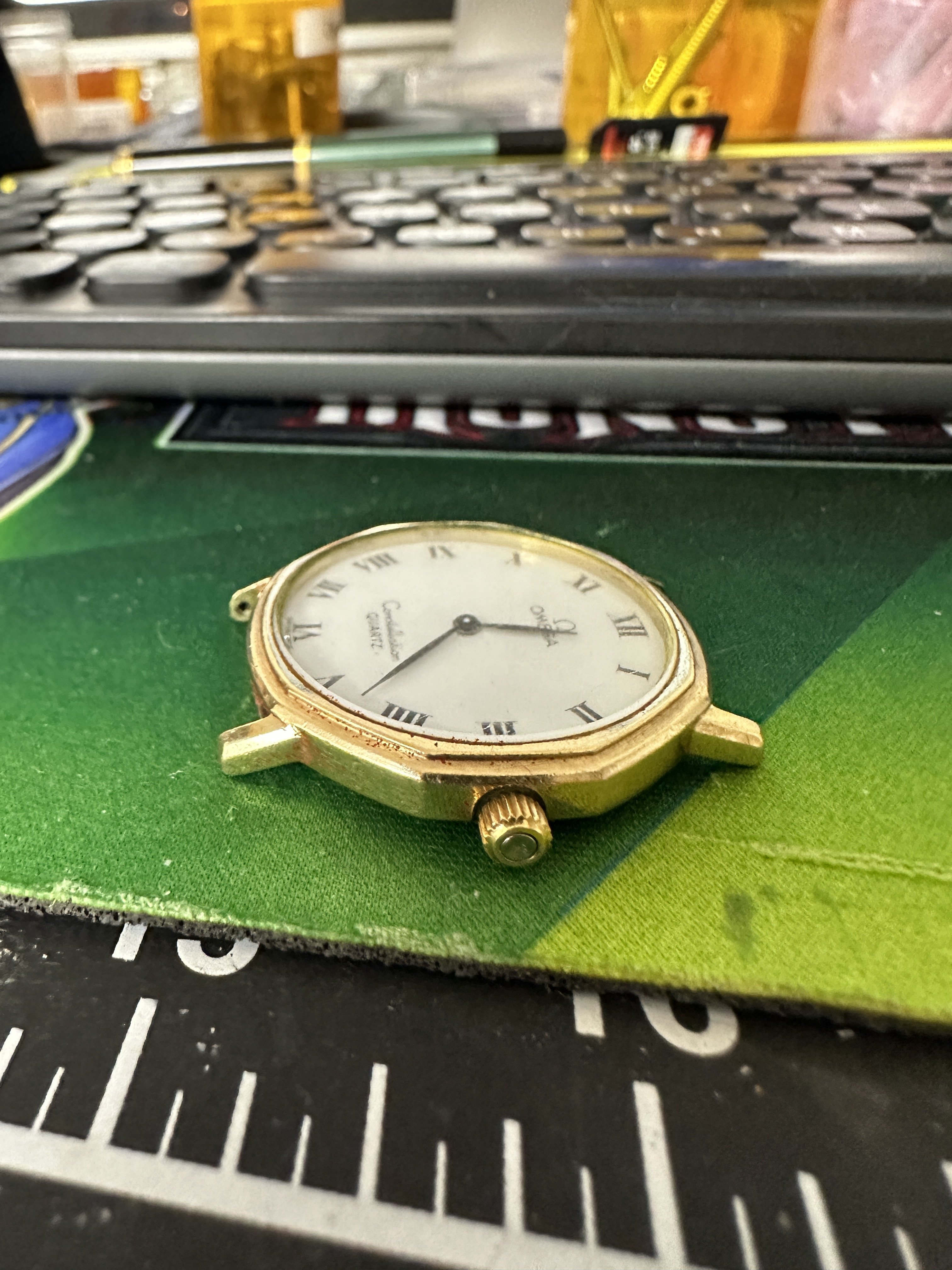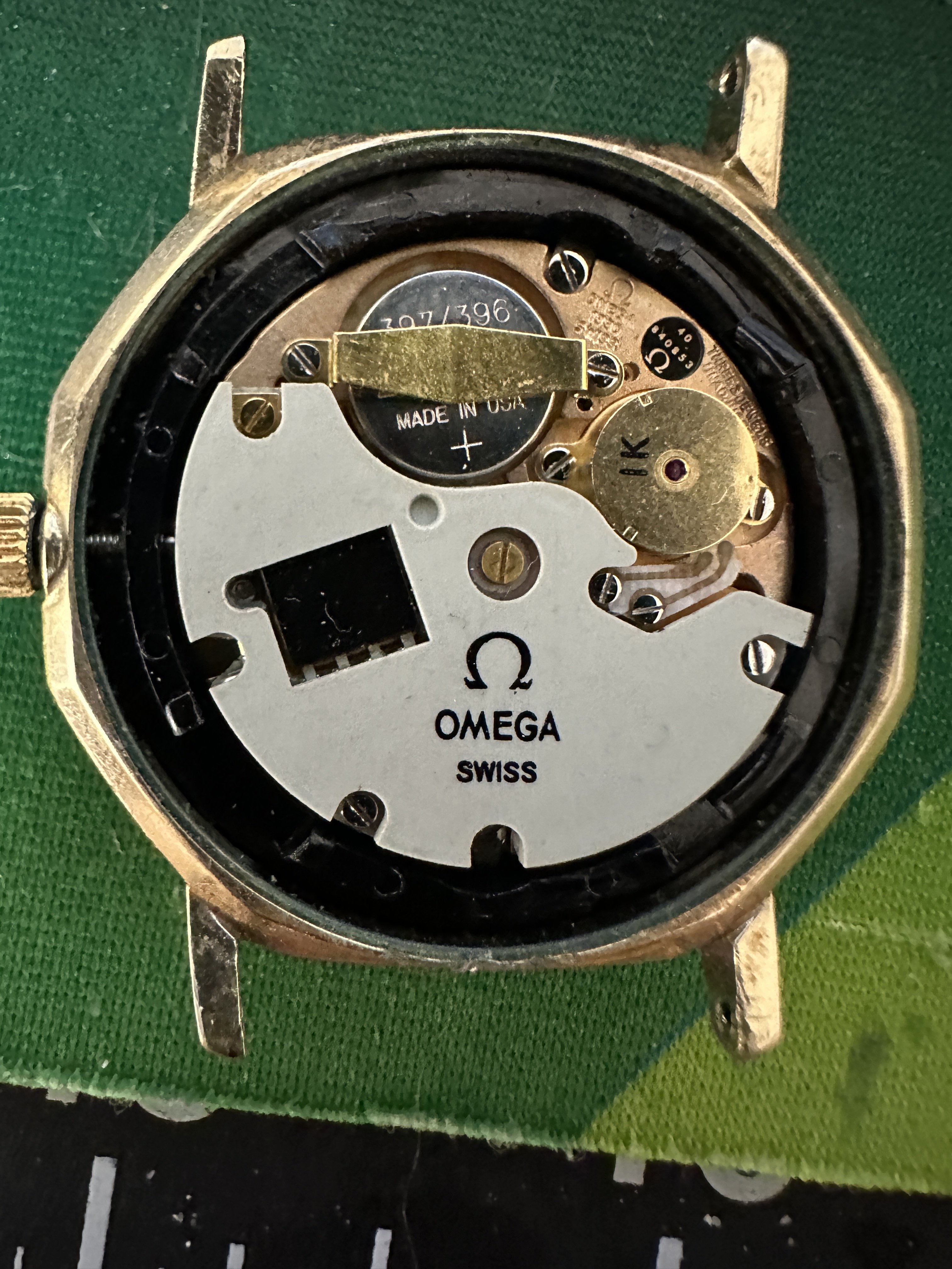 It is electric quartz, no third hand and obviously, no sub-dials. The 10kt gold-filled case has an octagonal bezel overlaying the round base. Original power cell was mercury-oxide.