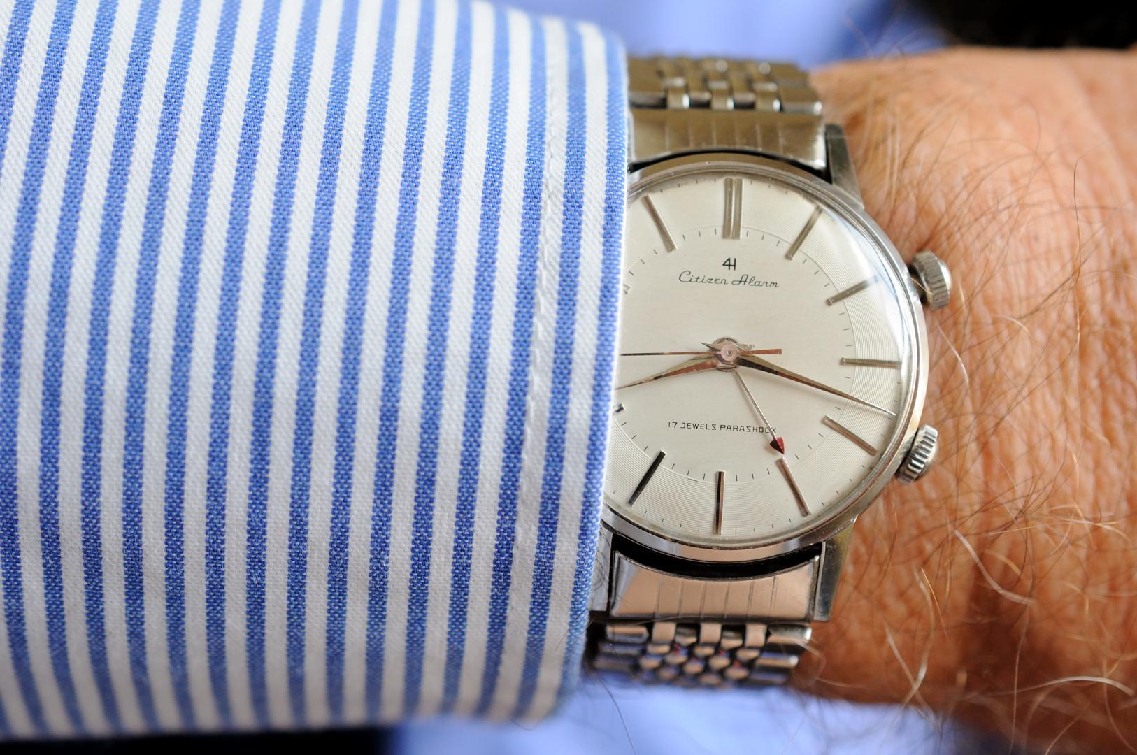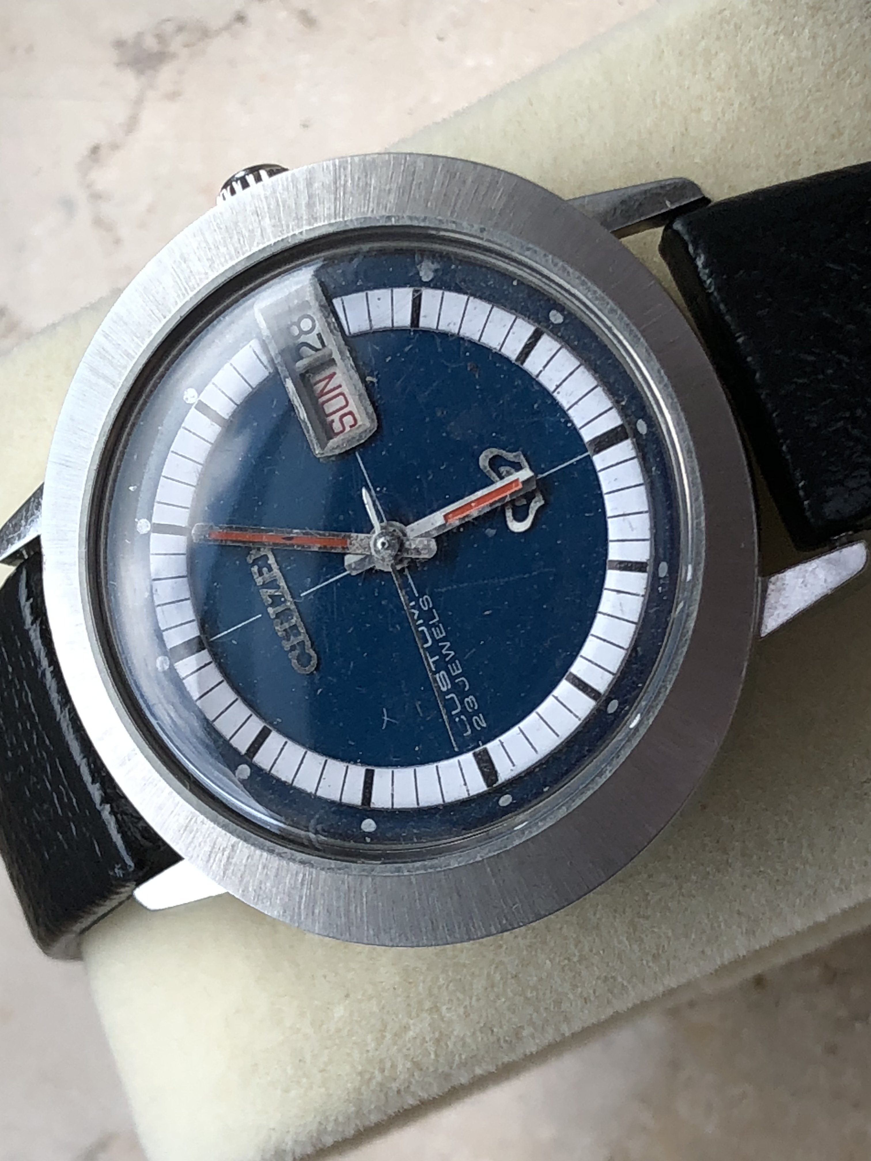 Rare early diver, possibly the first manufactured by Citizen. A really nice watch, with an eccentric (and cool) winding system. Also, remarkably, the different color lume hands are intentional and original! I have seen several others with the same design. Presumably this would have, in theory, helped a diver to immediately distinguish between the two if the water was murky, or the mask fogged, etc.