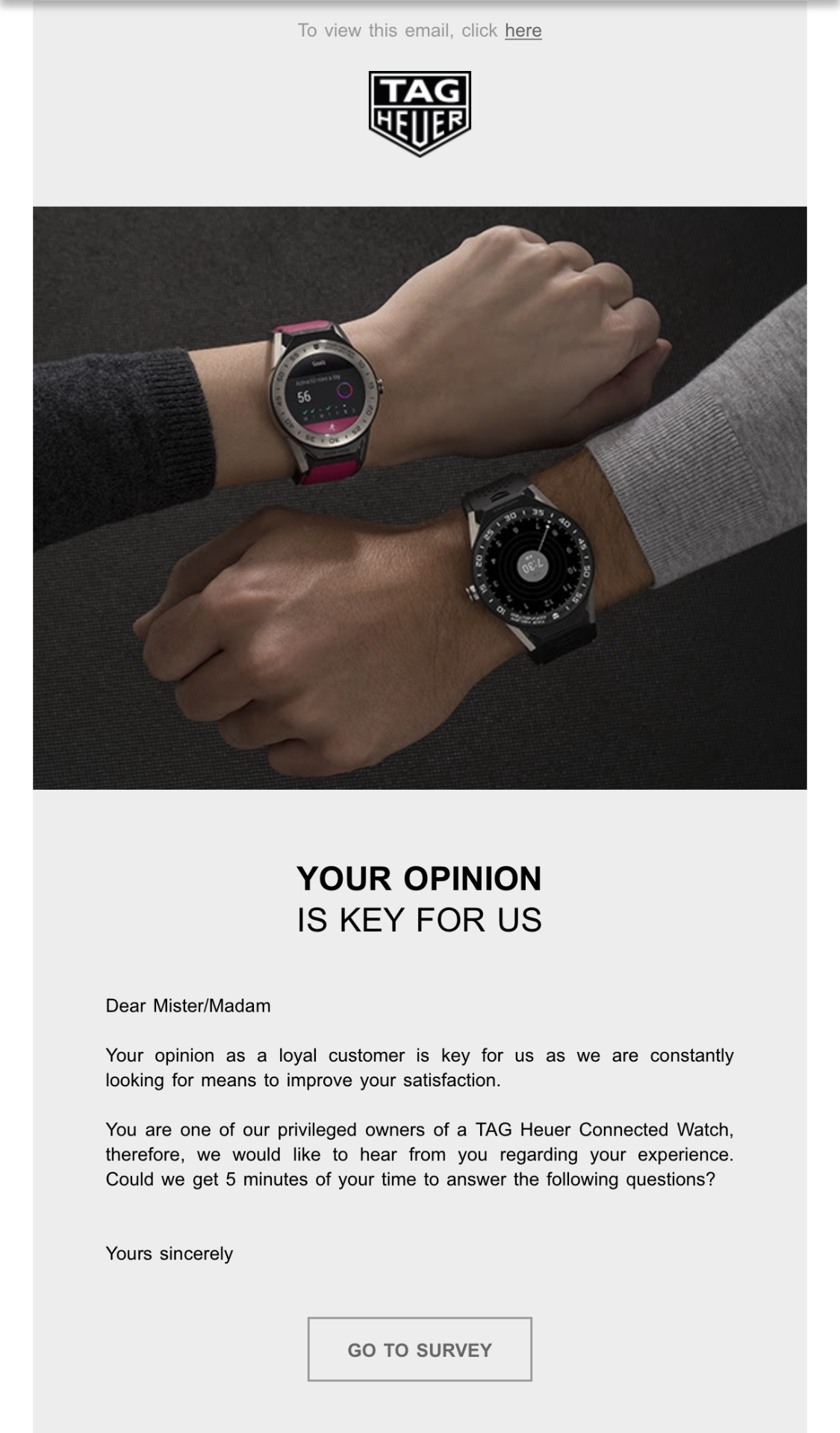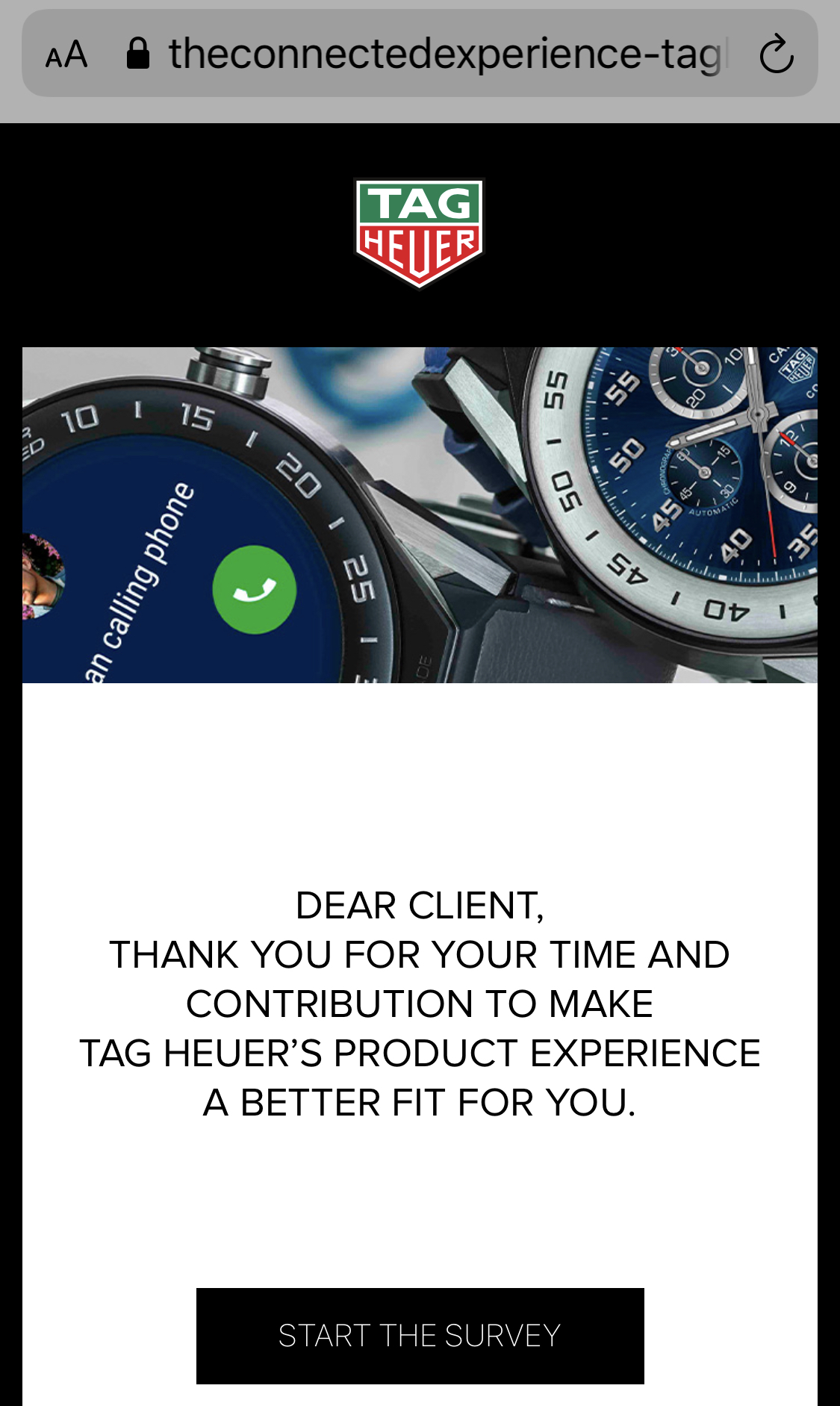 ·I got this in my mailbox today, a survey from Tag Heuer to talk about my experience with the Connected. Not posting the link as it has my email in it, so it is targeted.