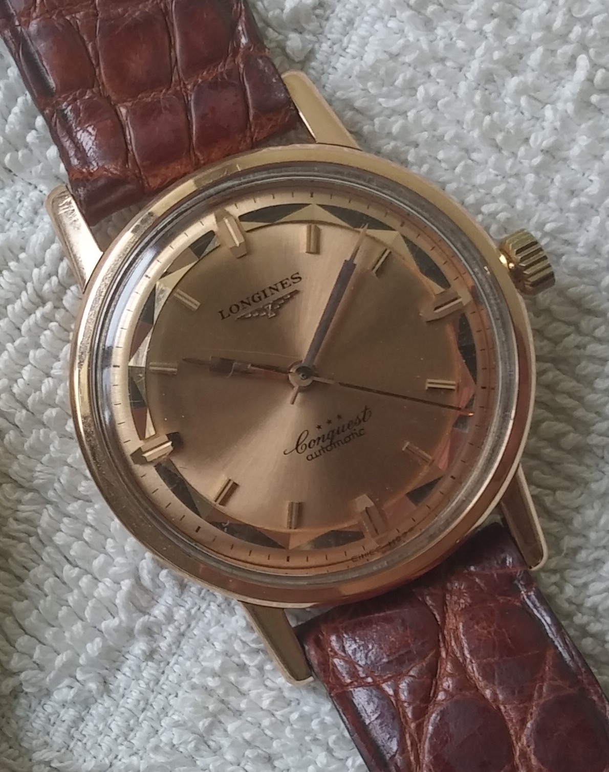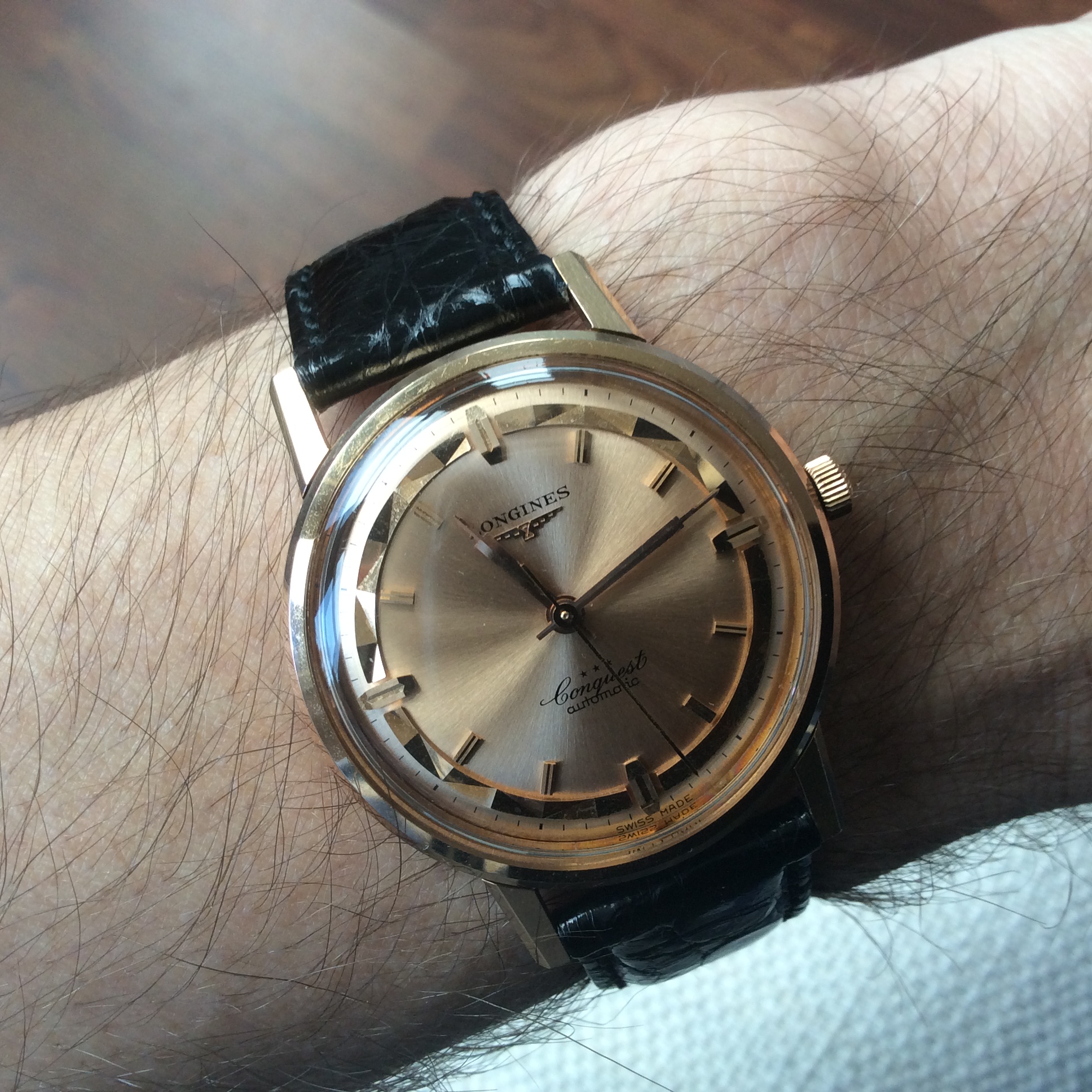 My favourite watch - by far - is my 1956 Omega Constellation pie pan in 18K gold. I just love how the many facets reflect the light. It has a very sturdy feel to it. Last week a competitor arrived: The Longines Conquest Deluxe in pink gold. Is it able to give my dearly beloved Connie a run for its money?