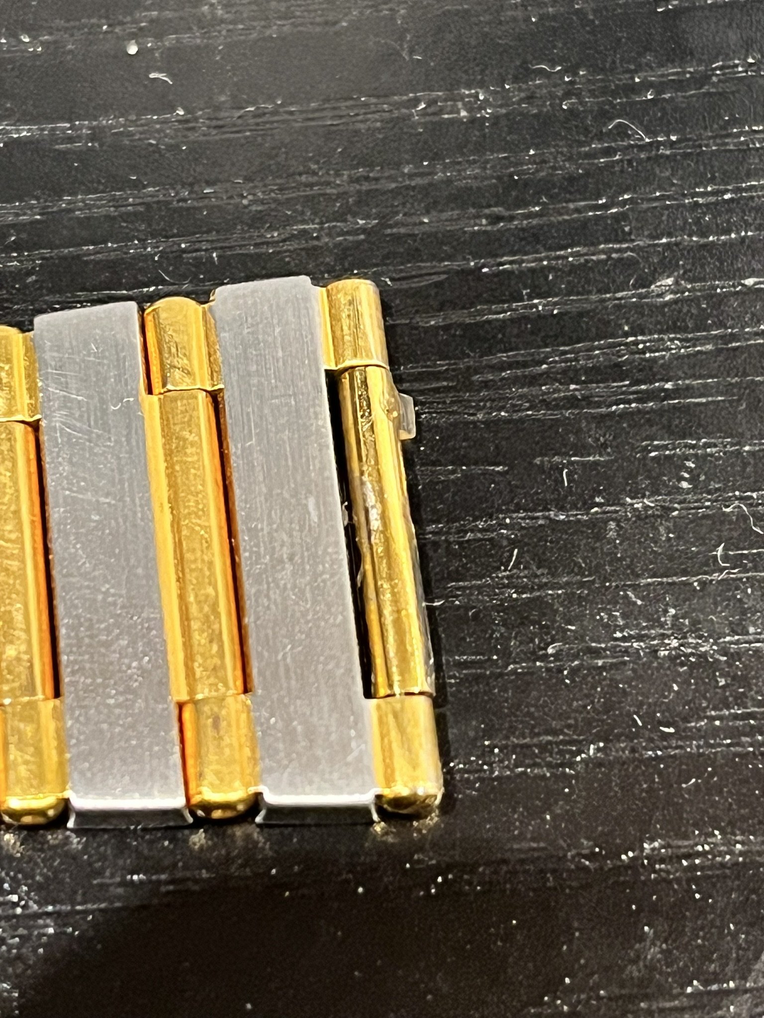 I have a similar watch. From memory, there is an attachment on the watch case onto which the (gold) centre tube slides, a pin then slides through that to fix the two end bits. It looks like the attachment has come off the watch case and someone has tried glue to fix the centre piece back on...which probably won't work.