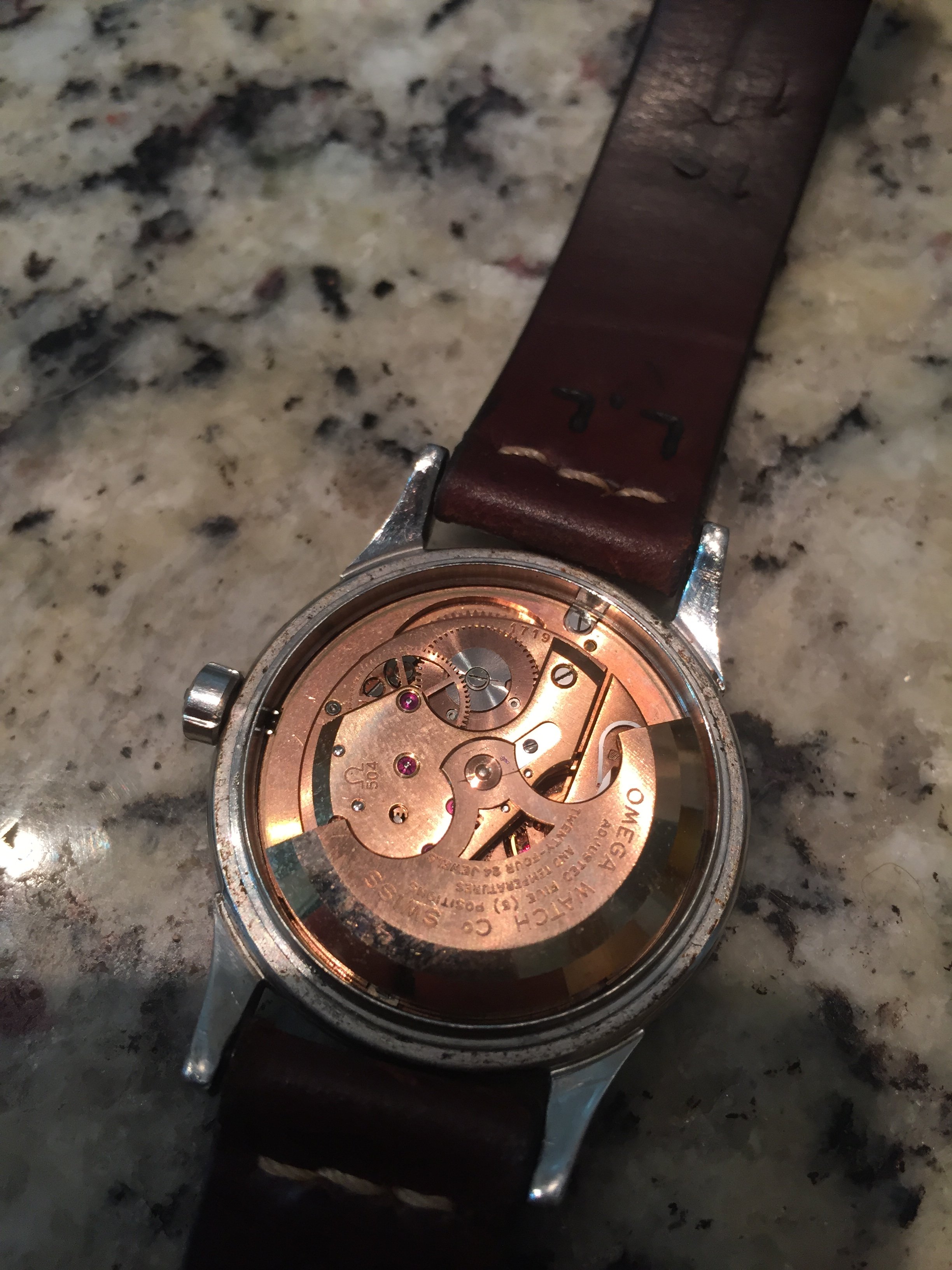Movement: a clean cal. 504. It has not been serviced in my possession but it keeps time and date changes as it should.