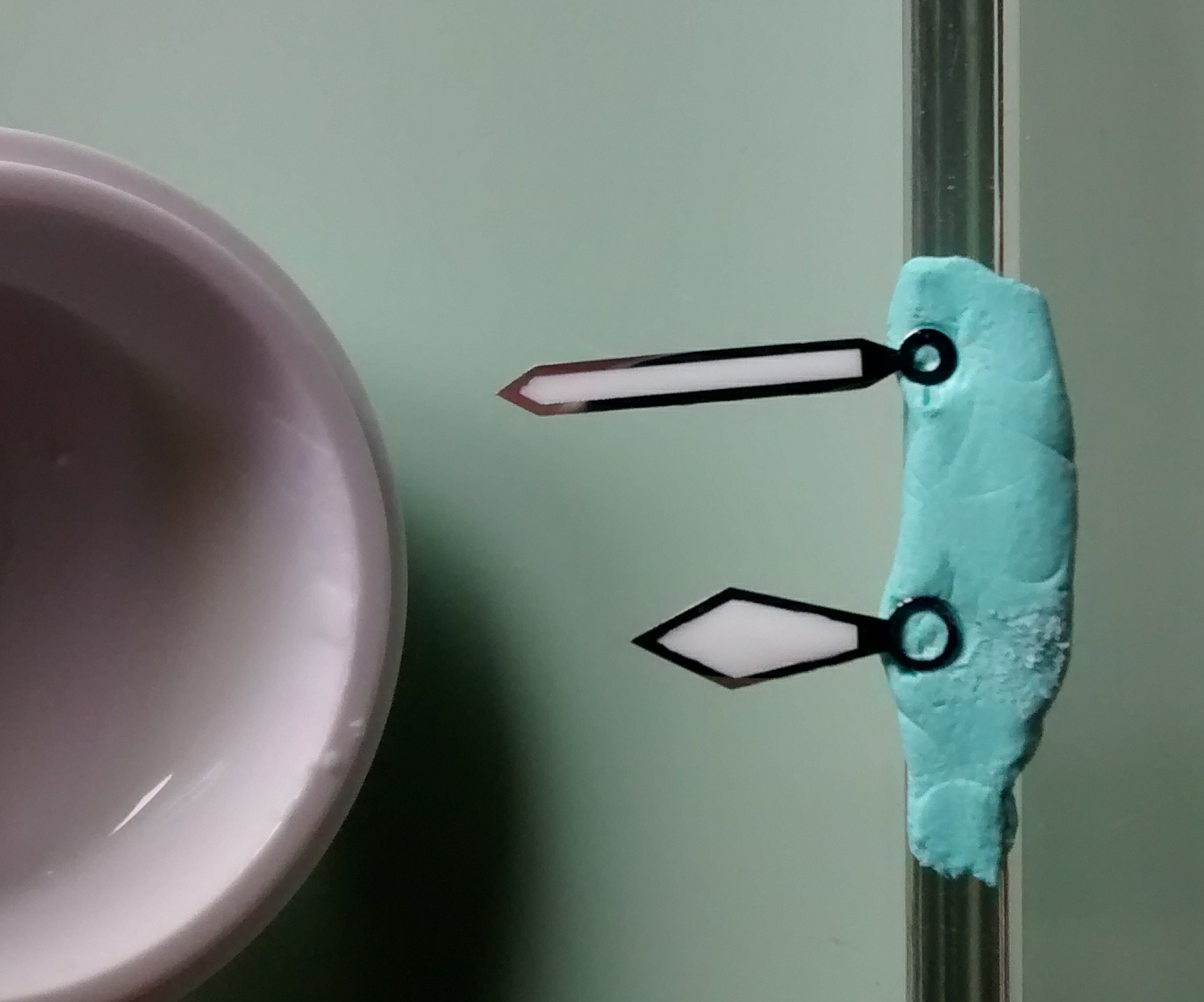 Removed the hands and then cleaned out the existing lume. This is not subtle and just involves supporting the hand on the back and poking the lume out with an oiler or screwdriver, then going over it to ensure all existing lume is removed. The lume will scratch the hands so have to be careful when turning over and laying face down.