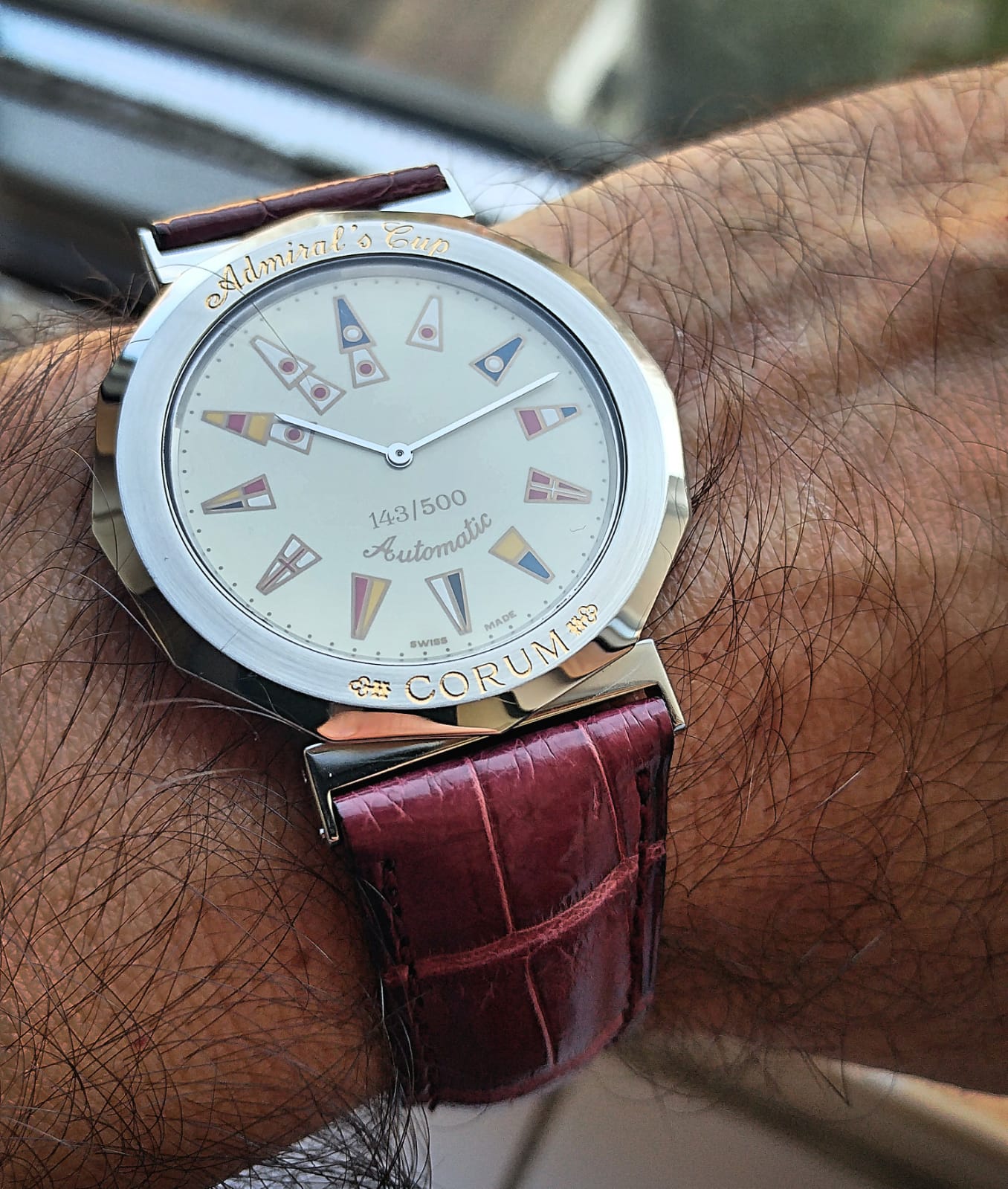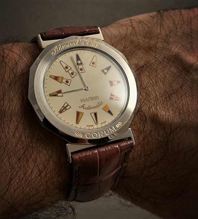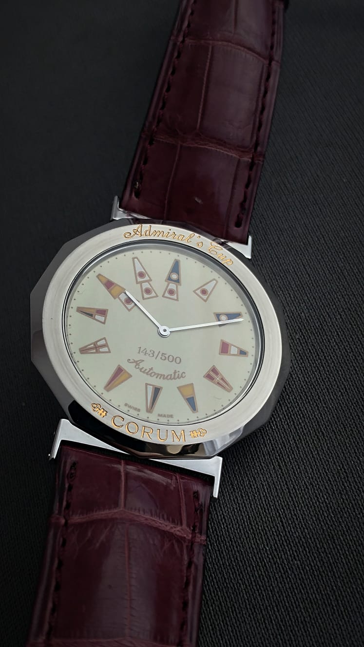 Dodecagonal shaped case.. Lacquered cream dial, with nautical flags markers.. semi-flexible lugs.. undoubtedly an unmistakable Corum design!