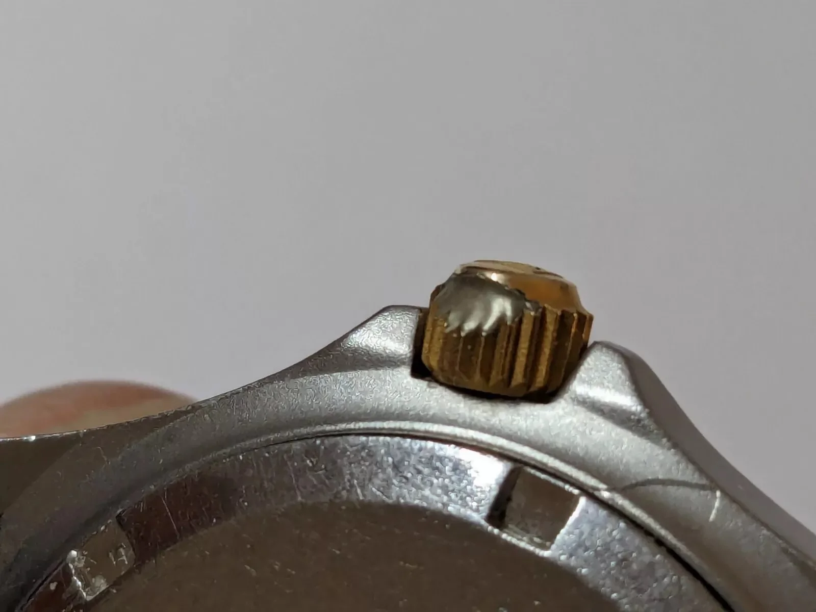 ·I've seen this on more than a few older watches, mostly on the 2000 series. The crown is gouged or filed down. Anybody know what causes this? I doubt anyone would intentionally file it. Could this happen from contact with the skin, over many years? The pic is from an ebay auction but I have a 2000 series watch with the same gouge. Strange.