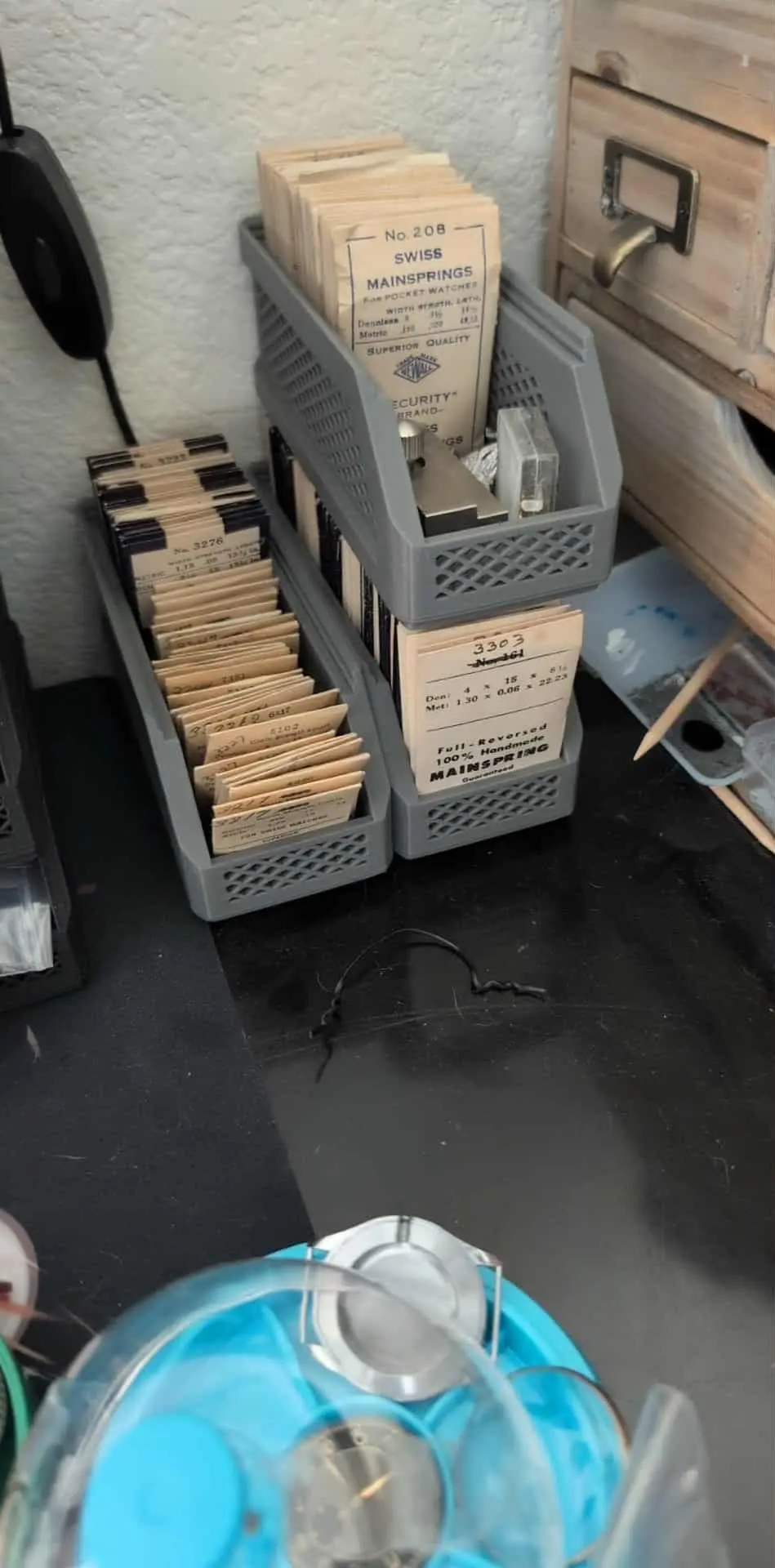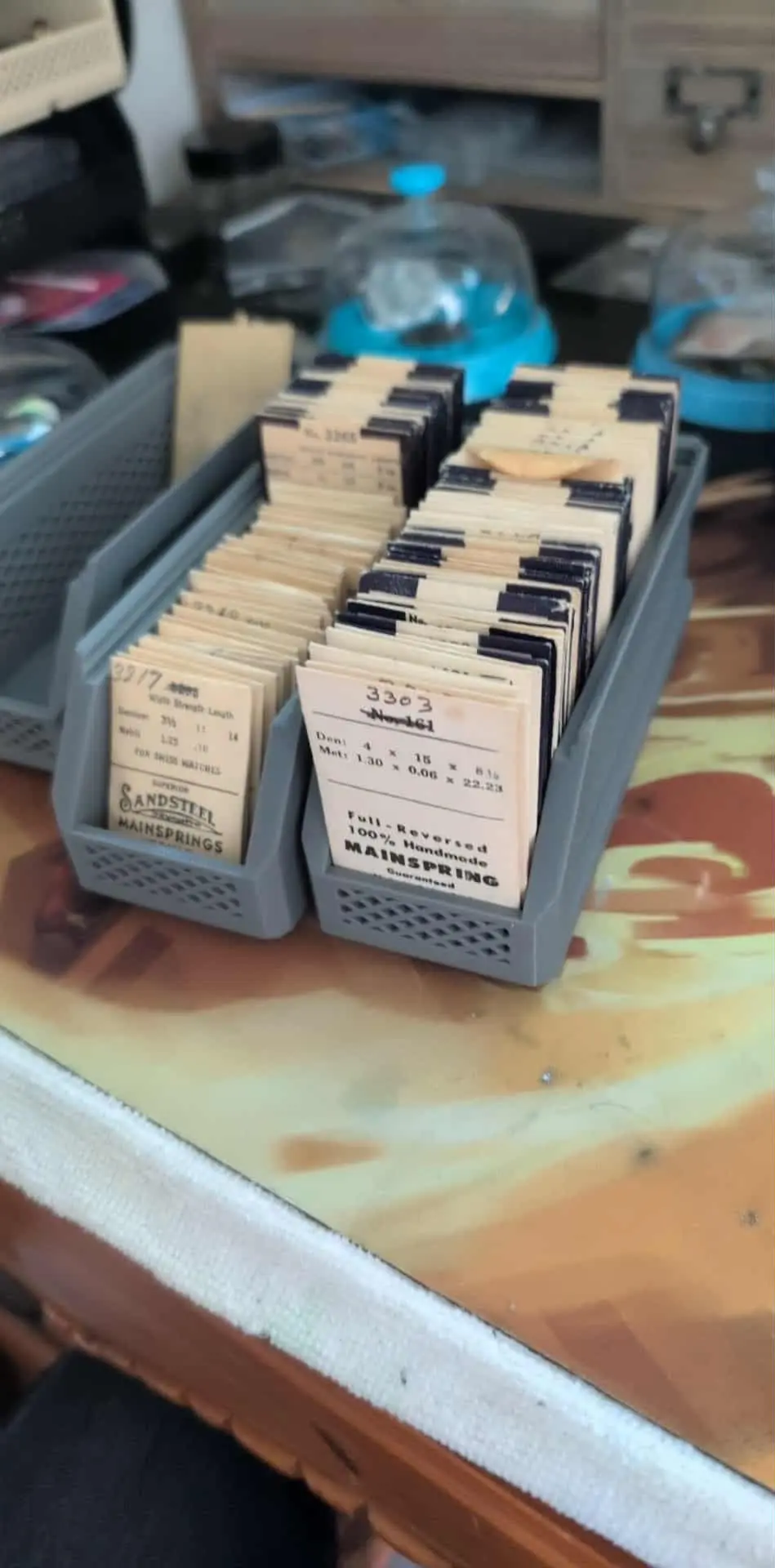 ยทHey everyone, I used to do 3D printing and some modeling as a side hustle. I brought that over to my watch repair as well. With that I brought over a storage idea I wanted to extend to you all. I'll charge materials and shipping and can make as many as you'd like and also adjust the sizing if you wanted to change anything. If this is something you'd all be interested or stuff like this, let me know. Current configuration holds about 50 mainspring packages.