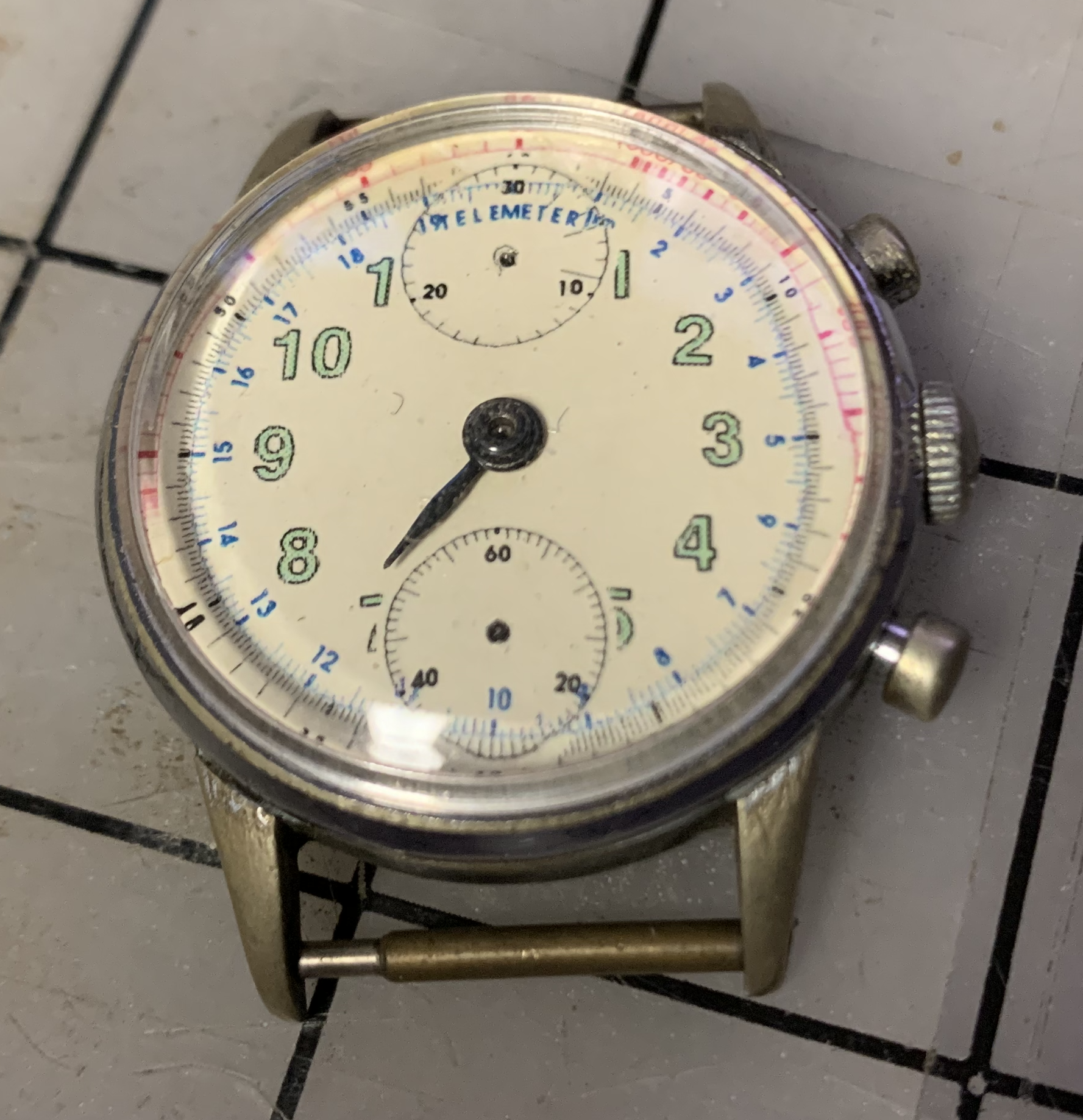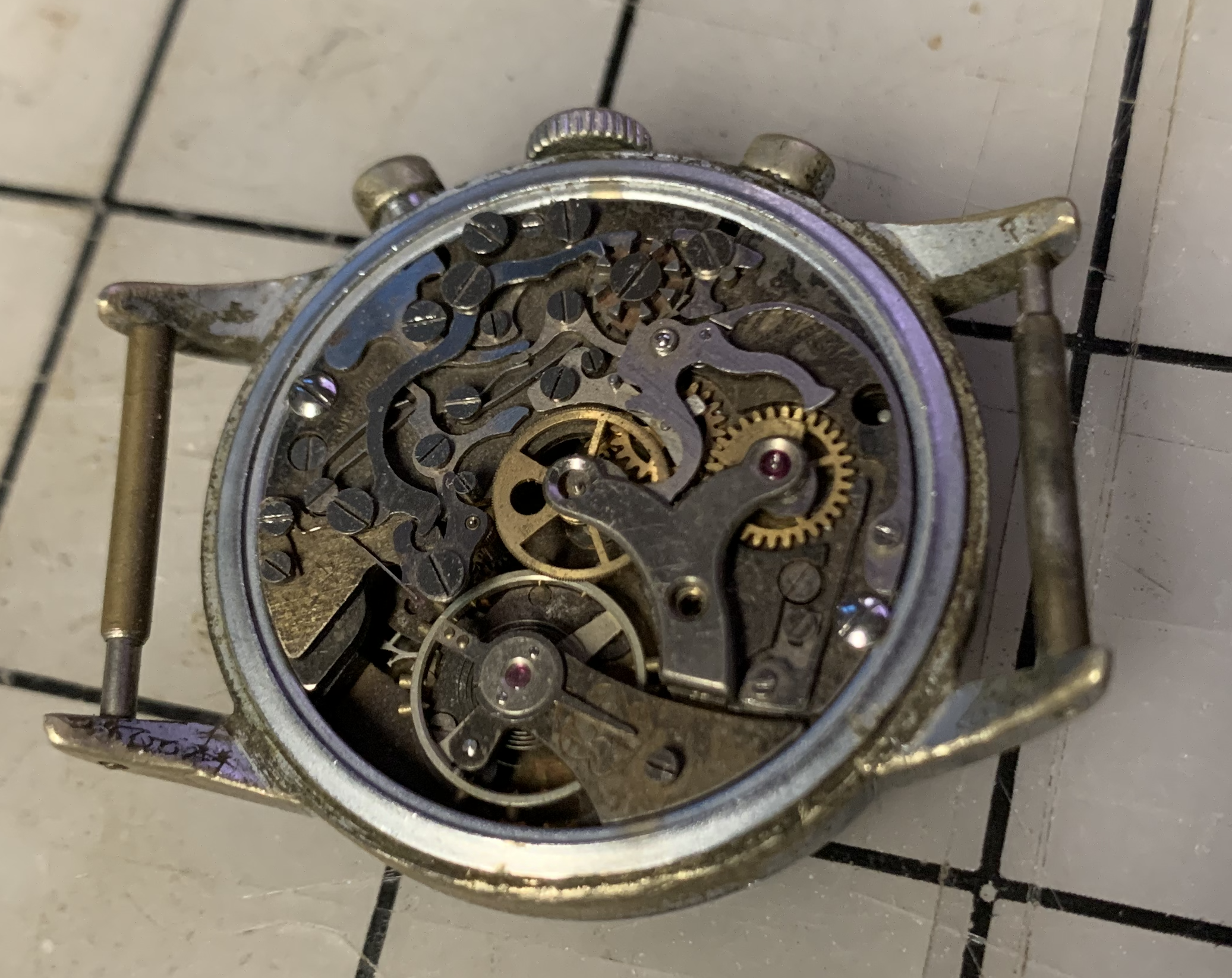 Here is the shot of the backside. I do not know if I have the back or not. It is probably the back in in a box somewhere. Also not sure why there is only one hand. I have quite a hand collection, perhaps there were not chronograph hands that fit.