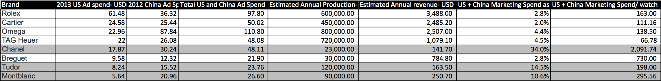 Let's ignore Chanel, Tudor and Montblanc, who are outliers for various reasons (Chanel I suspect includes non-watch advertising; Tudor was relaunching during this period and so it's not a normalised level of spend; Montblanc is likely either includes non-watch spend, or shows the massive investment in China of launching the brand as a watch company).