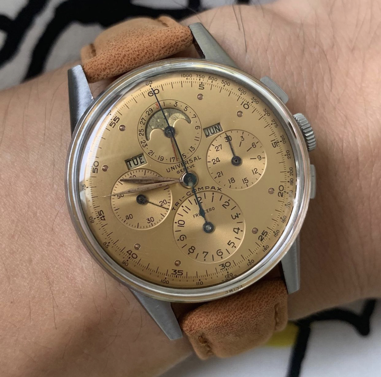 Posts 6,273 Likes 9,833 Mark020 ·Sep 29, 2021·not the sharpest pencil in the ΩF drawer And another - poor - one: https://www.worthpoint.com/worthopedia/universal-geneve-tricompax-cal-481-1928631930