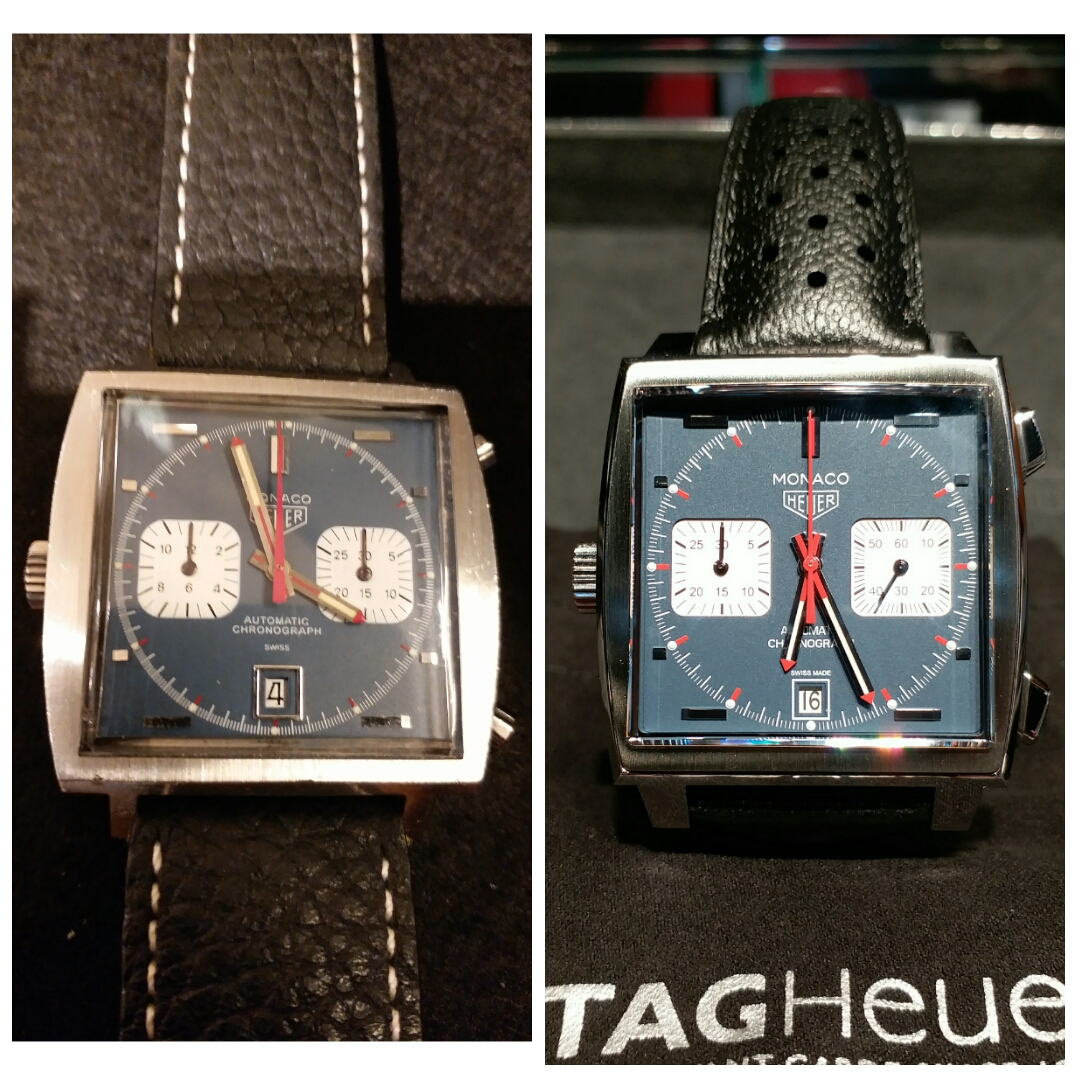路I knew about it, seen it on books, posters, websites, and on May 17, I came face to face with the holy grail Monaco, the authentic 1133B and for sale. Holding it, heart beat pounding, too good to part and quickly settled the deal and taking him home. For a 45 years old "gentleman", he's still shine and sought after worldwide. Less than a month ago, I bought the reissue McQueen, sitting next to each other, both are a part of Heuer history... Next week, I am getting another piece of Heuer history, a 1972 Heuer Silverstone to share with Calibre 11 members...