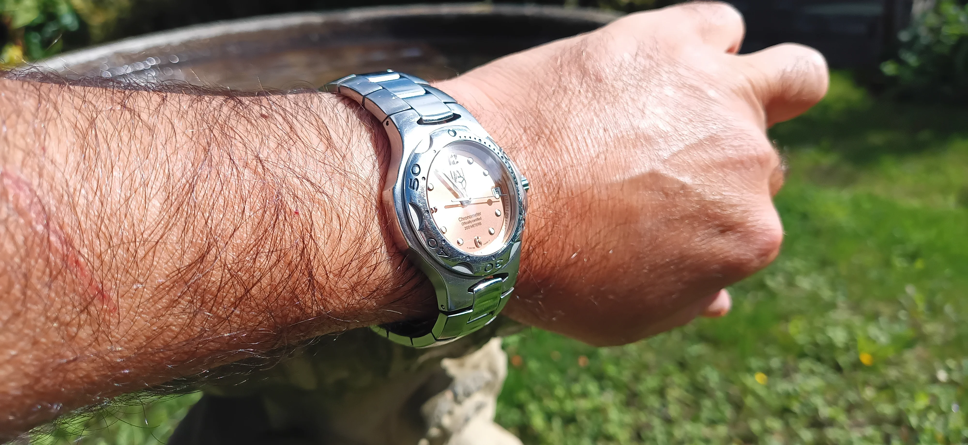It's a little "aged" : the bracelet and bezel are both showing scratches all over, which I know will affect value for others, but it doesn't both me. I believe objects that are designed to be used should be used and to me the scratches are history and experiences.