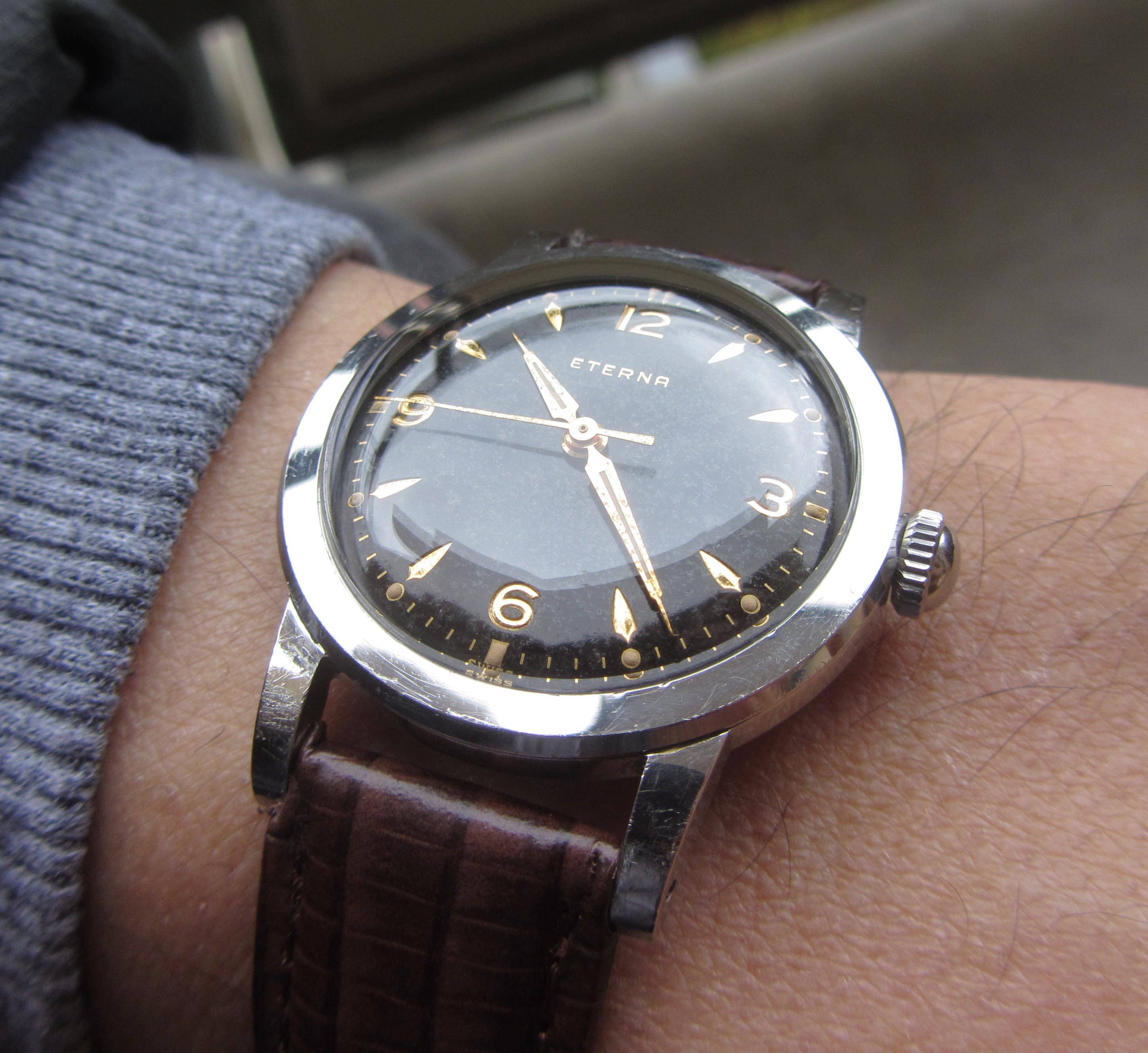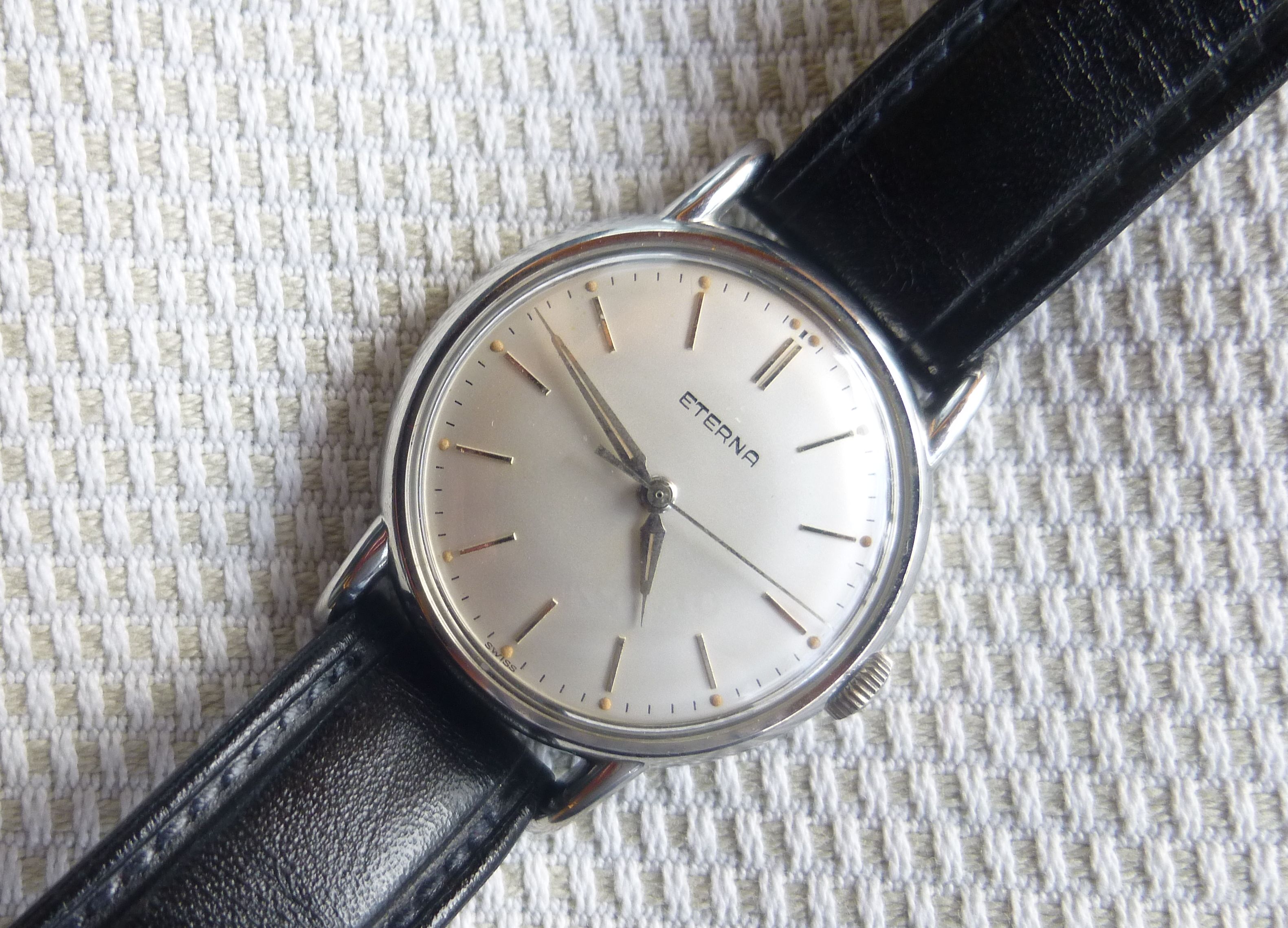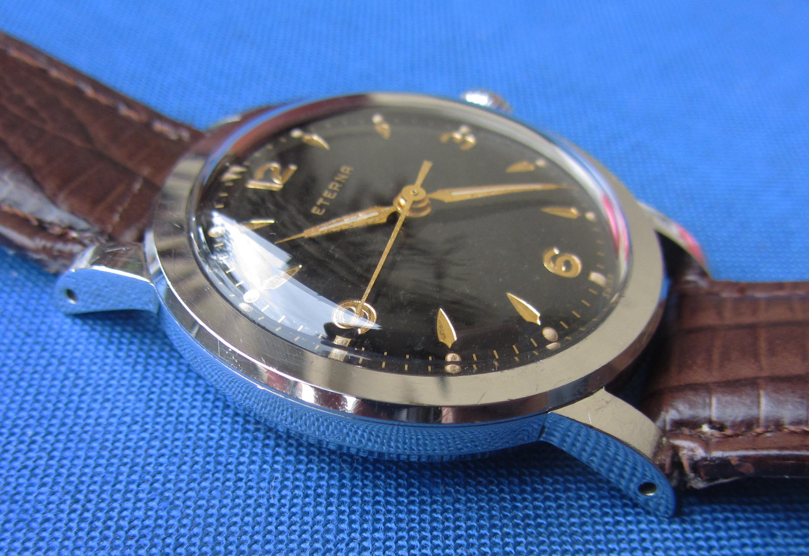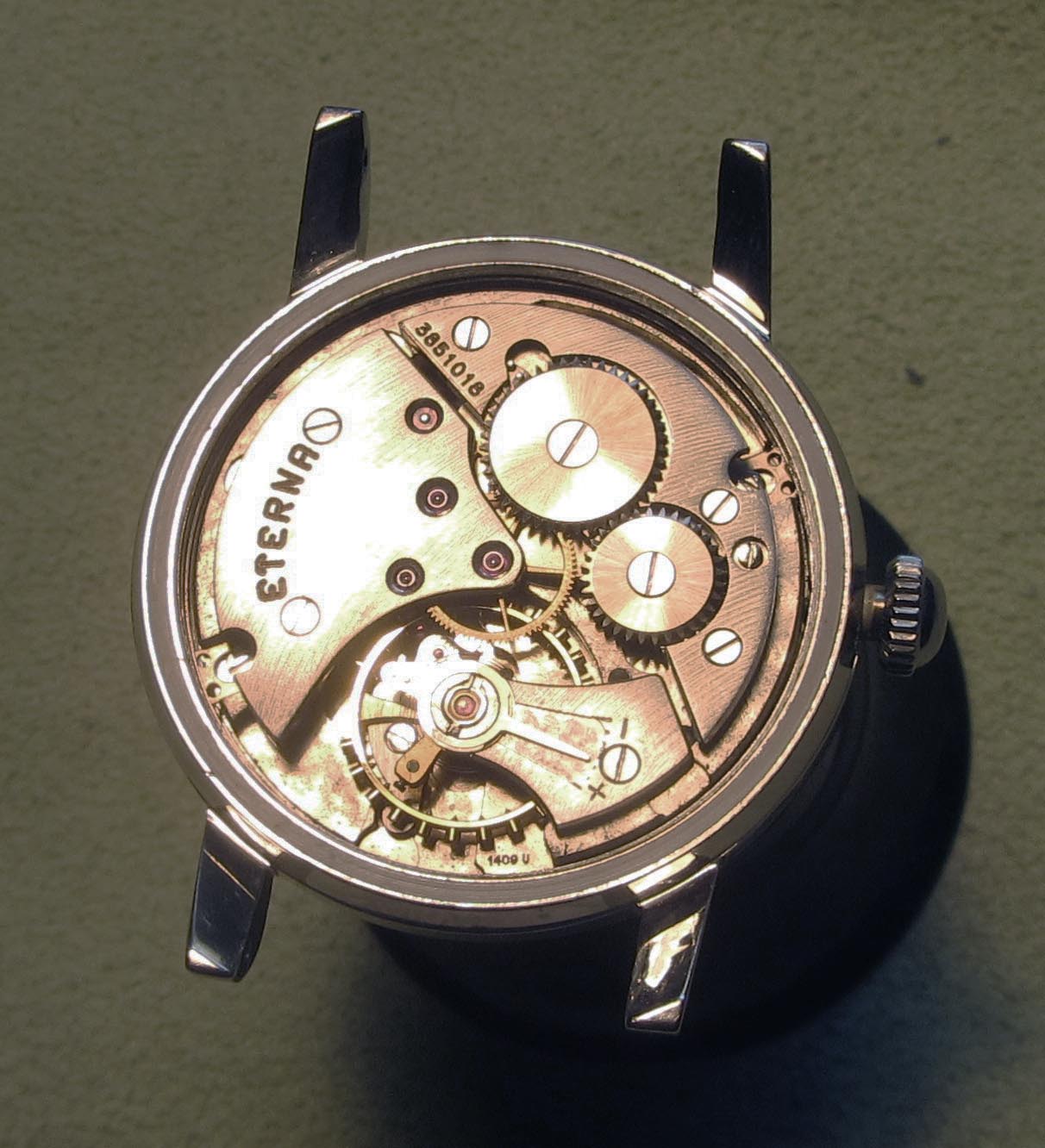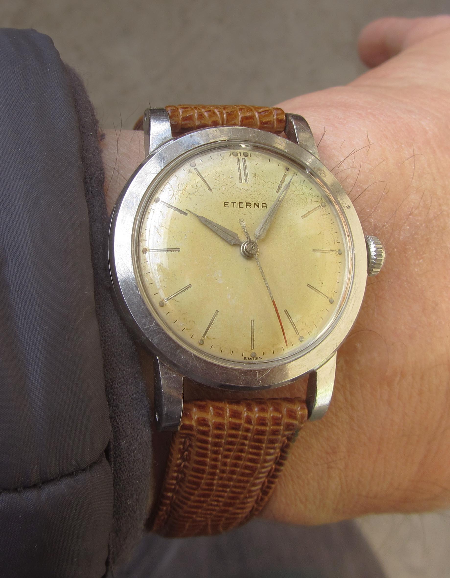 ·...just for entertainment, my "new" Eterna from 1954/55. Actually a "small one" with only 33.2mm (you fight for every tenth!) case diameter, but I haven't been so happy about a watch for a long time. I guess nobody polished it, the dial and the hands have some patina. Inside, the 1409U, 12.5", thus relatively large and with some Zenith 135 appeal, still with a screw balance and nicely decorated. As a bonus, there was a buckle that fits quite well, even if there is no ball bearing in the 1409U...