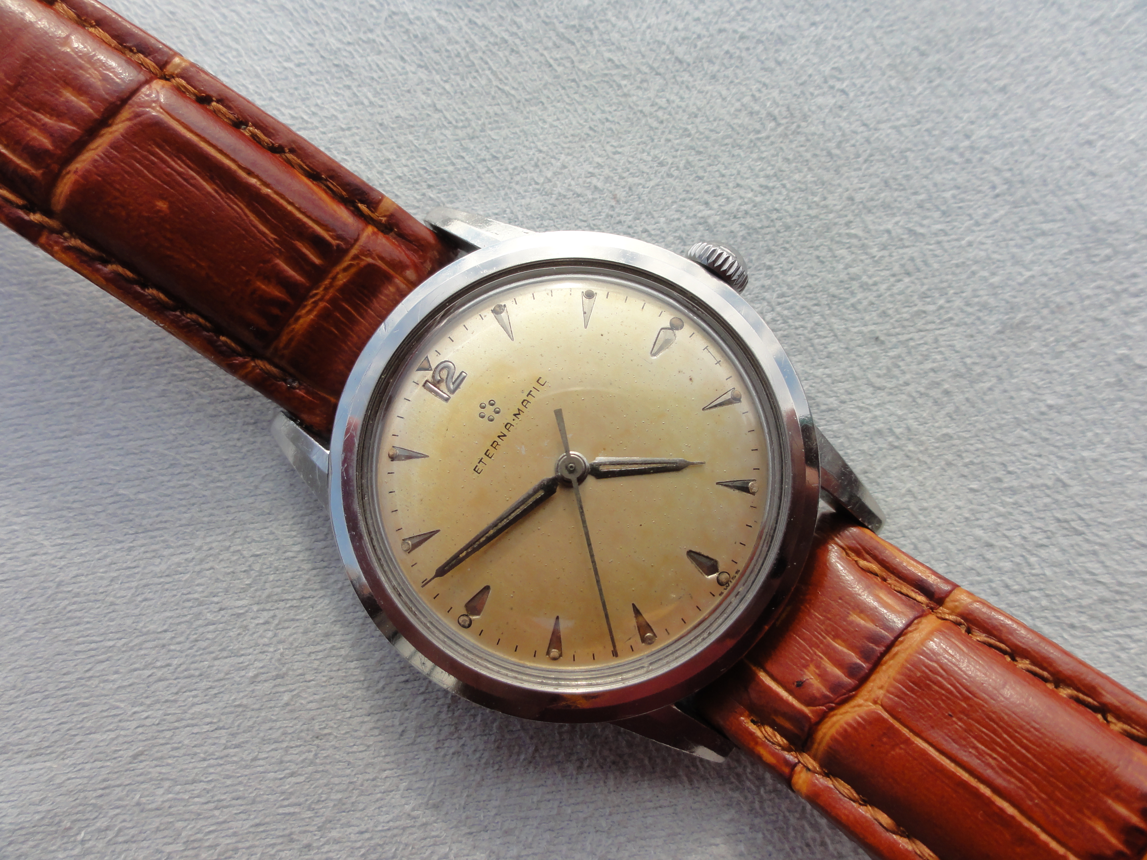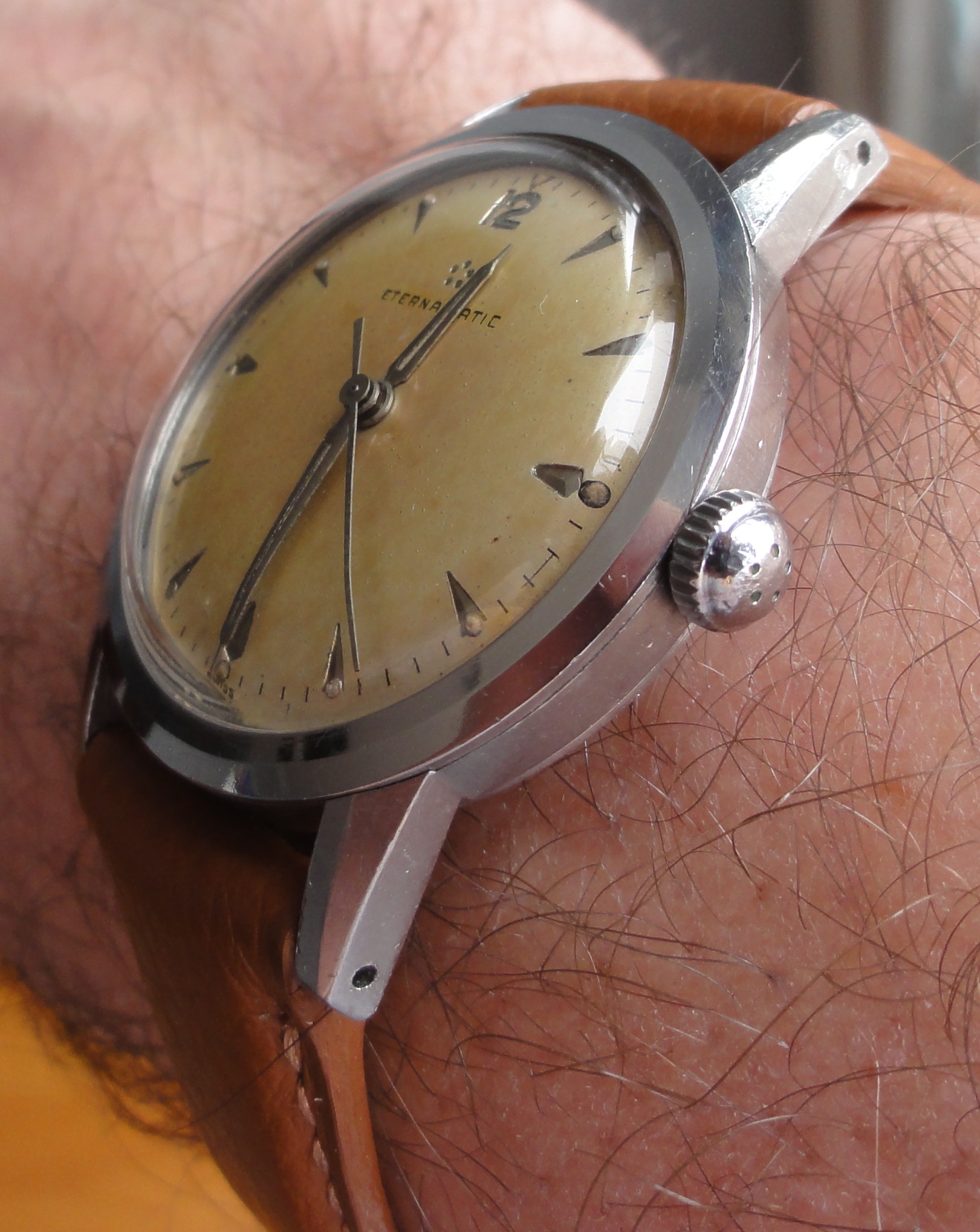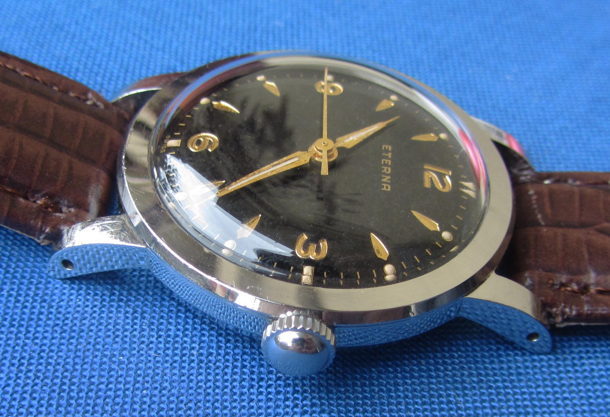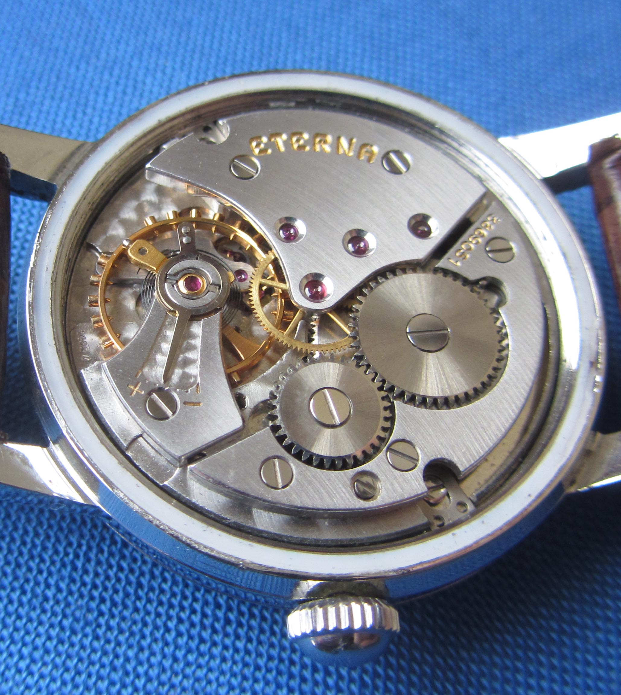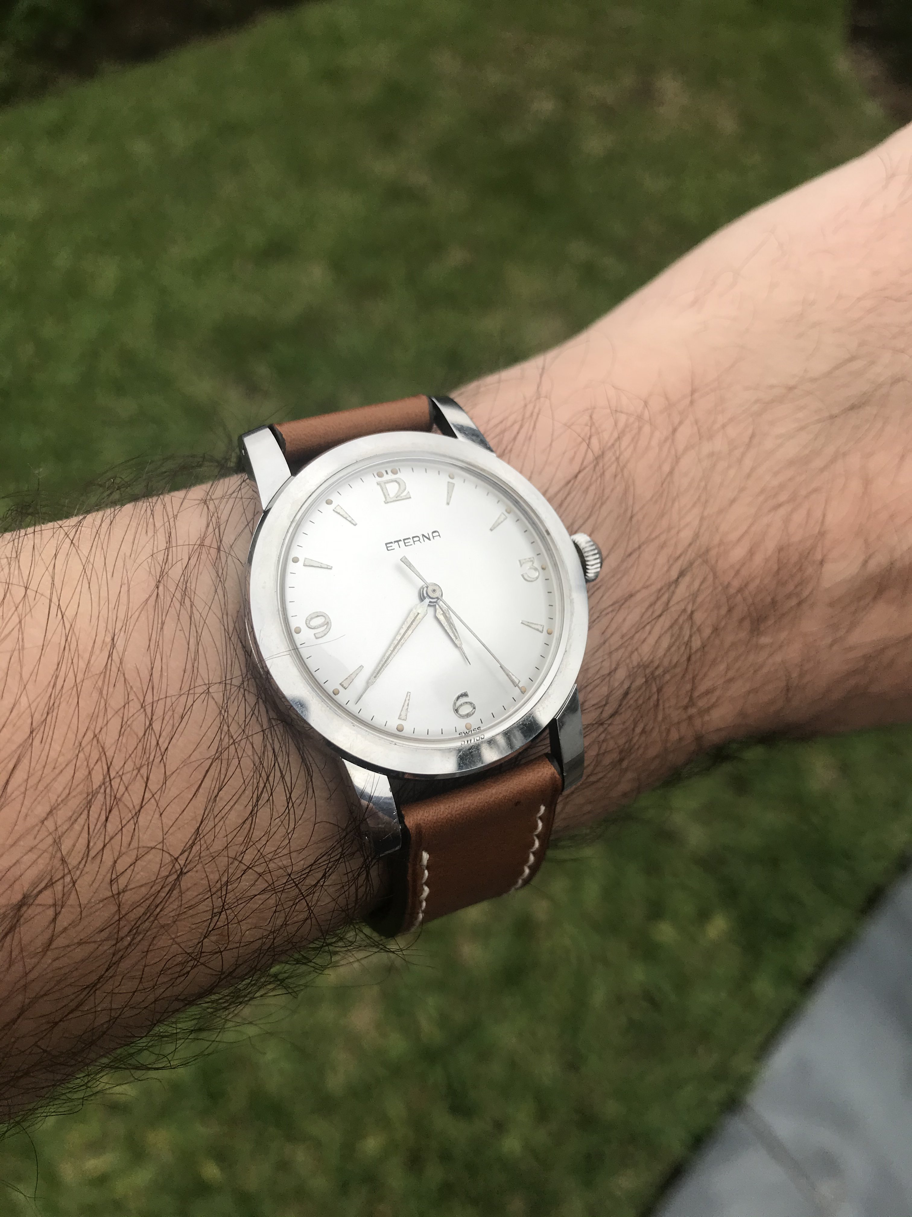 ·...just for entertainment, my "new" Eterna from 1954/55. Actually a "small one" with only 33.2mm (you fight for every tenth!) case diameter, but I haven't been so happy about a watch for a long time. I guess nobody polished it, the dial and the hands have some patina. Inside, the 1409U, 12.5", thus relatively large and with some Zenith 135 appeal, still with a screw balance and nicely decorated. As a bonus, there was a buckle that fits quite well, even if there is no ball bearing in the 1409U...