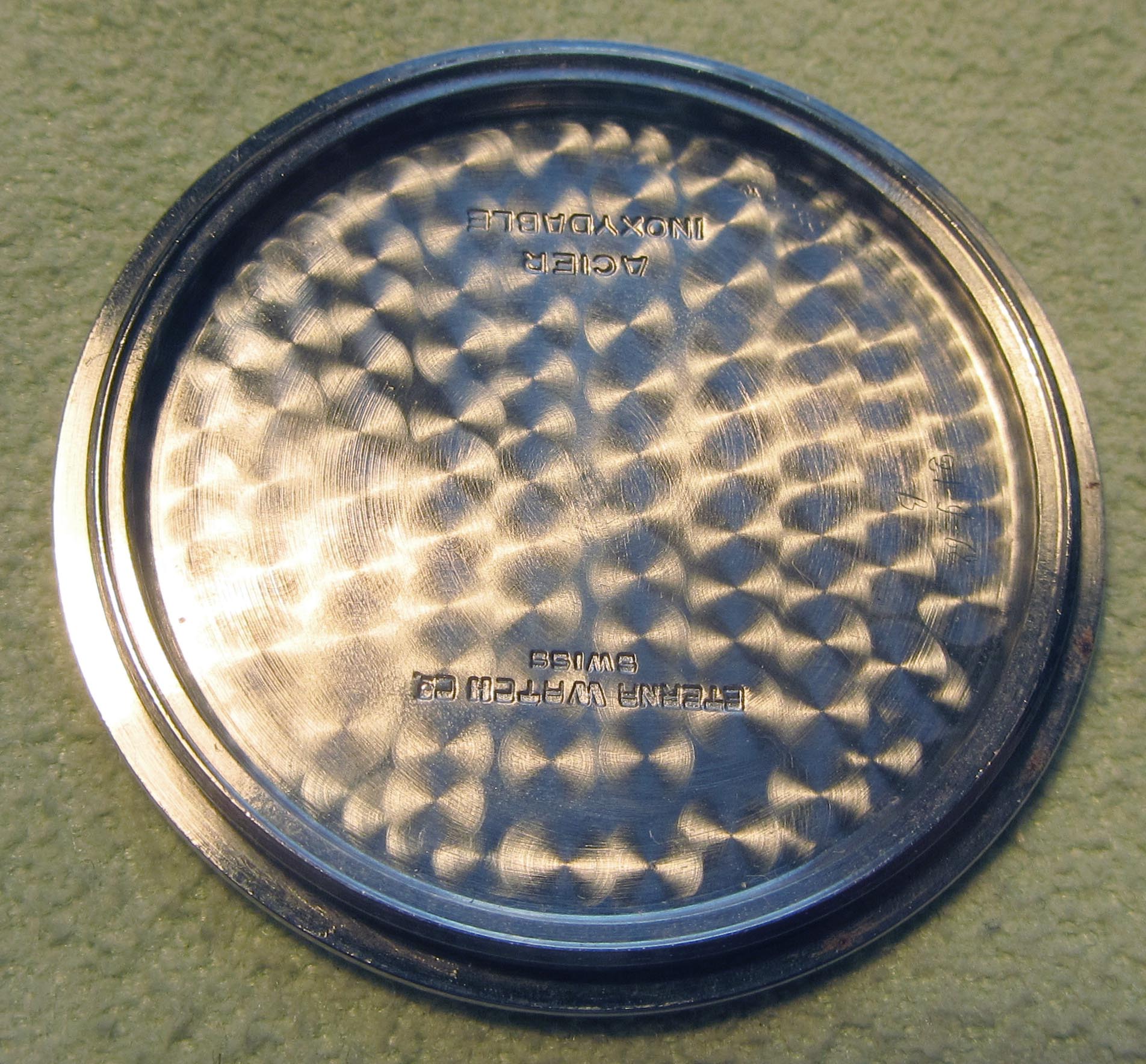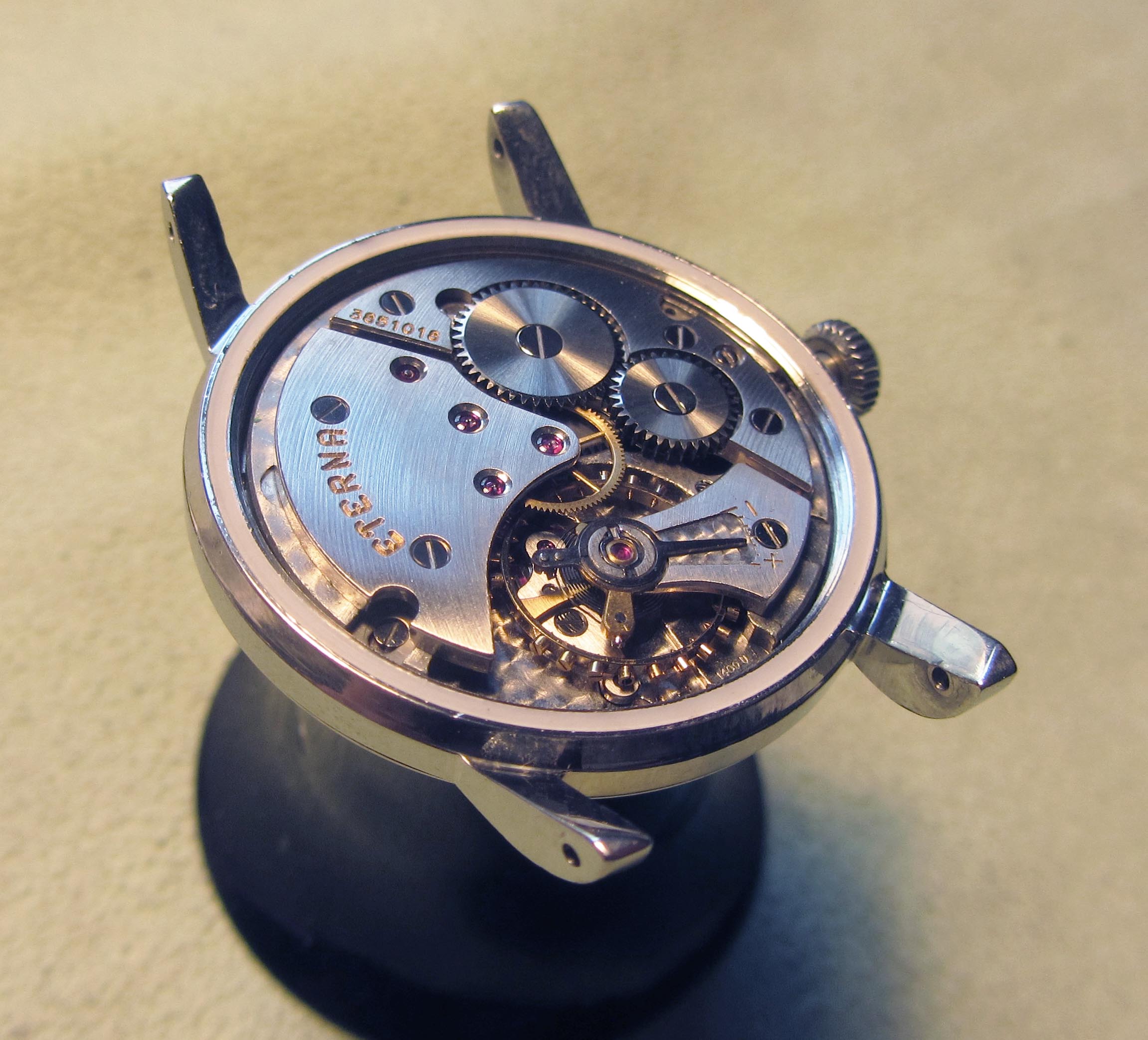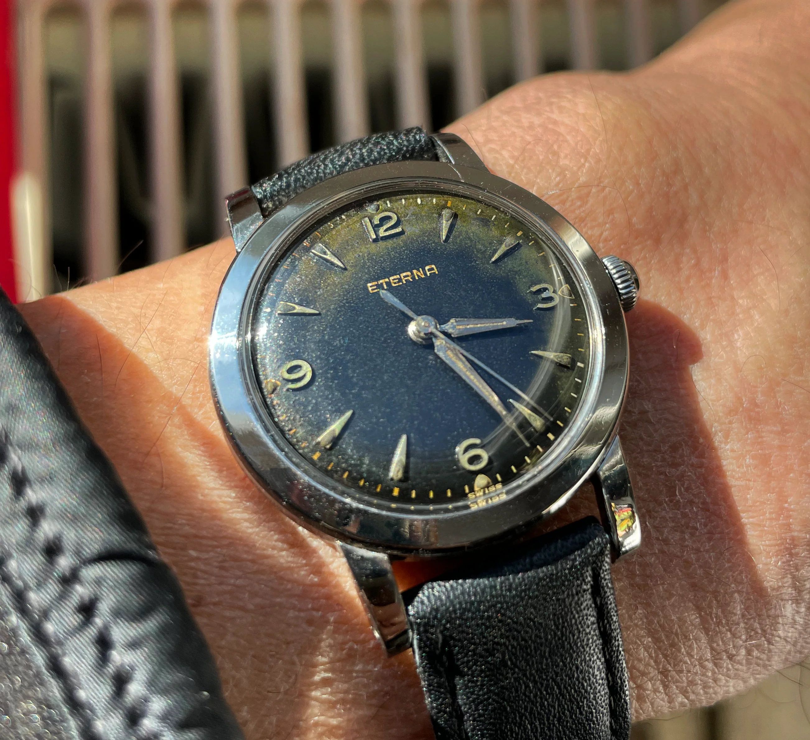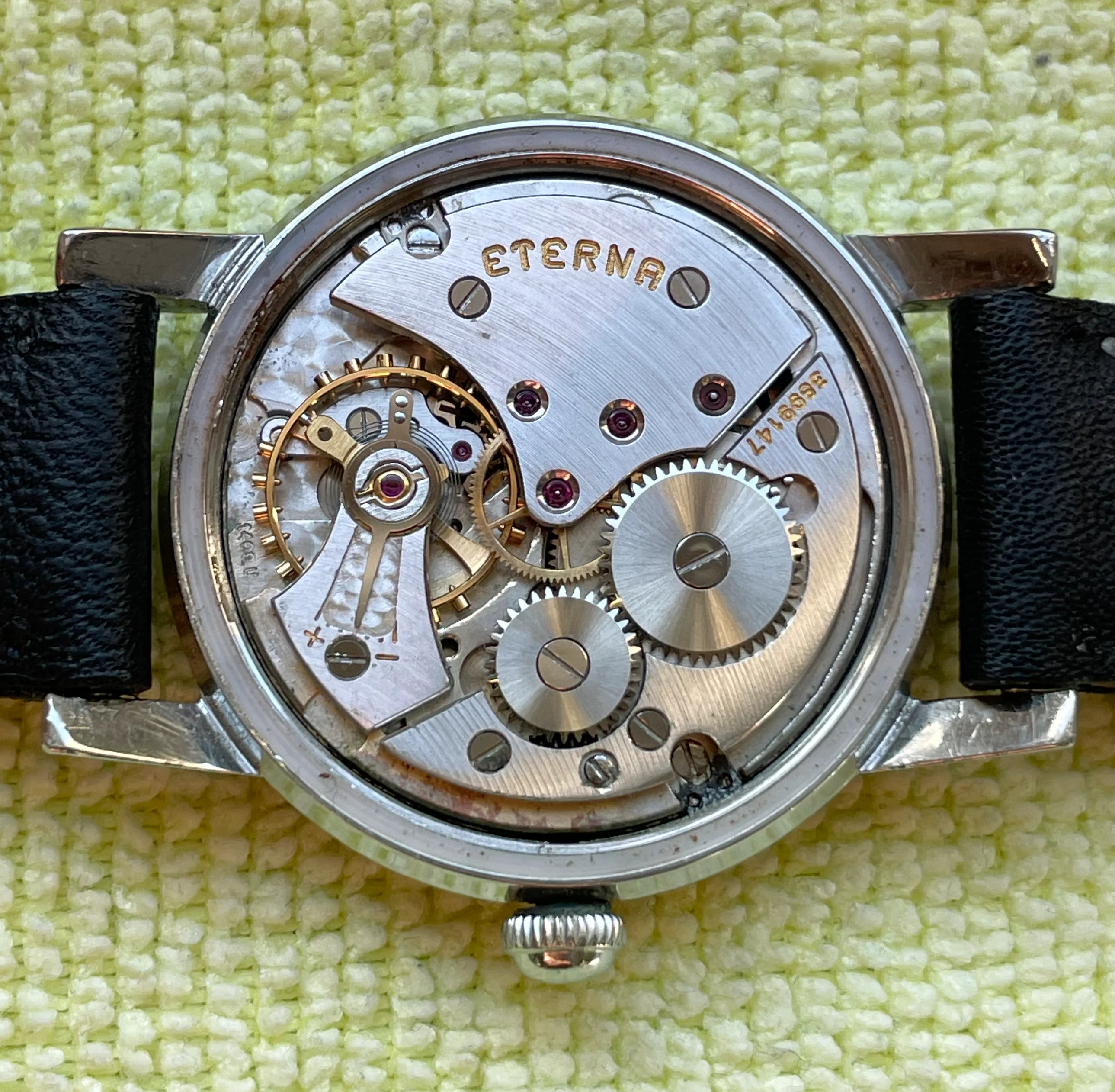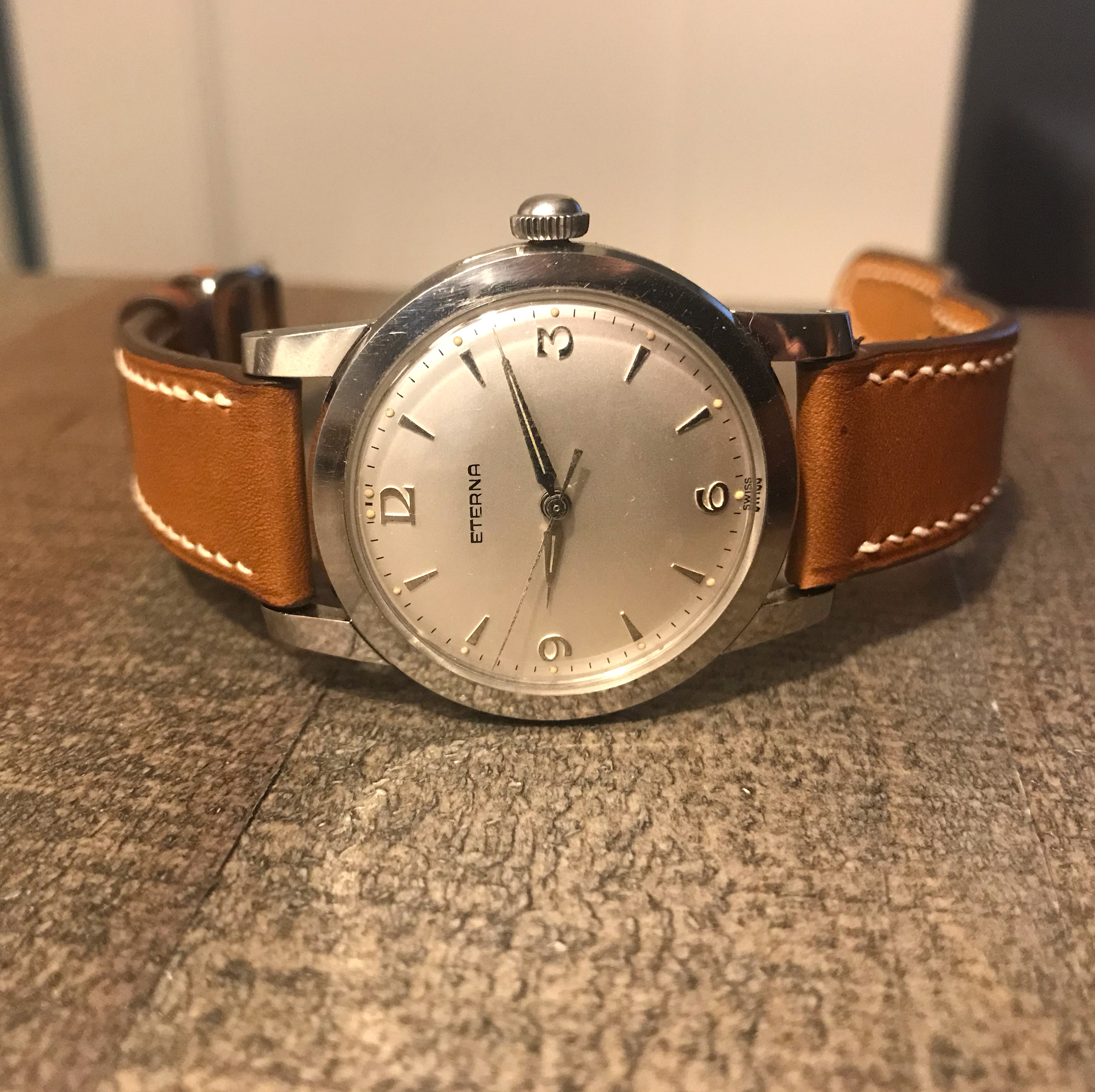 ·...just for entertainment, my "new" Eterna from 1954/55. Actually a "small one" with only 33.2mm (you fight for every tenth!) case diameter, but I haven't been so happy about a watch for a long time. I guess nobody polished it, the dial and the hands have some patina. Inside, the 1409U, 12.5", thus relatively large and with some Zenith 135 appeal, still with a screw balance and nicely decorated. As a bonus, there was a buckle that fits quite well, even if there is no ball bearing in the 1409U...