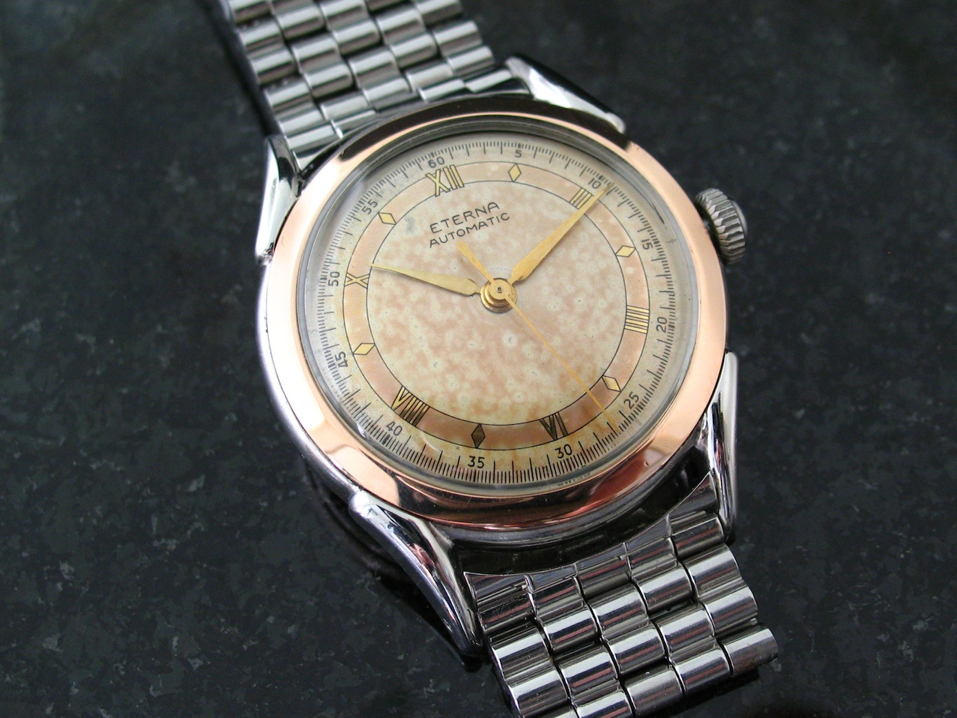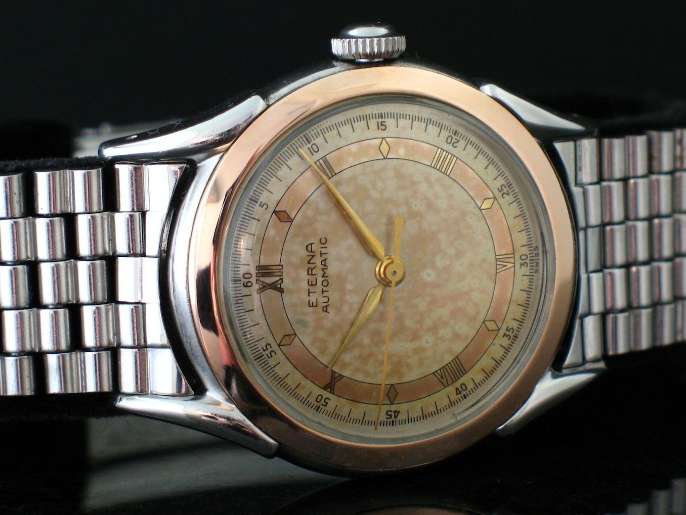 Posts 13,476 Likes 31,745 X350 XJR ·Mar 7, 2013·Vintage Omega Aficionado Recently picked up this cal 1158 H 1940s bumper. Steel with rose gold bezel and amazing original tri-color dial.