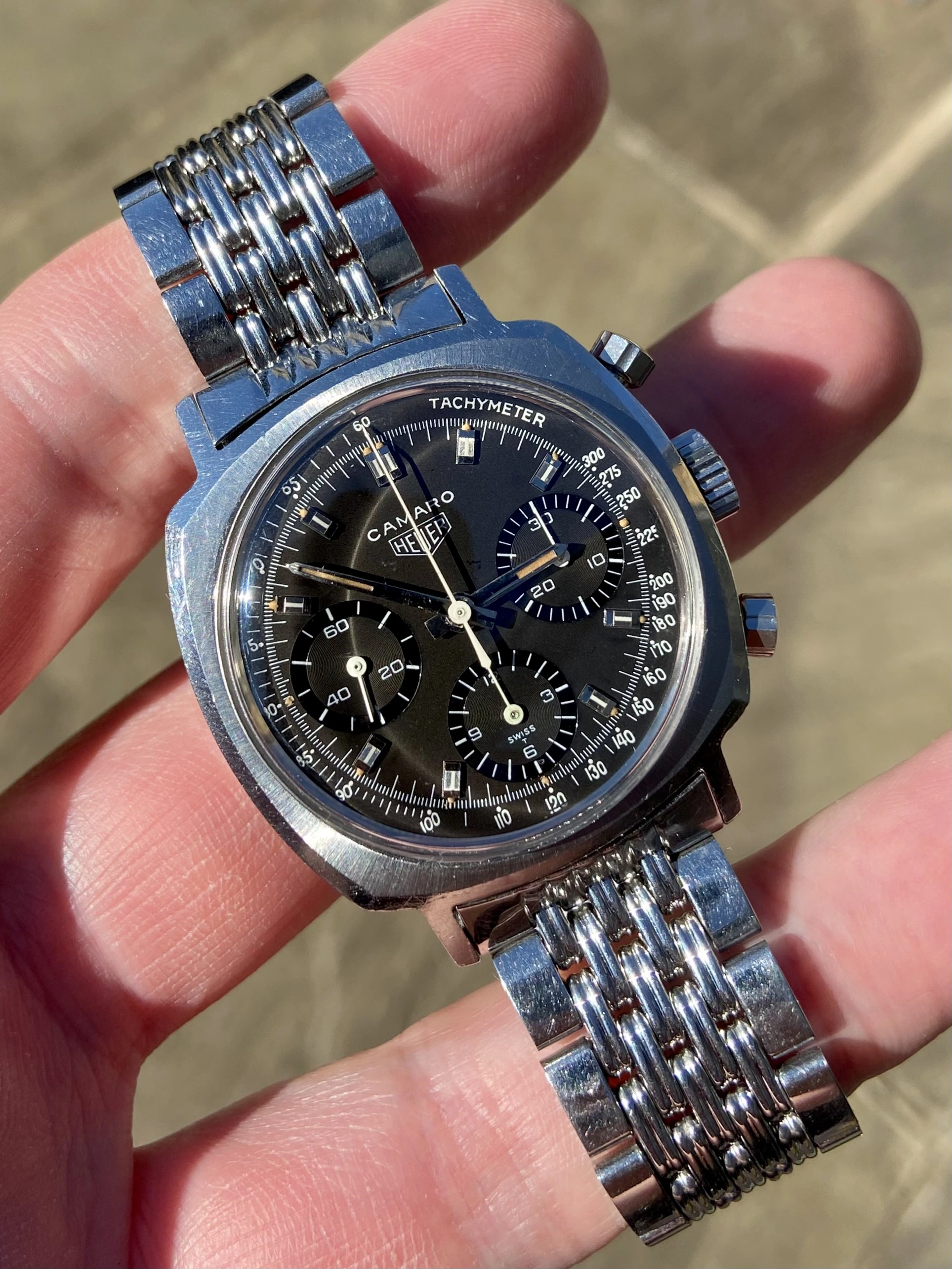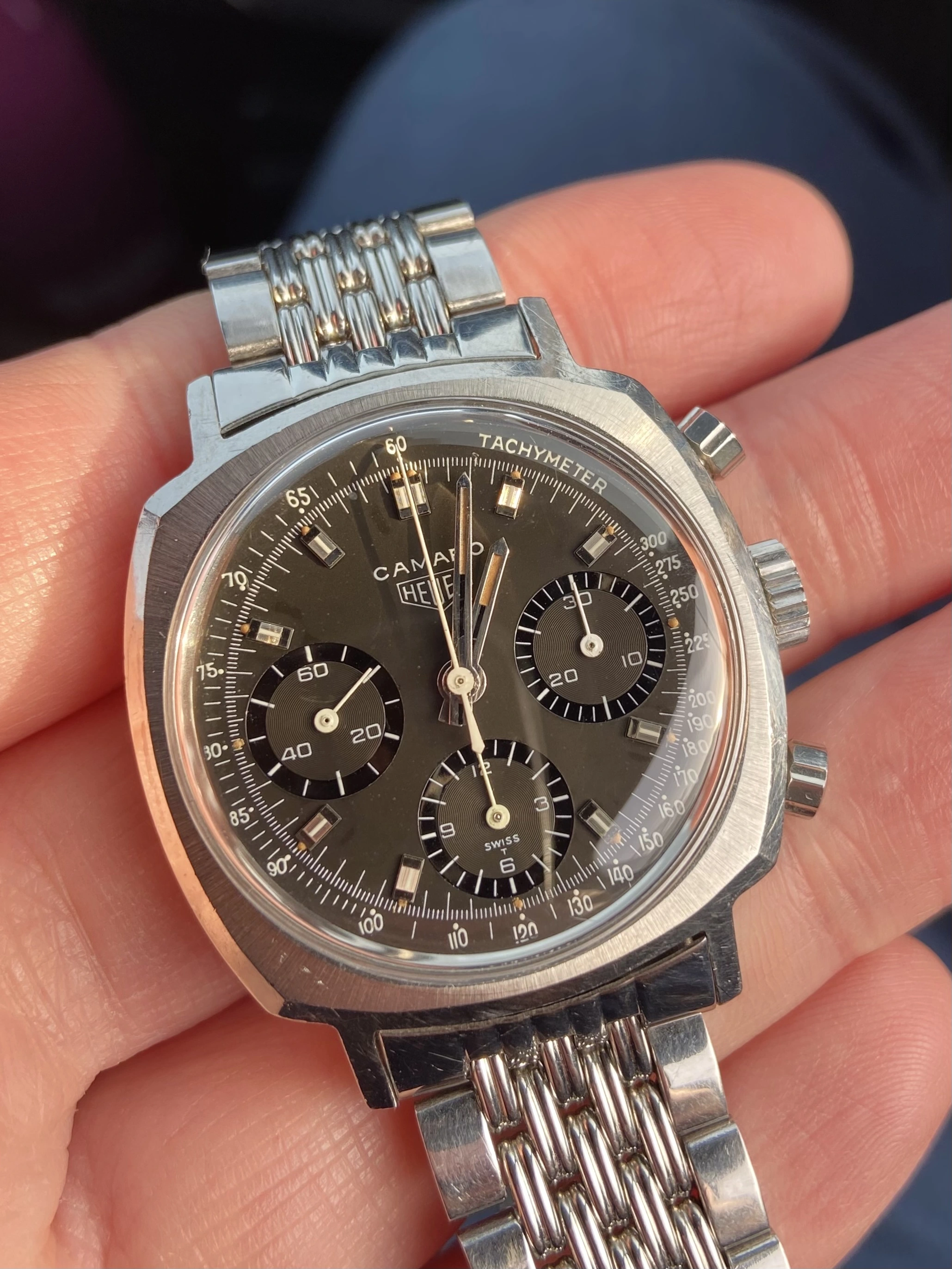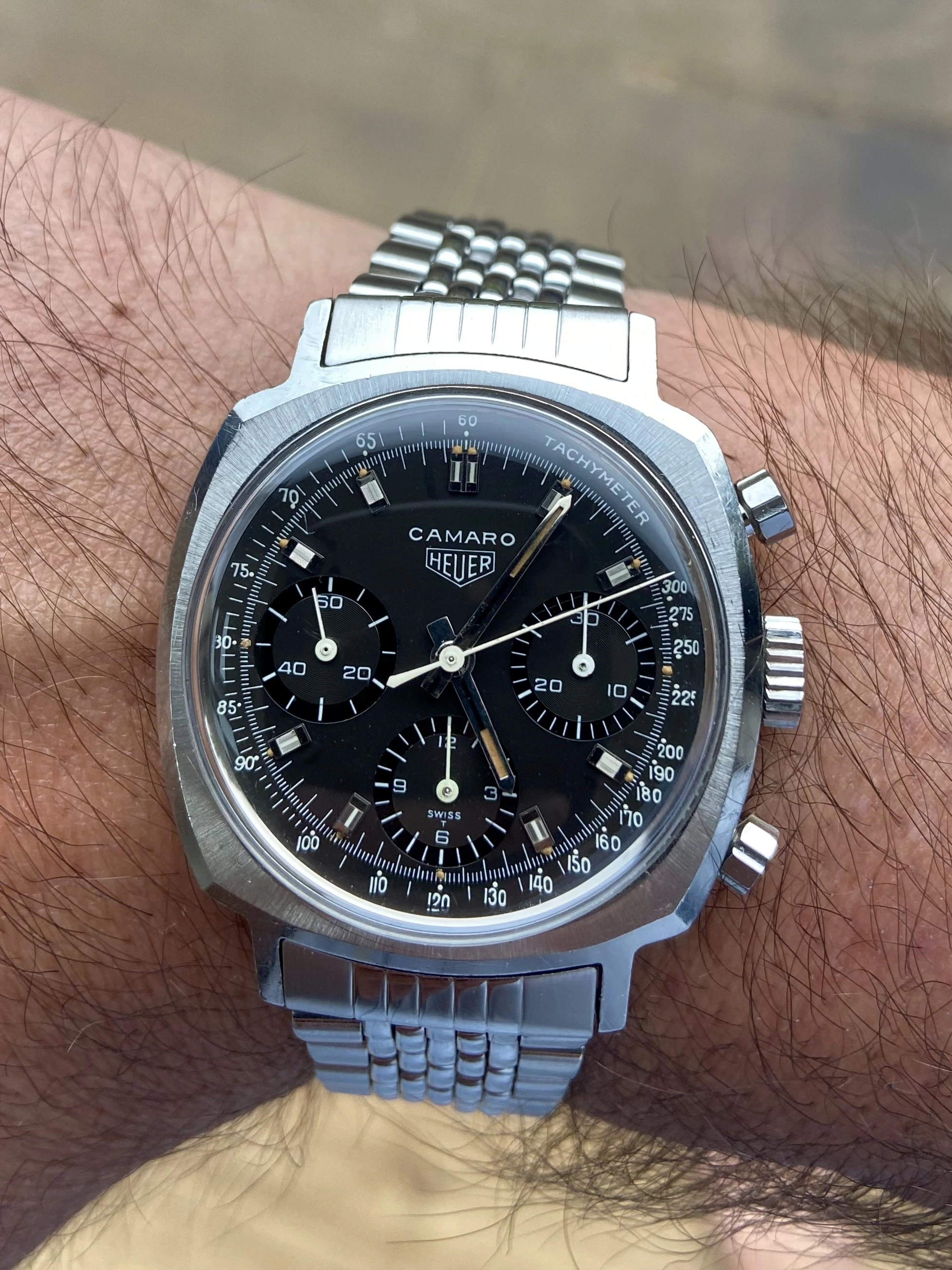 This is a beautiful example of the classic valjoux 72 powered Camaro. I would say it’s genuinely one of the best, if not the best on the market right now. It is all original, with a clean sharp case and beautiful, slightly tropical noir/black dial.