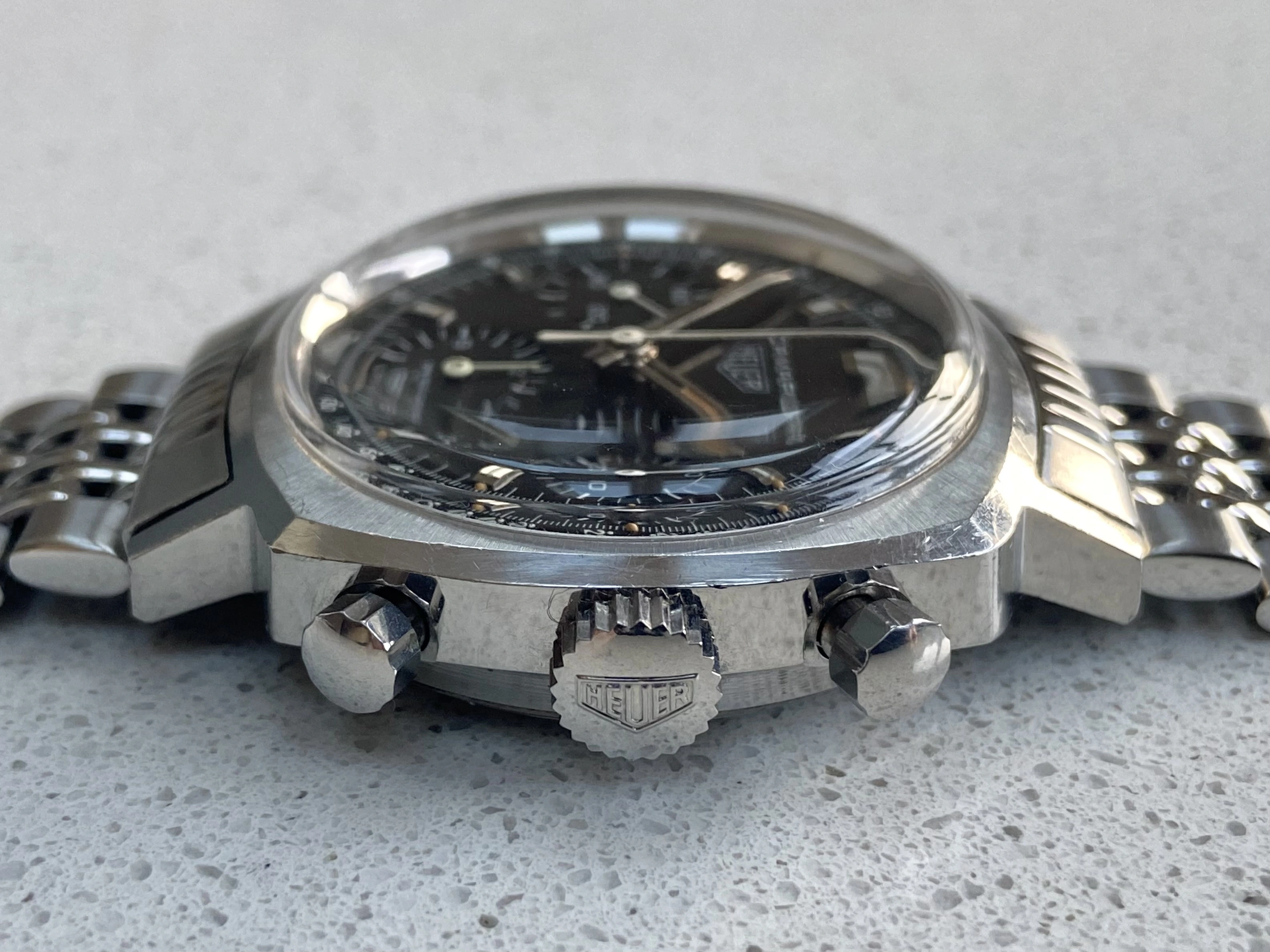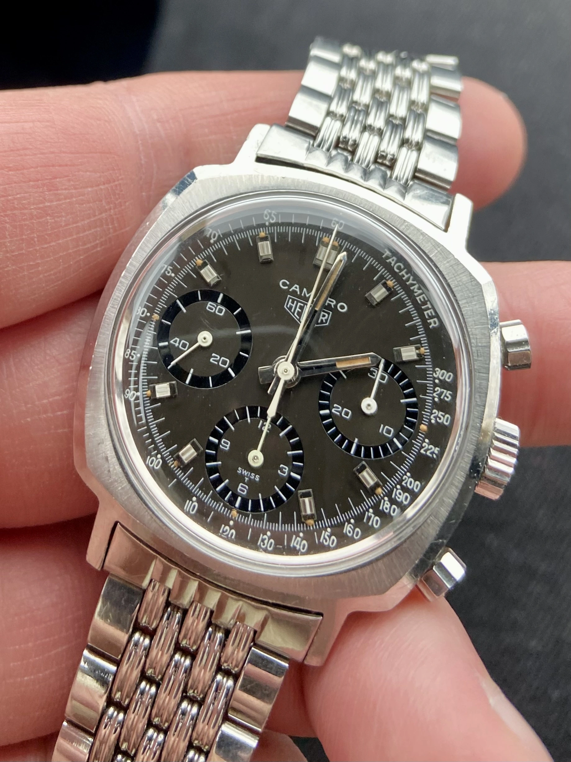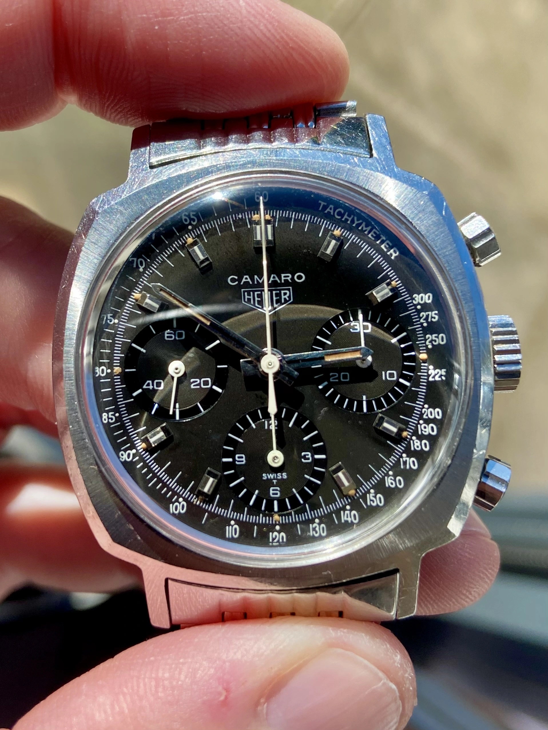 This is a beautiful example of the classic valjoux 72 powered Camaro. I would say it’s genuinely one of the best, if not the best on the market right now. It is all original, with a clean sharp case and beautiful, slightly tropical noir/black dial.