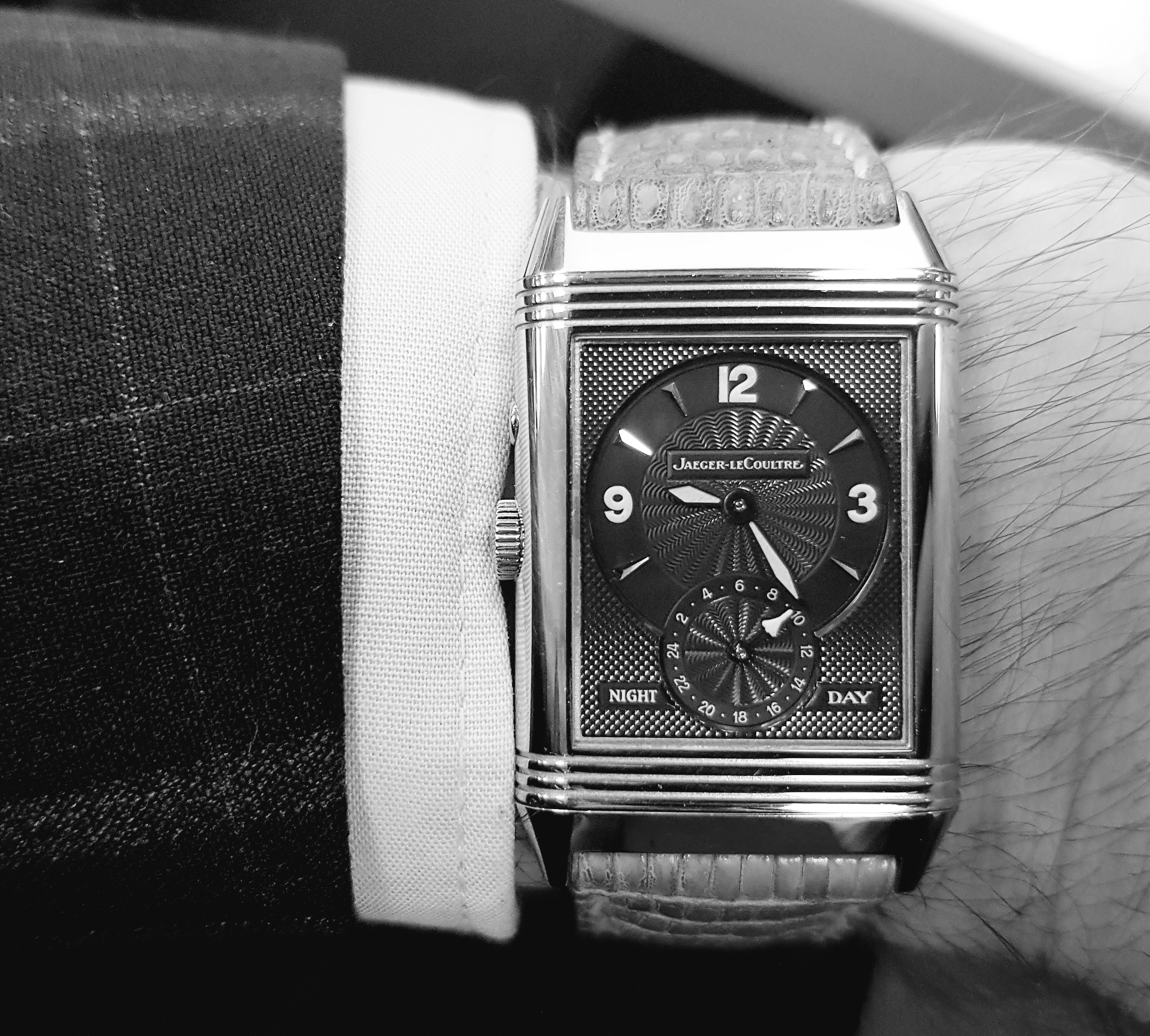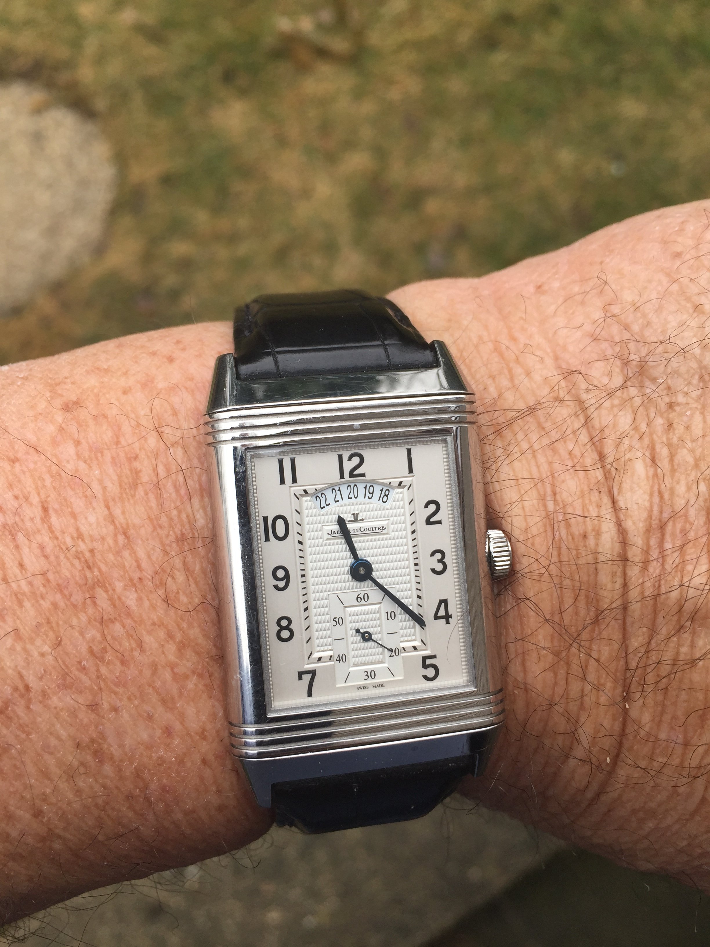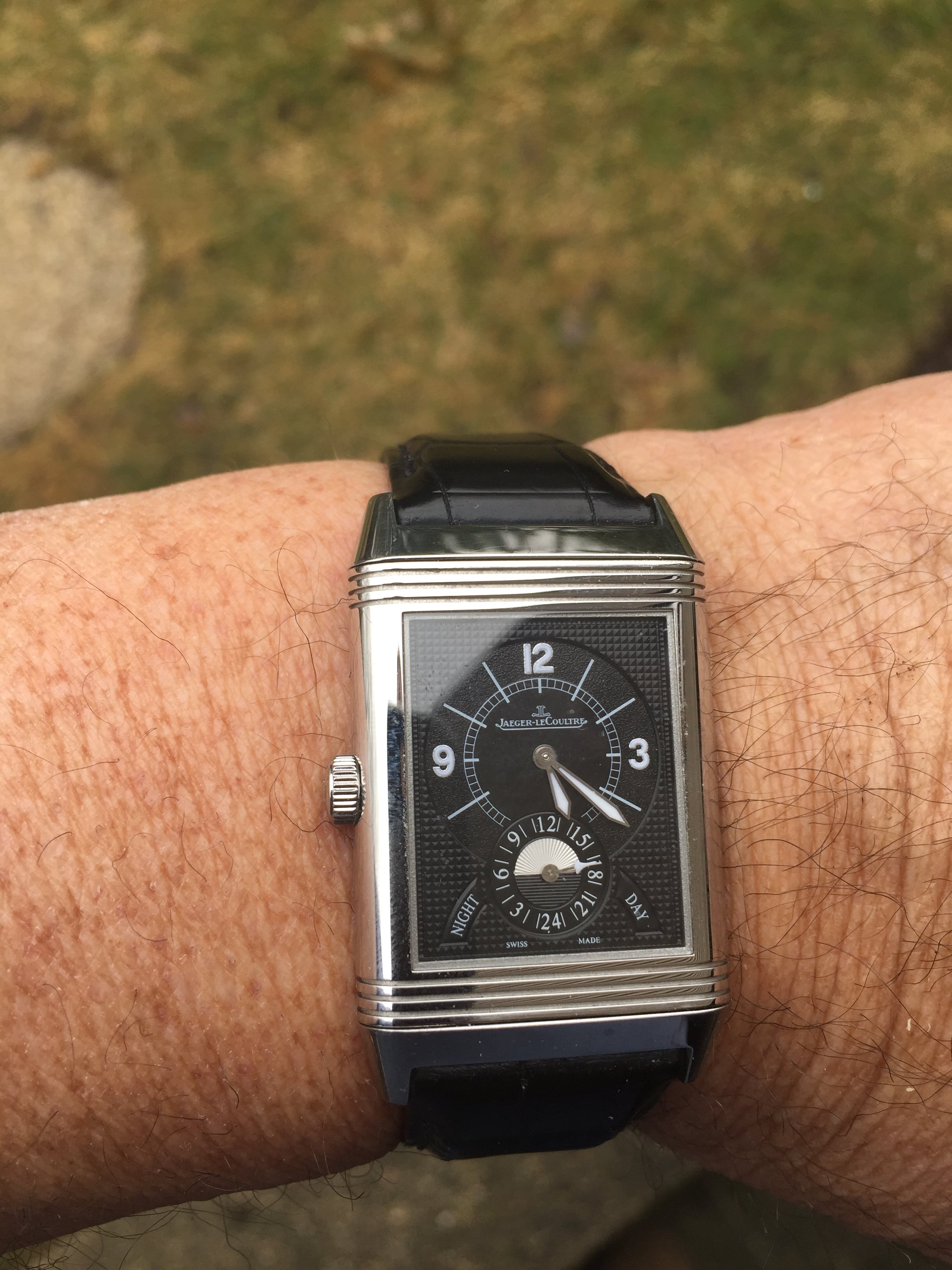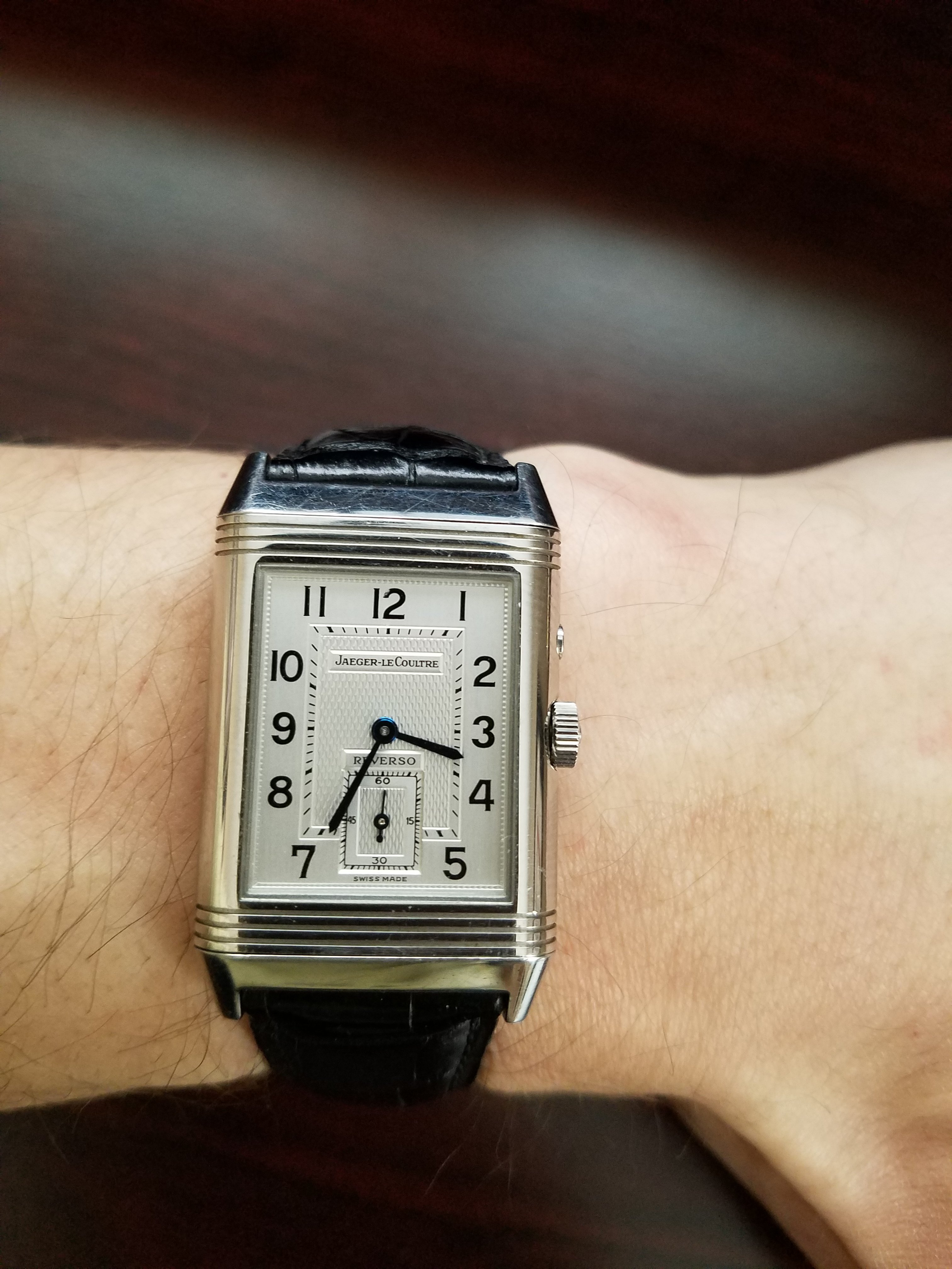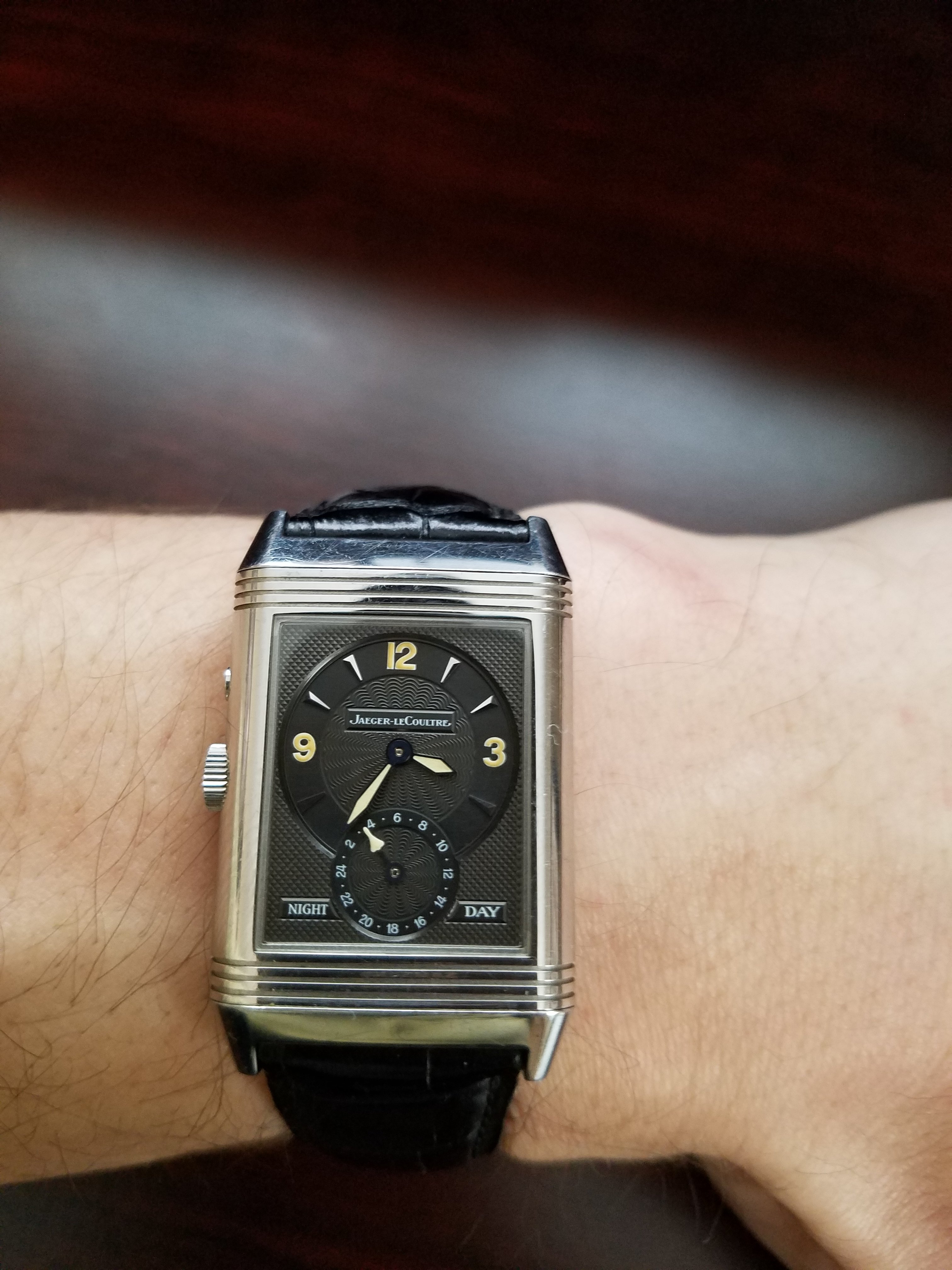 I wanted to share a couple photos of my latest watch acquisition, and it's one that I spent a good deal of time searching for over the past several months. I became enamored with the JLC Reverso Duo long ago and really fell for the first edition created in the mid-1990s. The elegance, class and overall design aesthetics are just breathtaking. I finally found the model at a decent price earlier this week and am now the proud owner of the 270.8.54 model, as it arrived today. It's been worn some, but what watch hasn't that's 23 years old? Overall, it's in great shape. I'm over the moon.