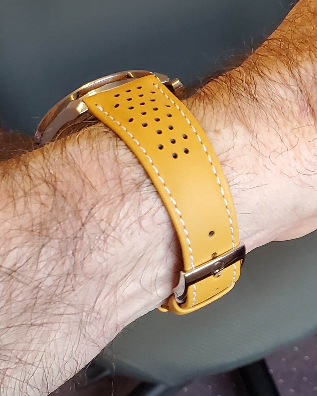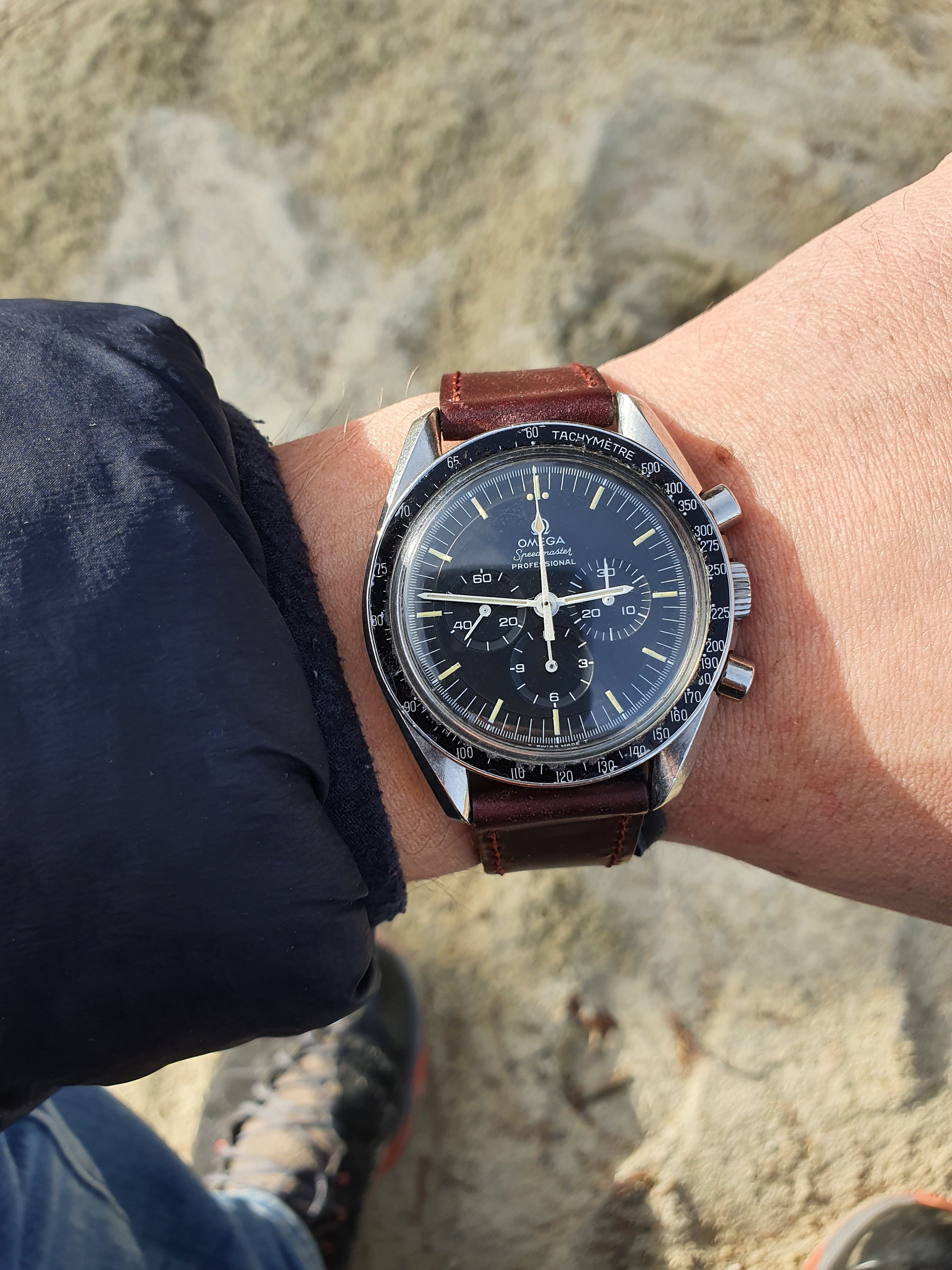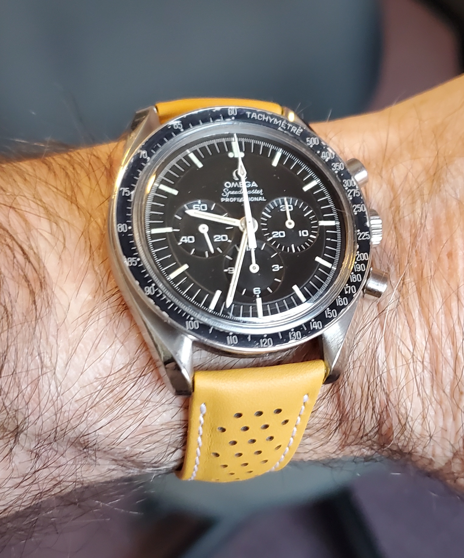 I wore mine for a few weeks with the 1039 but then removed the bracelet to preserve it. I have tried it on a few straps that I had hanging around and the one I like best is a genuine Omega yellow racing strap.