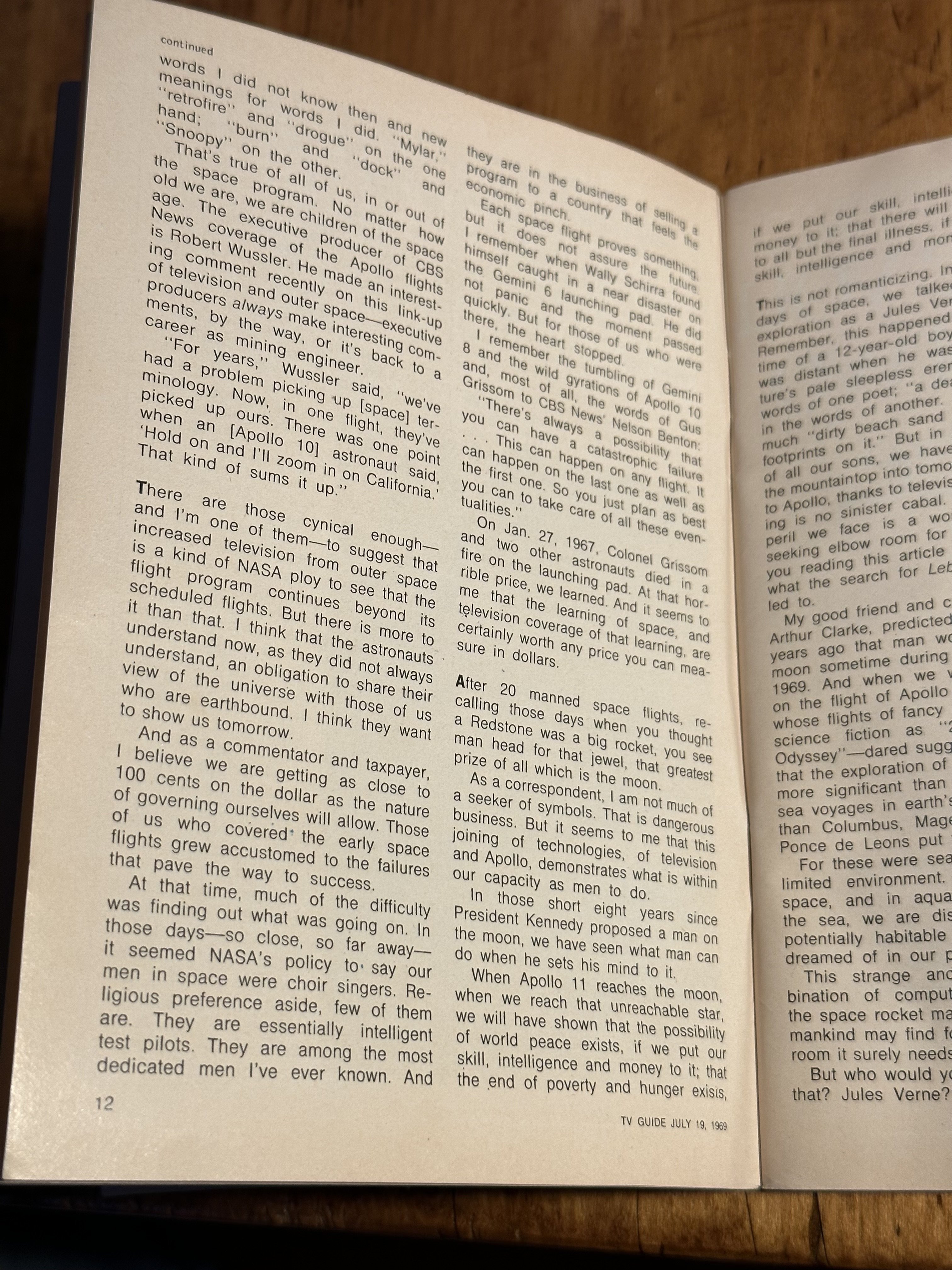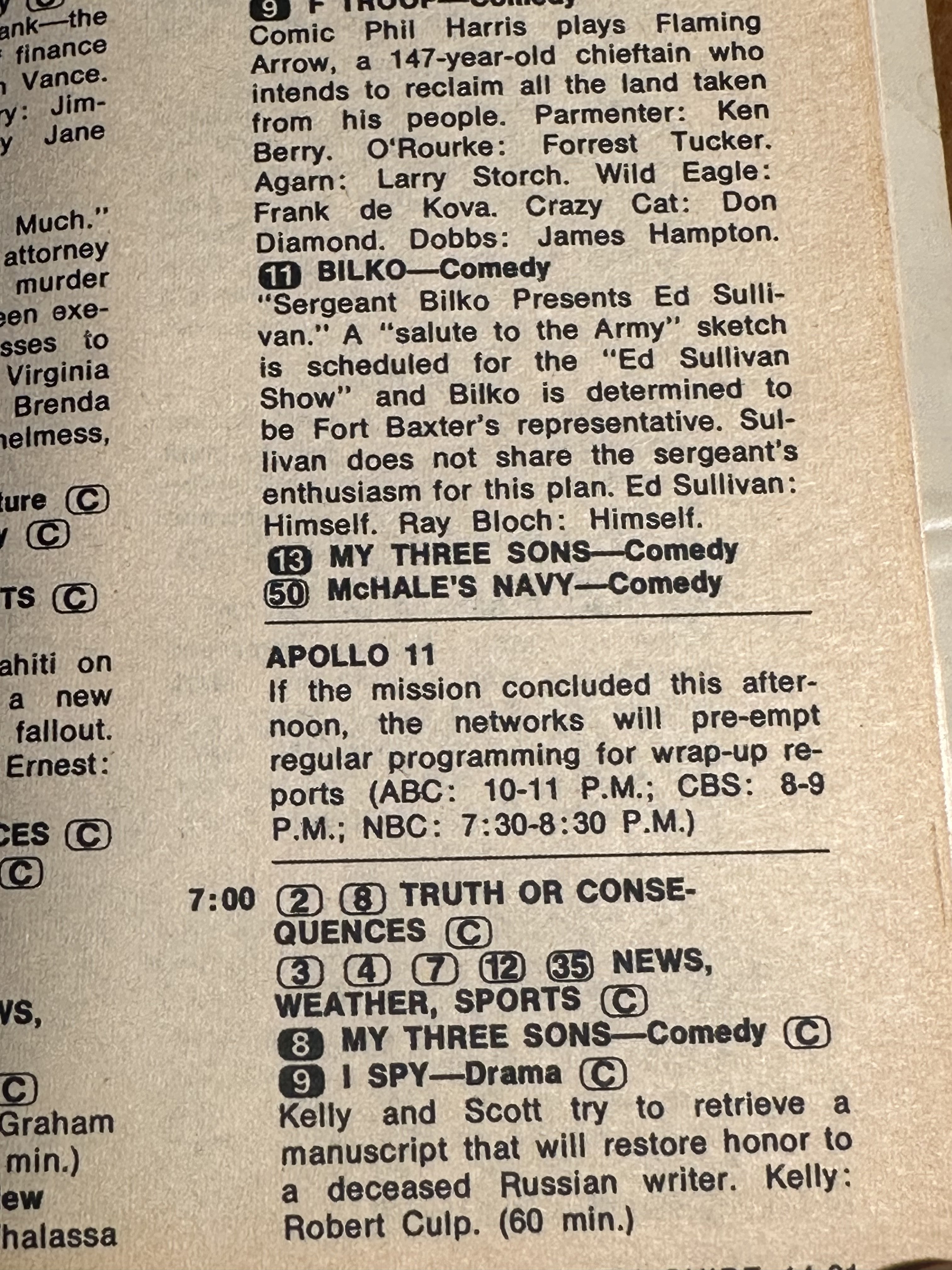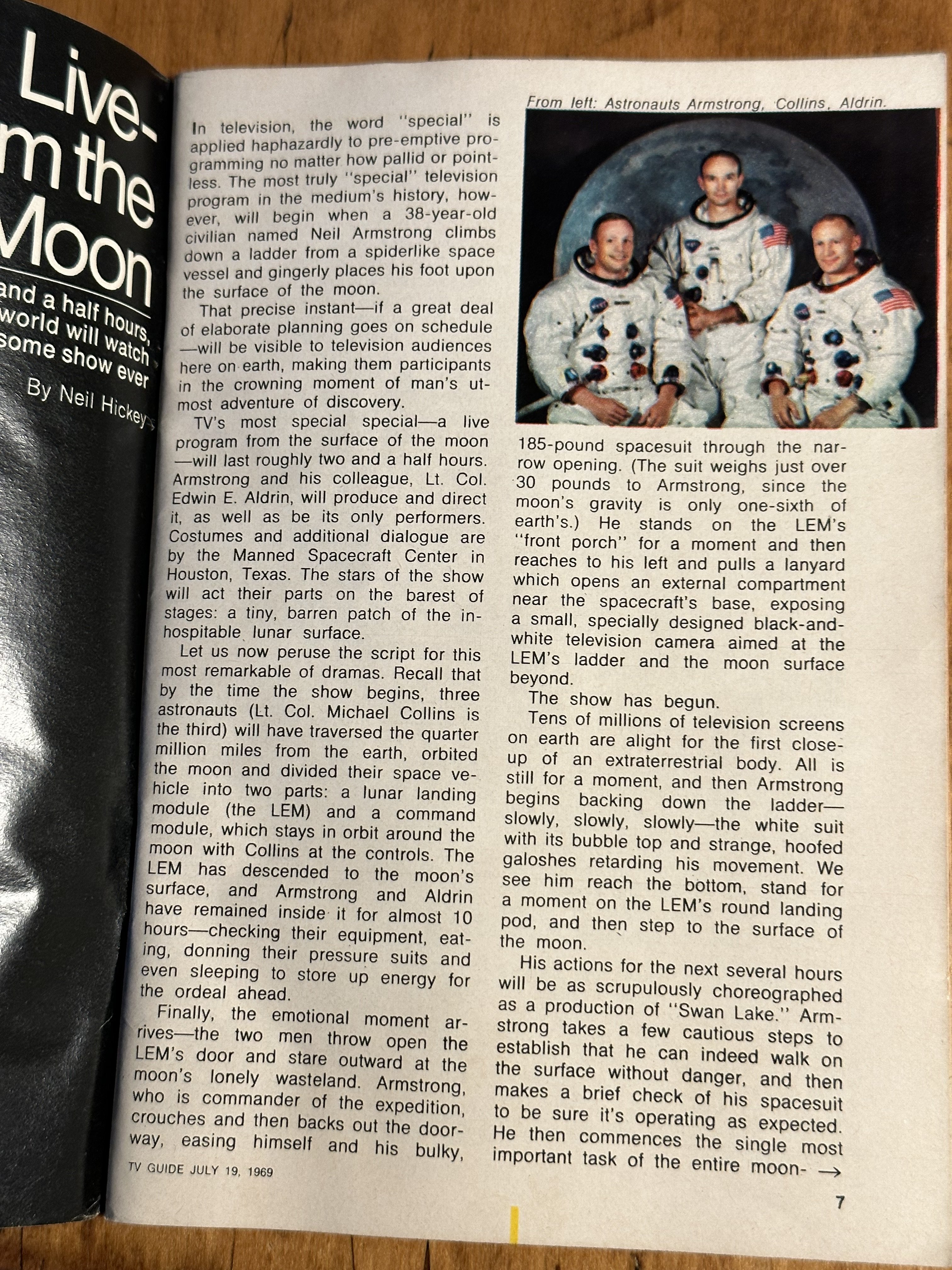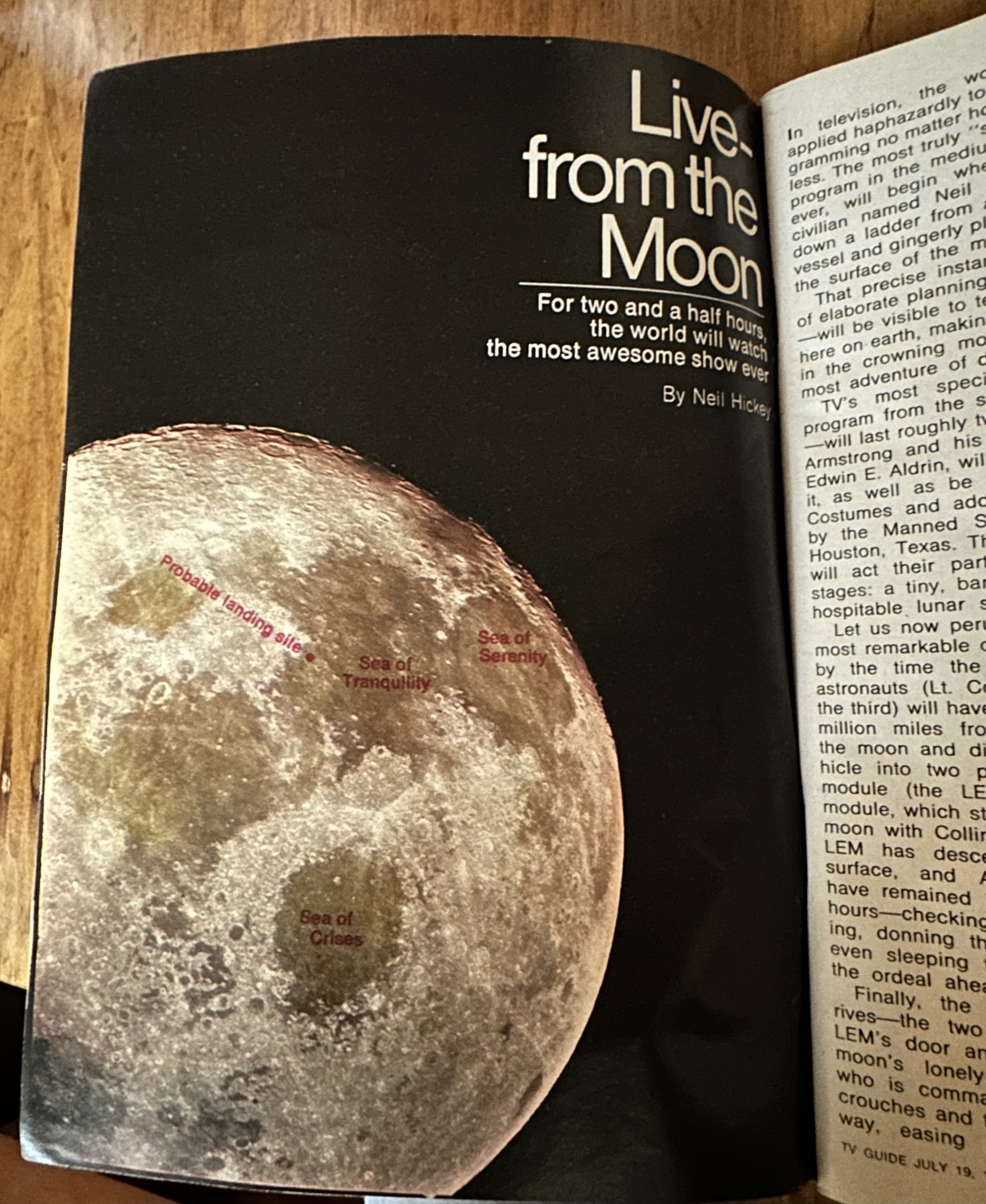 My cousin got married on July 20th 1969. So we were all gathered around a small B&W TV for the moon landing. I said if we were at home it should be in color. I think the later missions were. If you have not seen the film titled "The Dish" it is quite a treat especially for people who like things from down under. It comically tells the story how the transmission came about. Sheep and all.