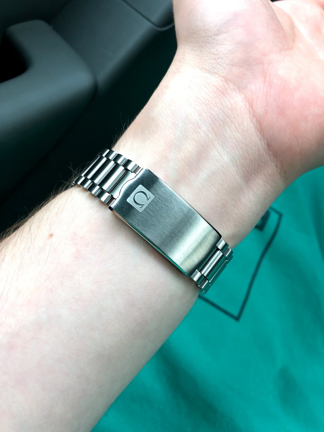 I love the big omega logo on the clasp and the sheen of the metal. The bracelet has a nice "droop" to it that adds to its vintage charm. It is comfortable and I can now give it gentle bird baths after a long day at the hospital. I am completely satisfied with this addition and found it to be well worth the cost and effort. Enjoy some pictures!