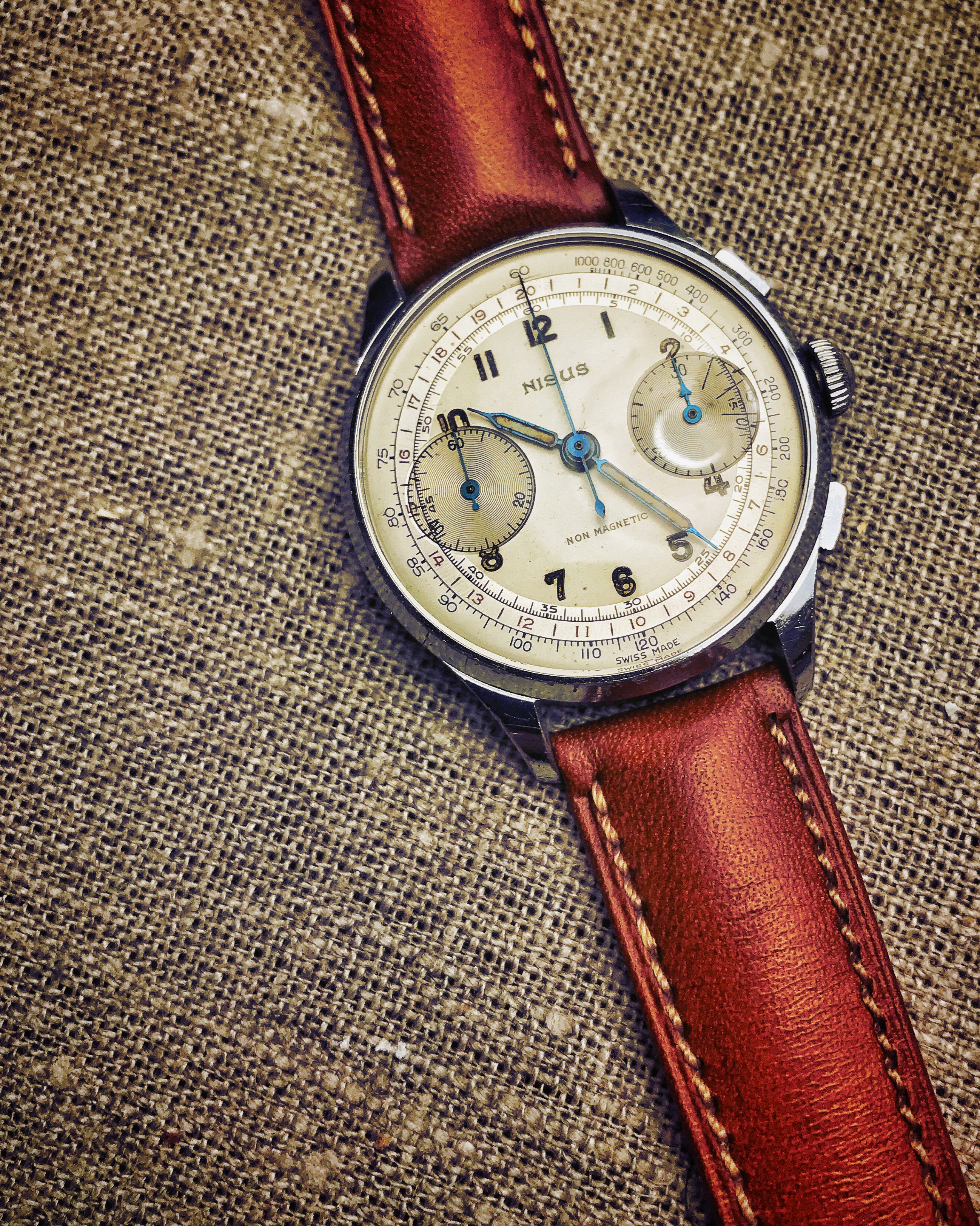 Here's a pic of my Nisus chrono with Valjoux 22, probably from the 40s. One of my first mechanical chronos and with a really attractive dial and blued hands. Too bad that the case is nickel-chrome, not steel.