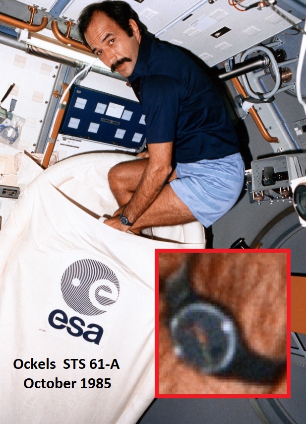 While we're trying to find out which was the first mission logo Swatch made, it looks like Dutch astronaut Wubbo Ockels might already have wore a Swatch-like wristwatch on STS 61-A in October 1985 ?