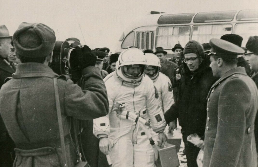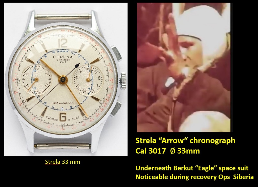 We can conclude the Strela "Arrow" chronograph wristwatch was worn underneath the Berkut spacesuit as we only see these 33 mm white cream dial watches on cosmonauts' wrists during recovery TV footage...