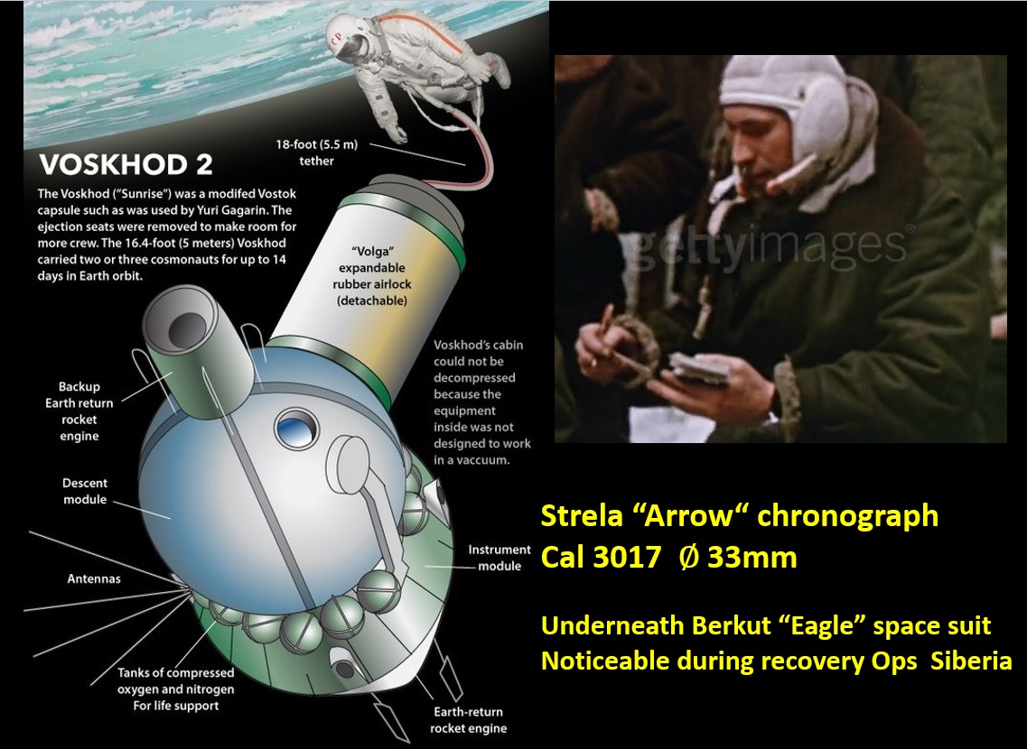 I still have to see a clear photo or video footage still showing a Strela "Arrow" chronograph on the outside of the Berkut spacesuits used by Voskhod-2 cosmonauts Alexei Leonov and Pavel Belyayev in March 1965...