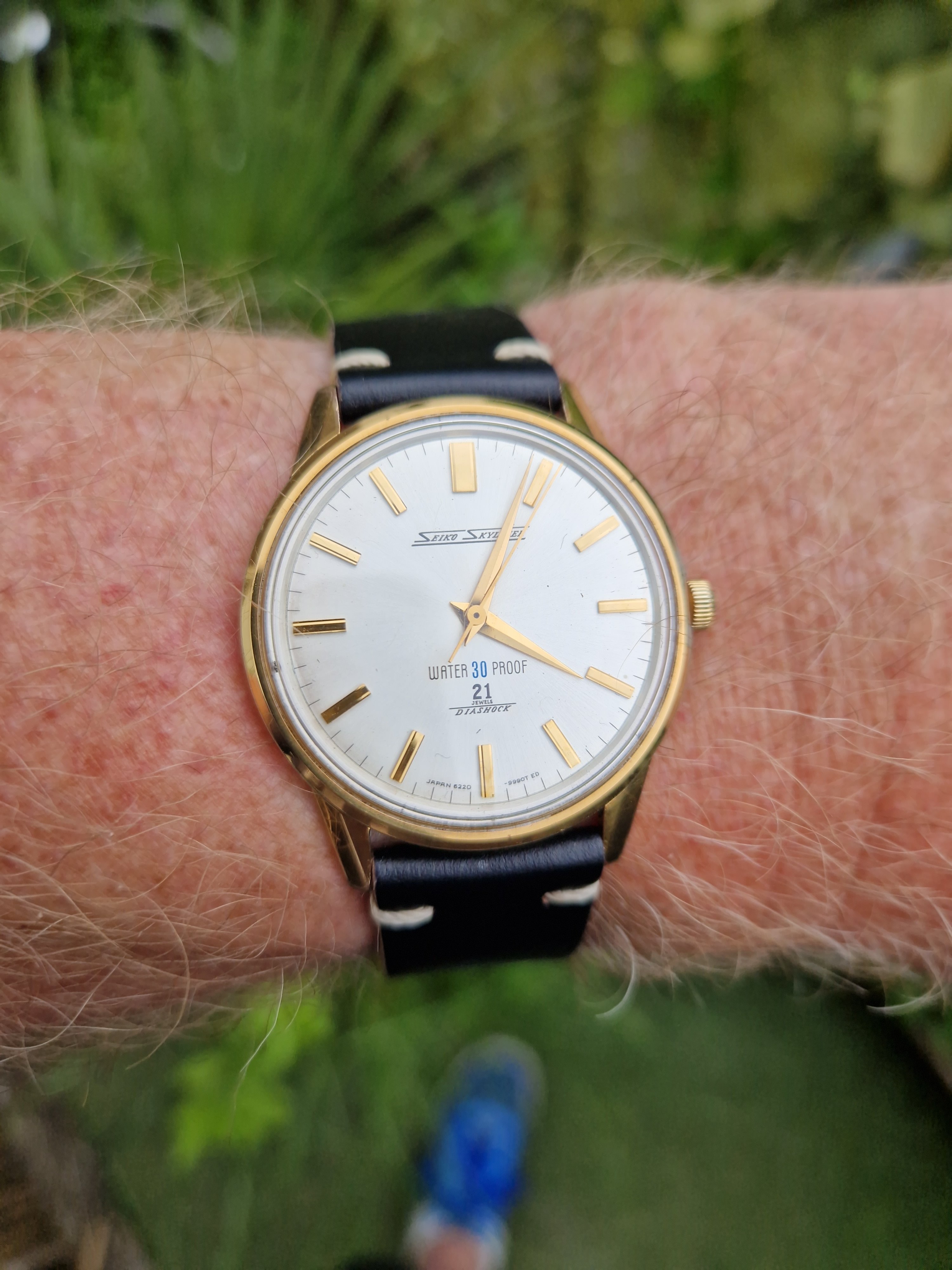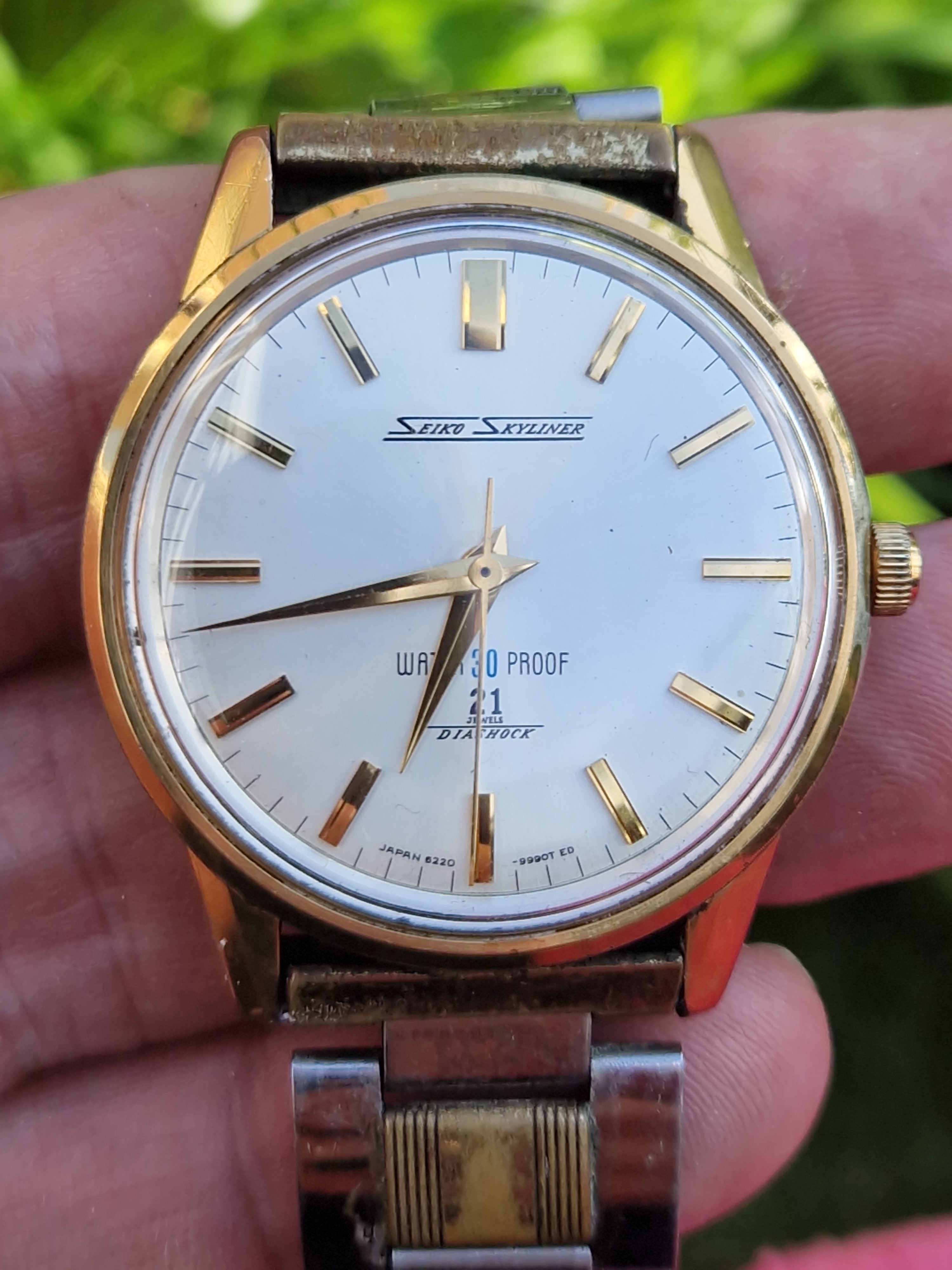 ·I bought this Skyliner in a sad condition, The bracelet was aftermarket and a mess the case was very dirty and I thought scratched en the crystal looked like it needed to be replaced..... But as you can see if you look at the hands, it took not long to make it look like a real watch. I never use watch products to polish a crystal or a case so maybe that is why it looks so good (I do use "meguiars" that is a car product) On the last picture the Skyliner sits on an Horween strap looking like a million bucks.