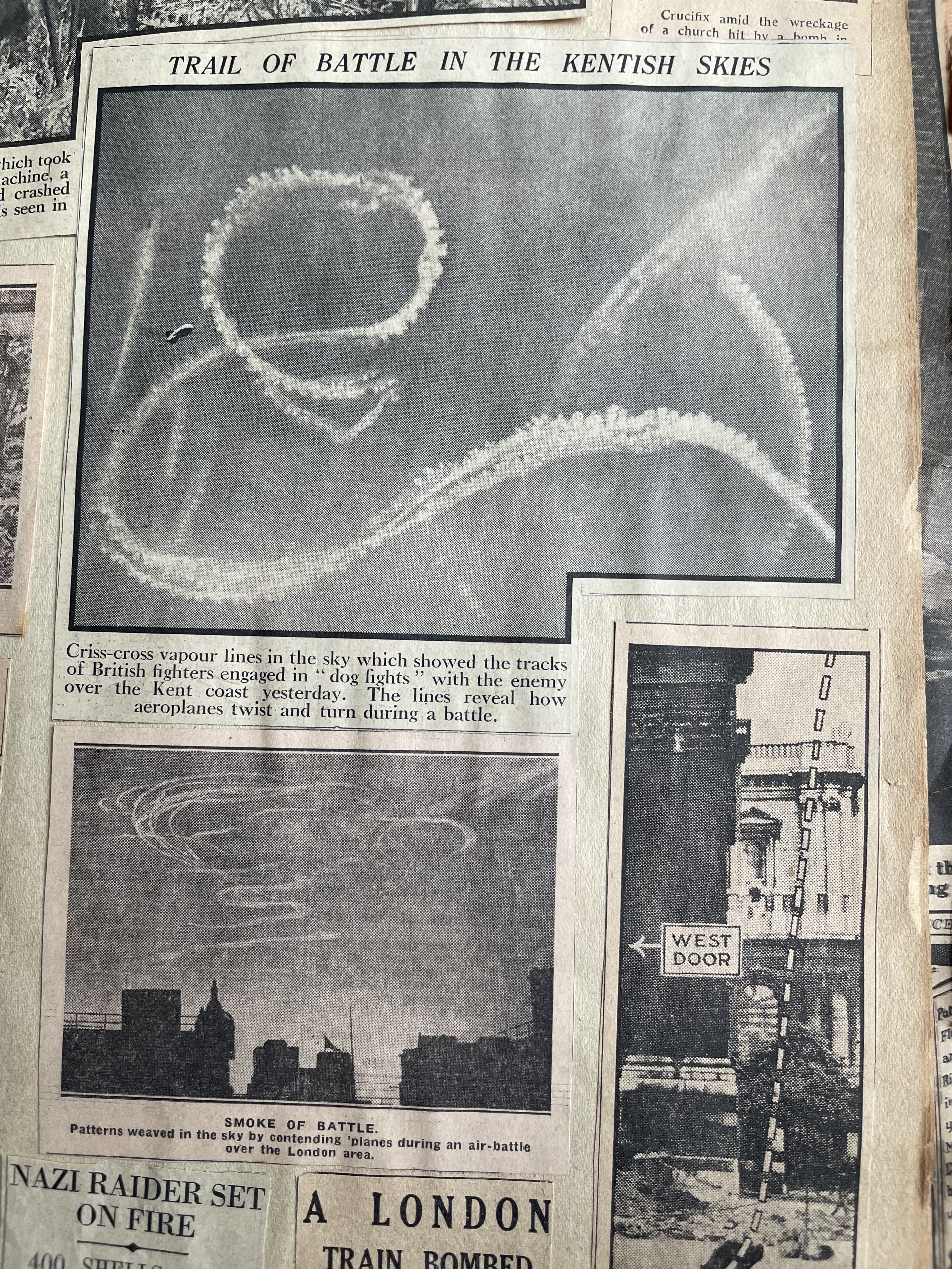 I think I posted this once before but my Grandmother saw a big daylight raid. Her friend was looking up / there had been no warnings and hundreds of planes came over. People said it was RAF. My Grandmother got binoculars and saw The crosses / told people to get in the shelter. She stayed up and described seeing a few little fighters engage and watching the white contrails like that first picture.