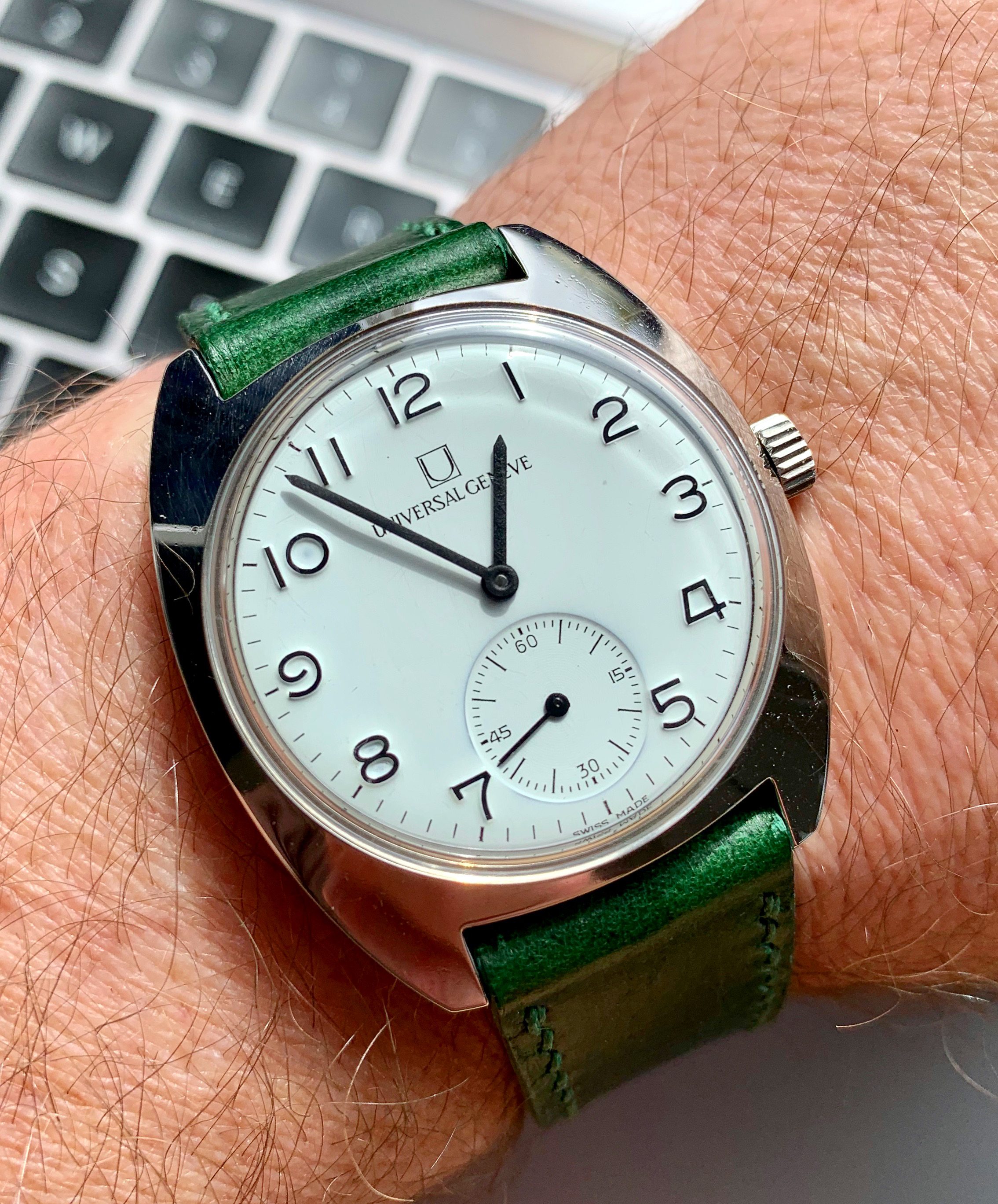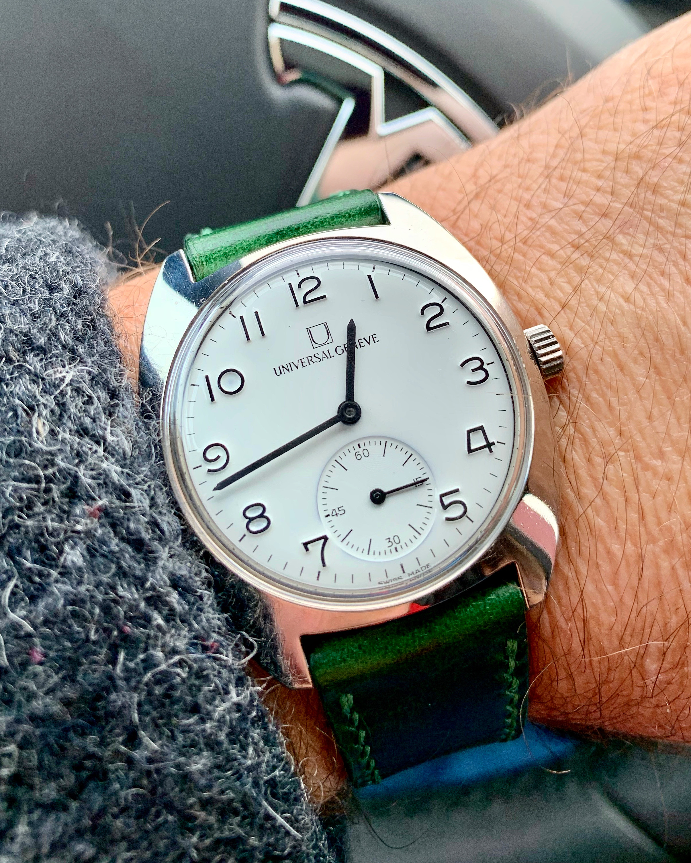 My collection of vintage Universal wristwatches spans the 1940s to the 1970s and includes a pair of manual wind movements, a bumper automatic, a micro-rotor automatic and even a tuning fork movement. I don't have a particular theme here beyond "UG watches" and prefer to collect a breadth of ages, technologies and designs. I recently sourced 4 period correct UG straps (all the black ones) and 3 UG clasps to start to round out the look.