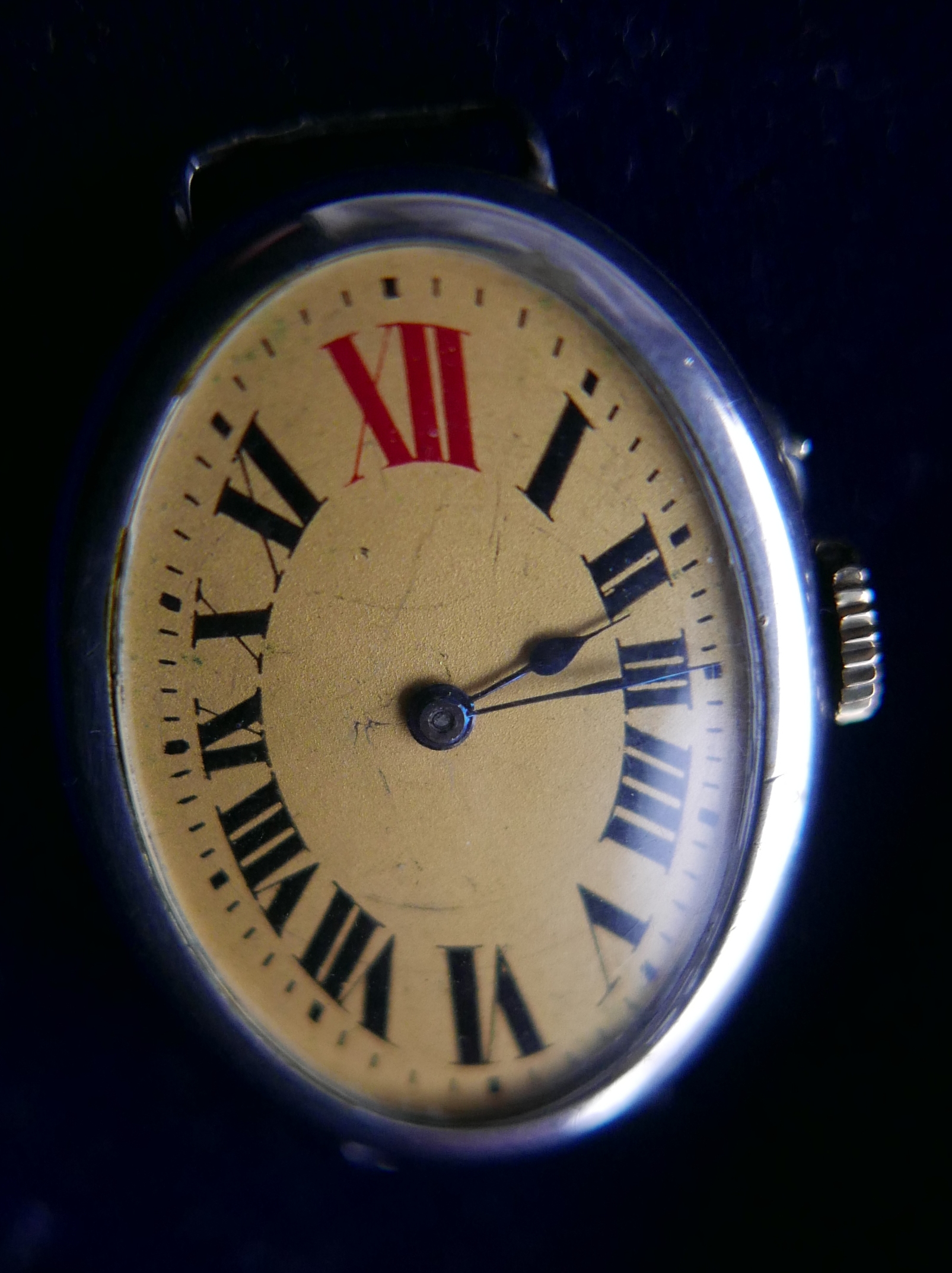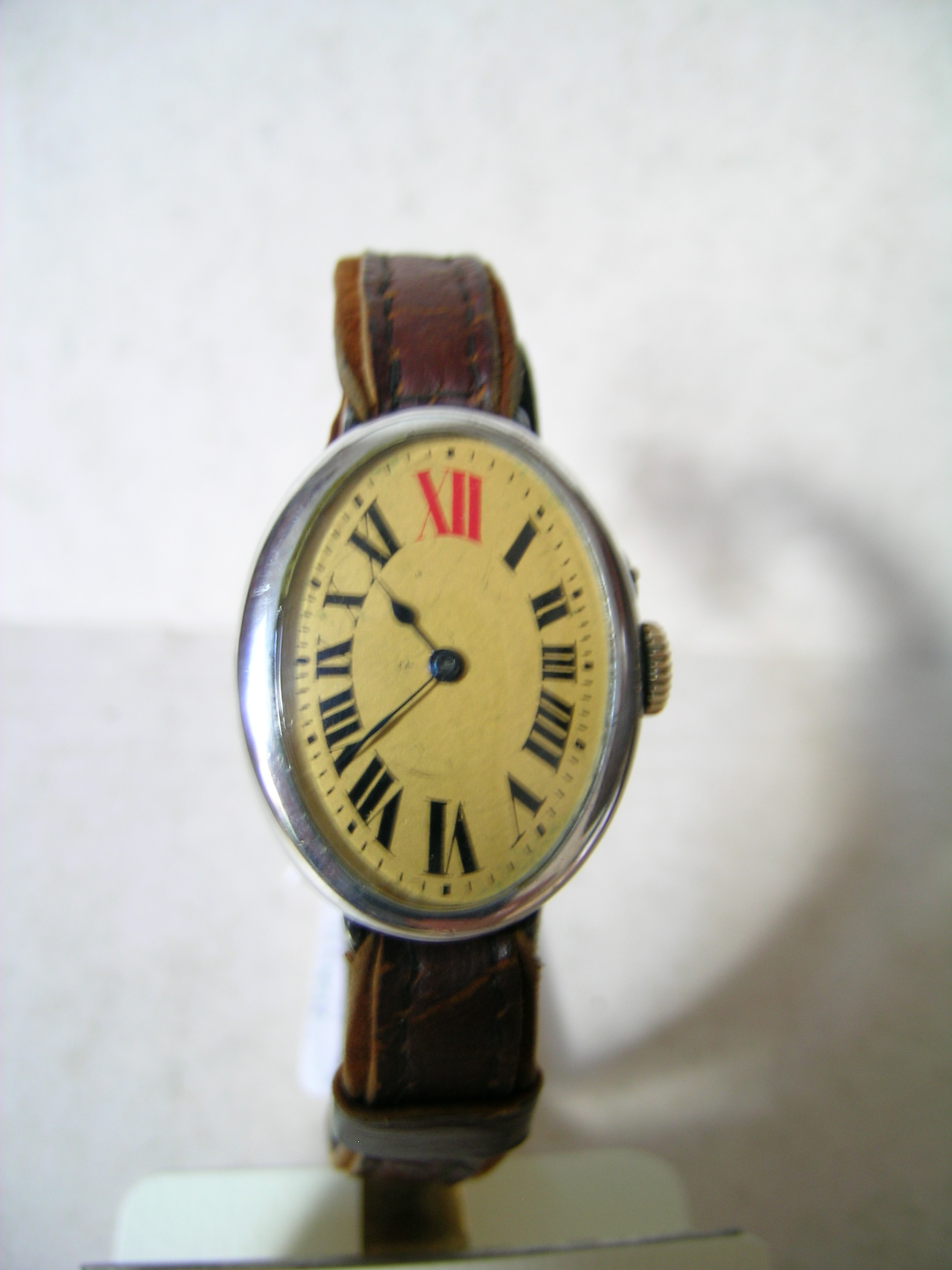 I see a Swiss, 15 jewel, jewelled lever, manual wind movement of undetermined size, in a .900 silver case with a badly yellowed plastic crystal, and what would appear to be a vitreous enamel dial. To take this much further, we might benefit from a view of the movement with the dial removed.