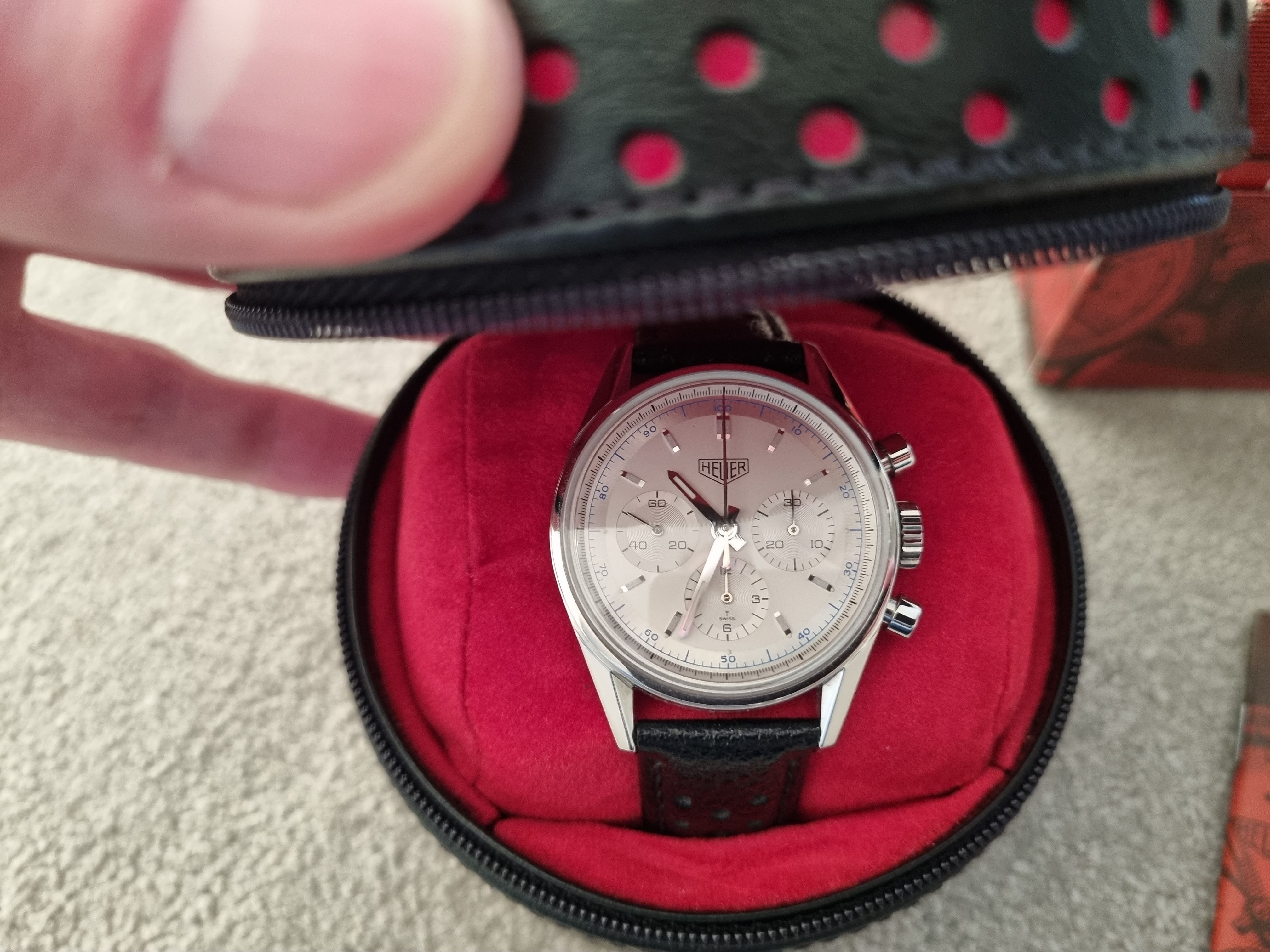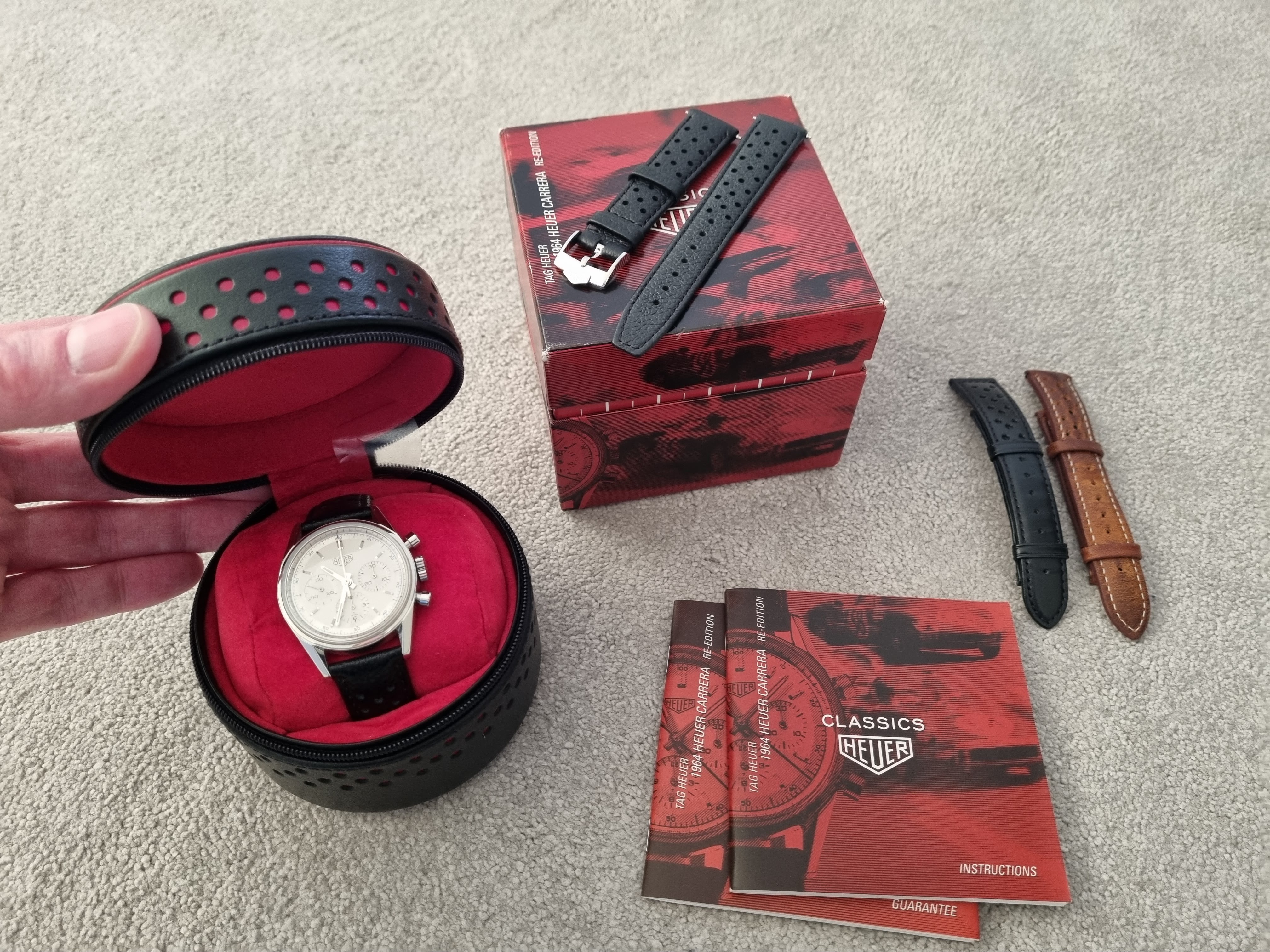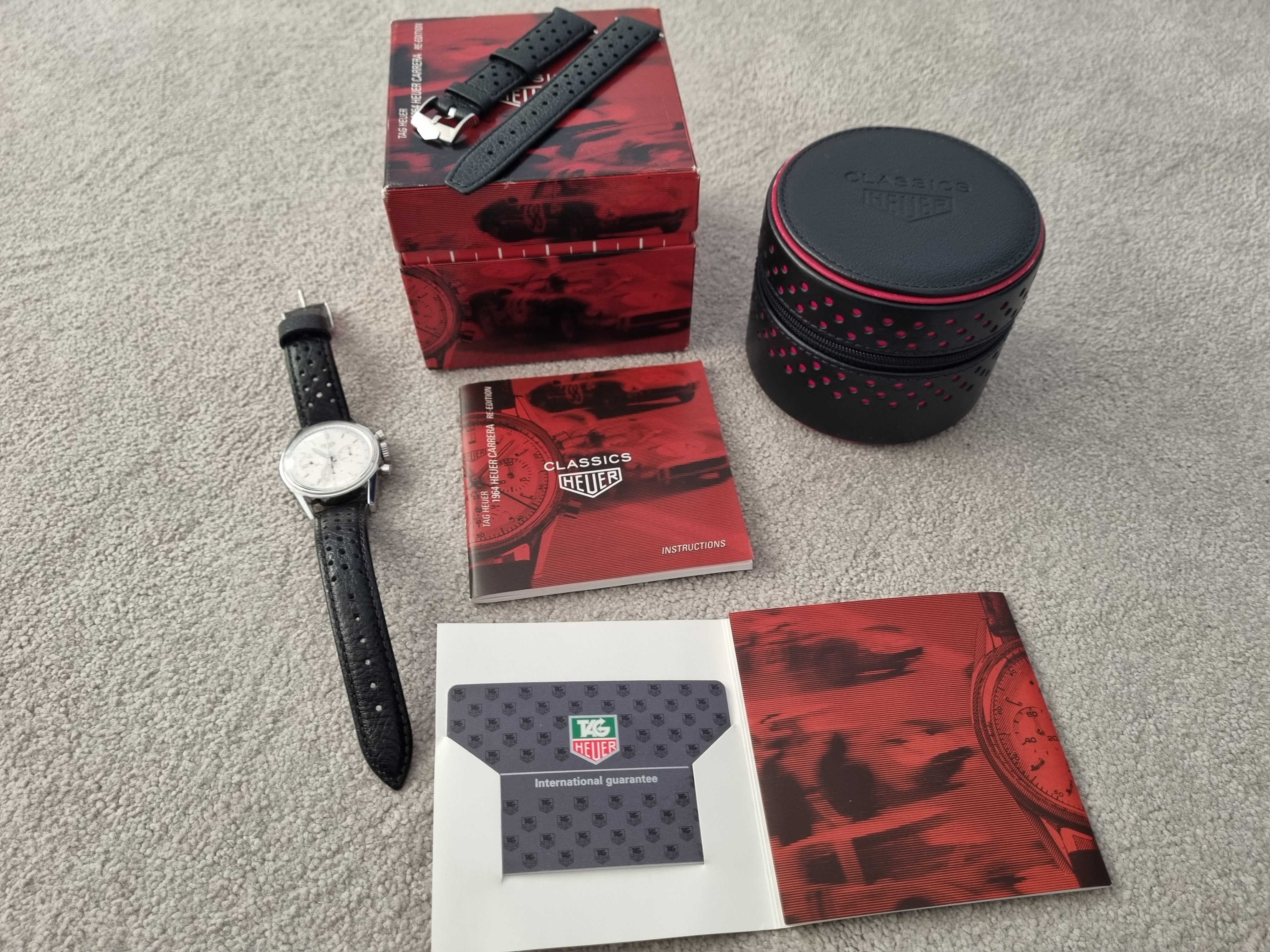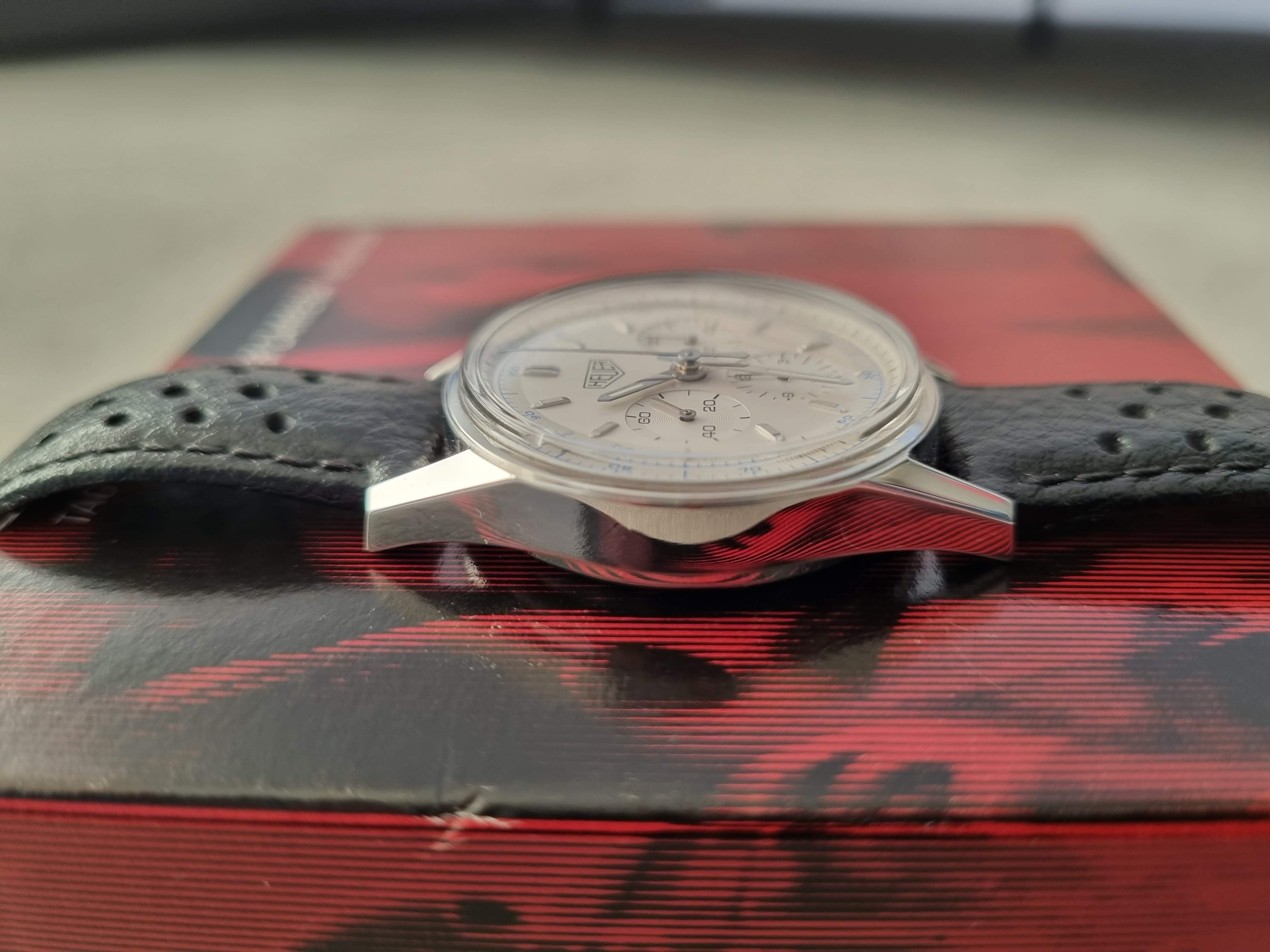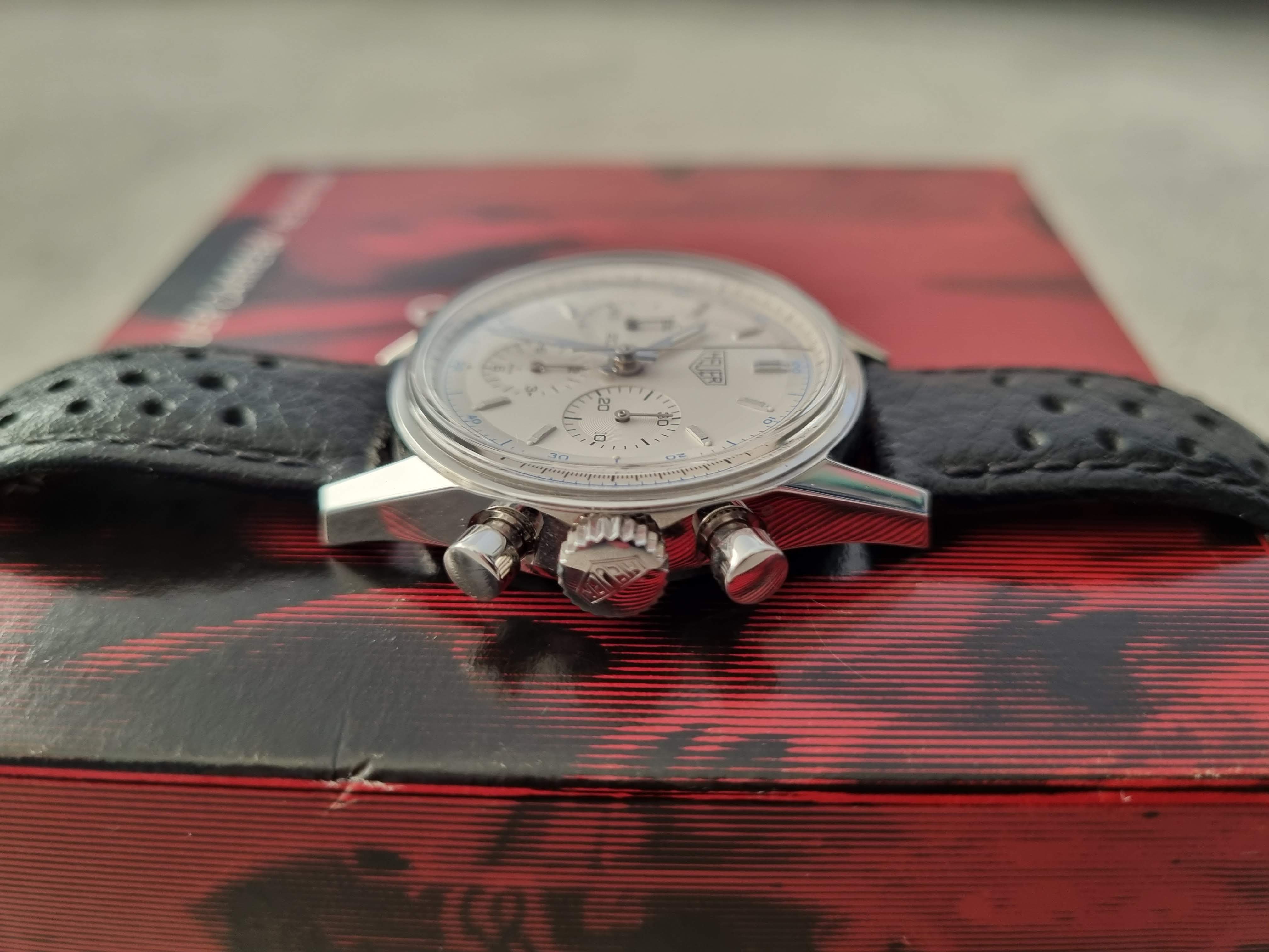 The watch was serviced by TAG Heuer in 2021 and is in excellent condition. It comes with its original box and papers, a black corfam style rally strap with original Heuer clasp, a brand new ununsed original Heuer strap with new Heuer clasp (provided by Tag Heuer when serviced), and a couple of other spare straps - black and brown (without clasp). I also have a black rally strap with the Heuer signed deployant clasp available (at extra cost) if someone wants that to go with it too.