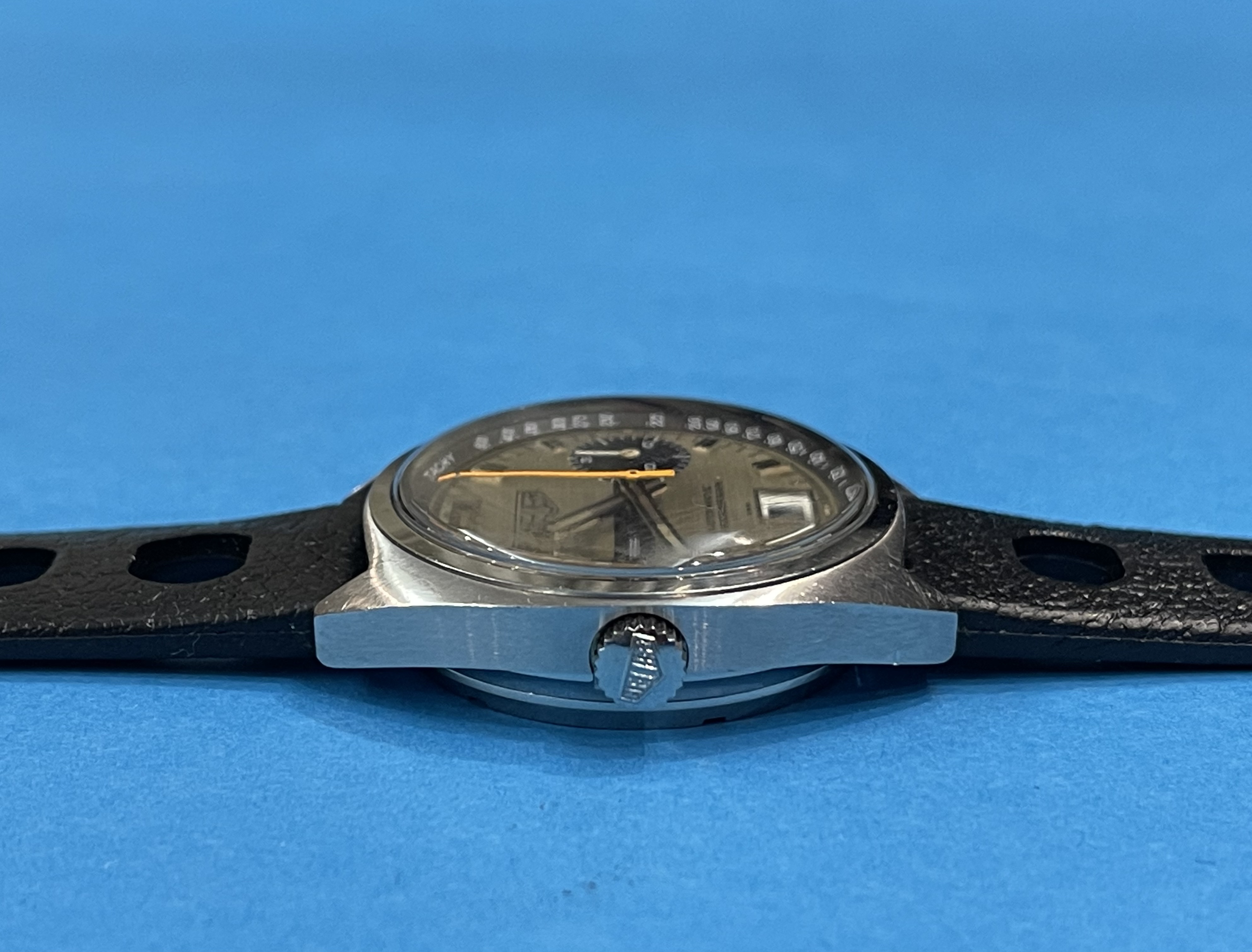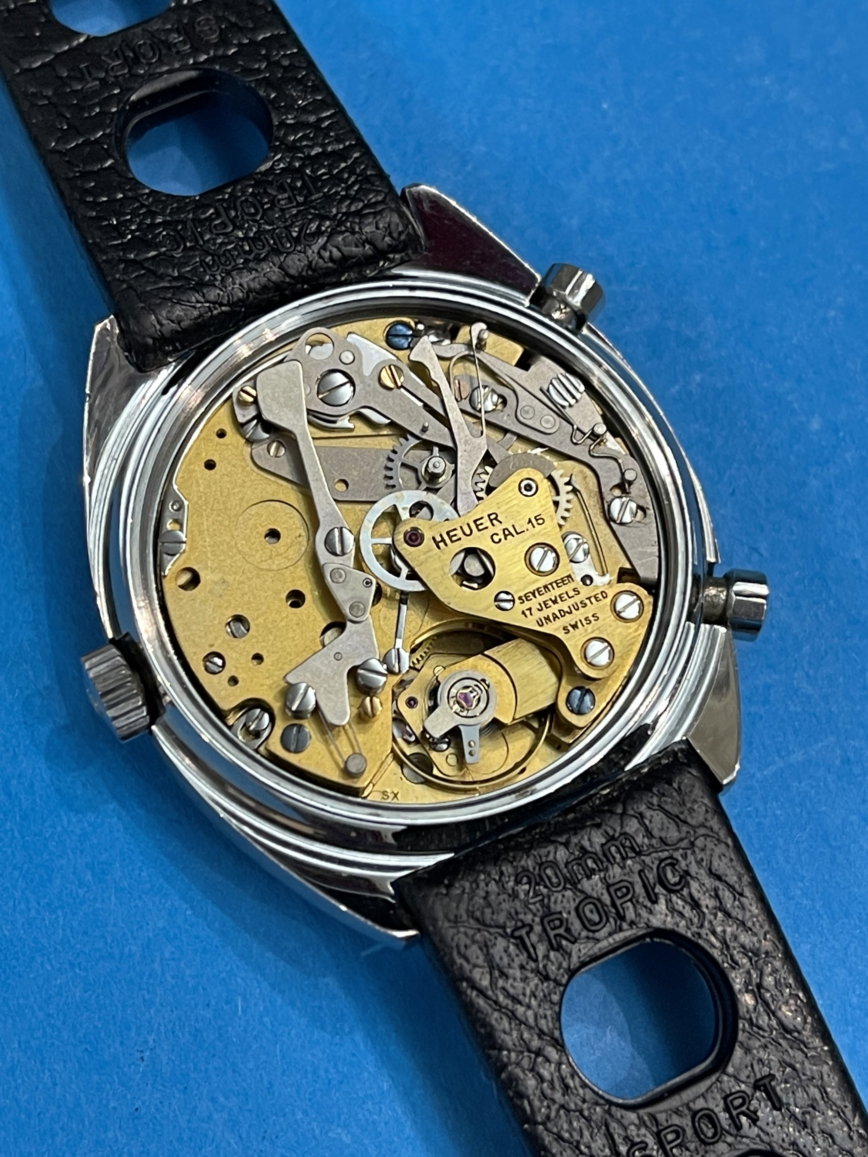 Movement is automatic Heuer caliber 15 with 17 Jewels, it is powered with a micro-rotor inside. Chrono function works. Movement is clean and at the moment of sale runs perfect +10 sec/day, please check timegrapher pic in gallery.