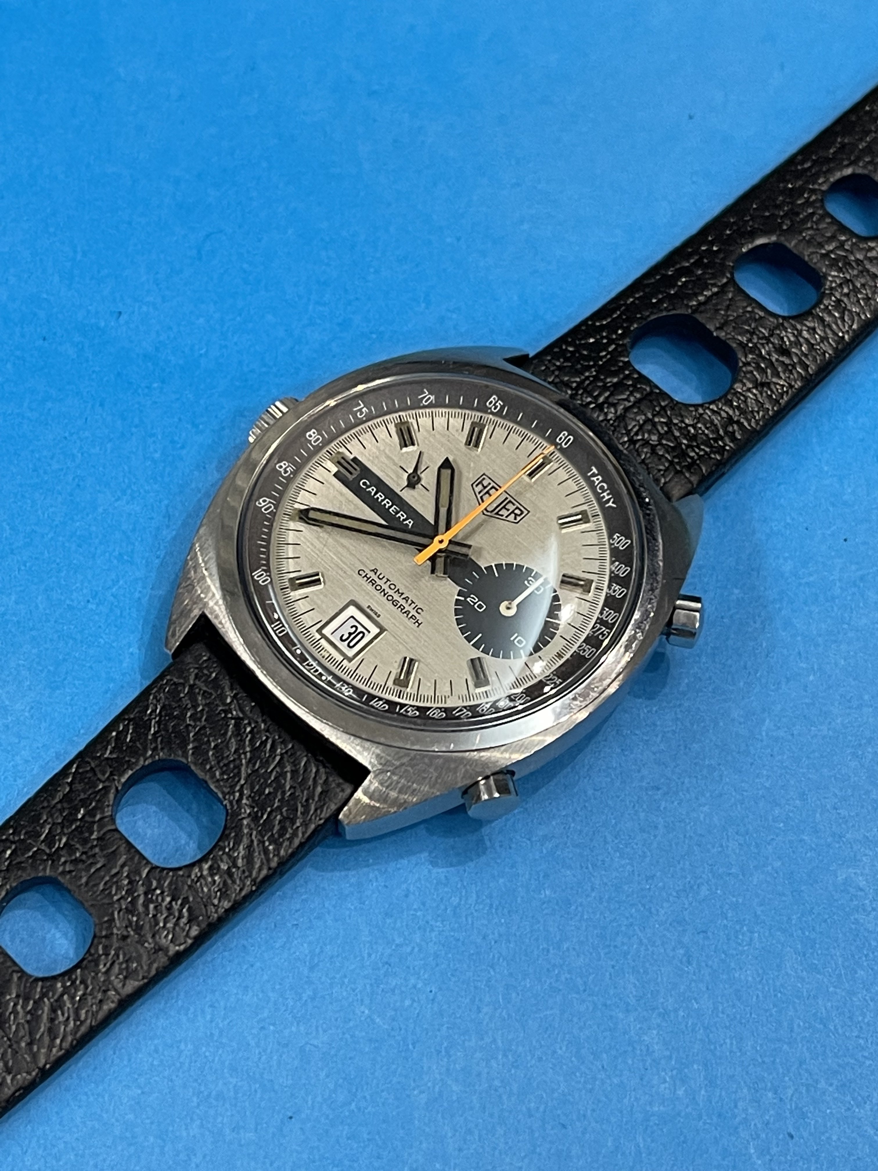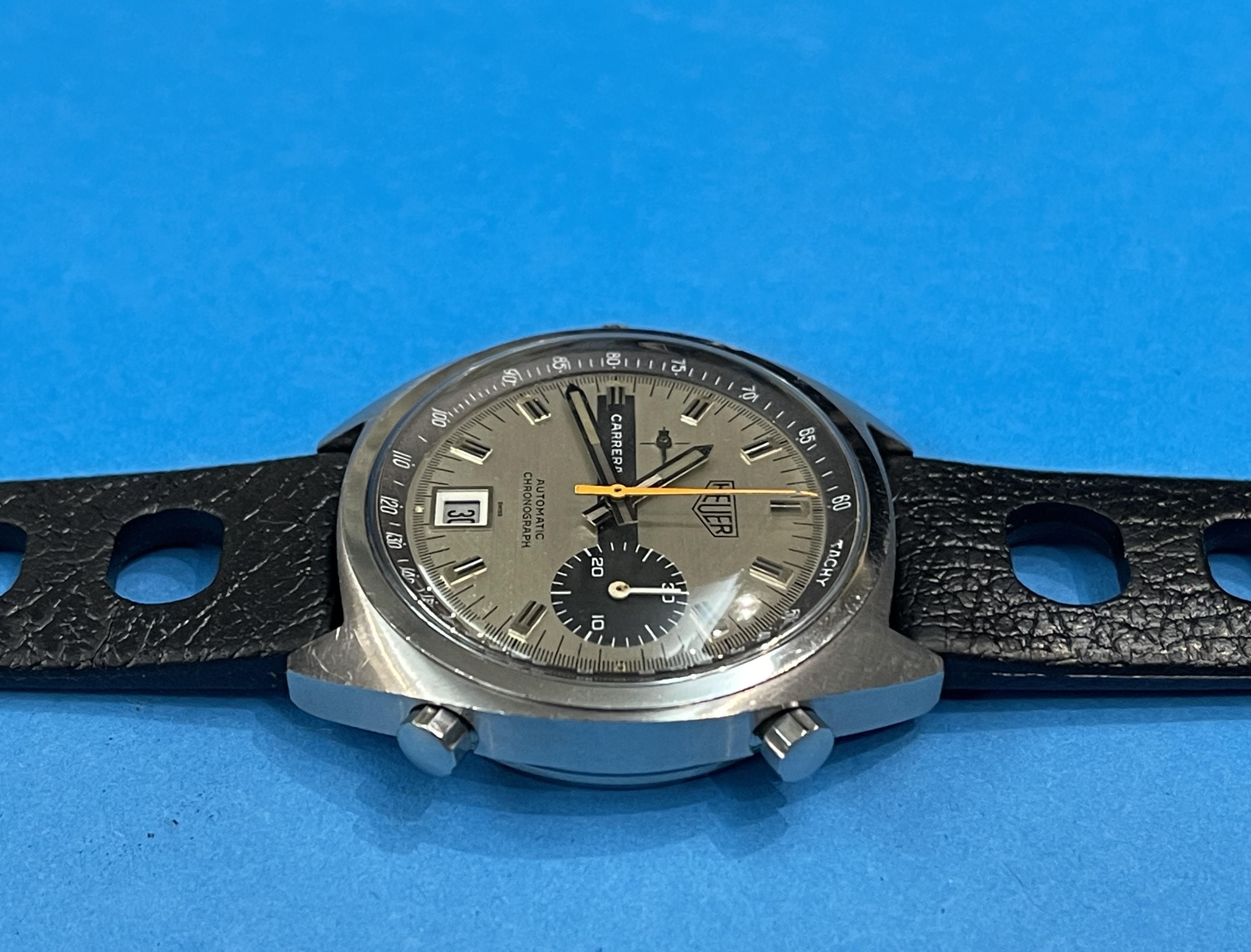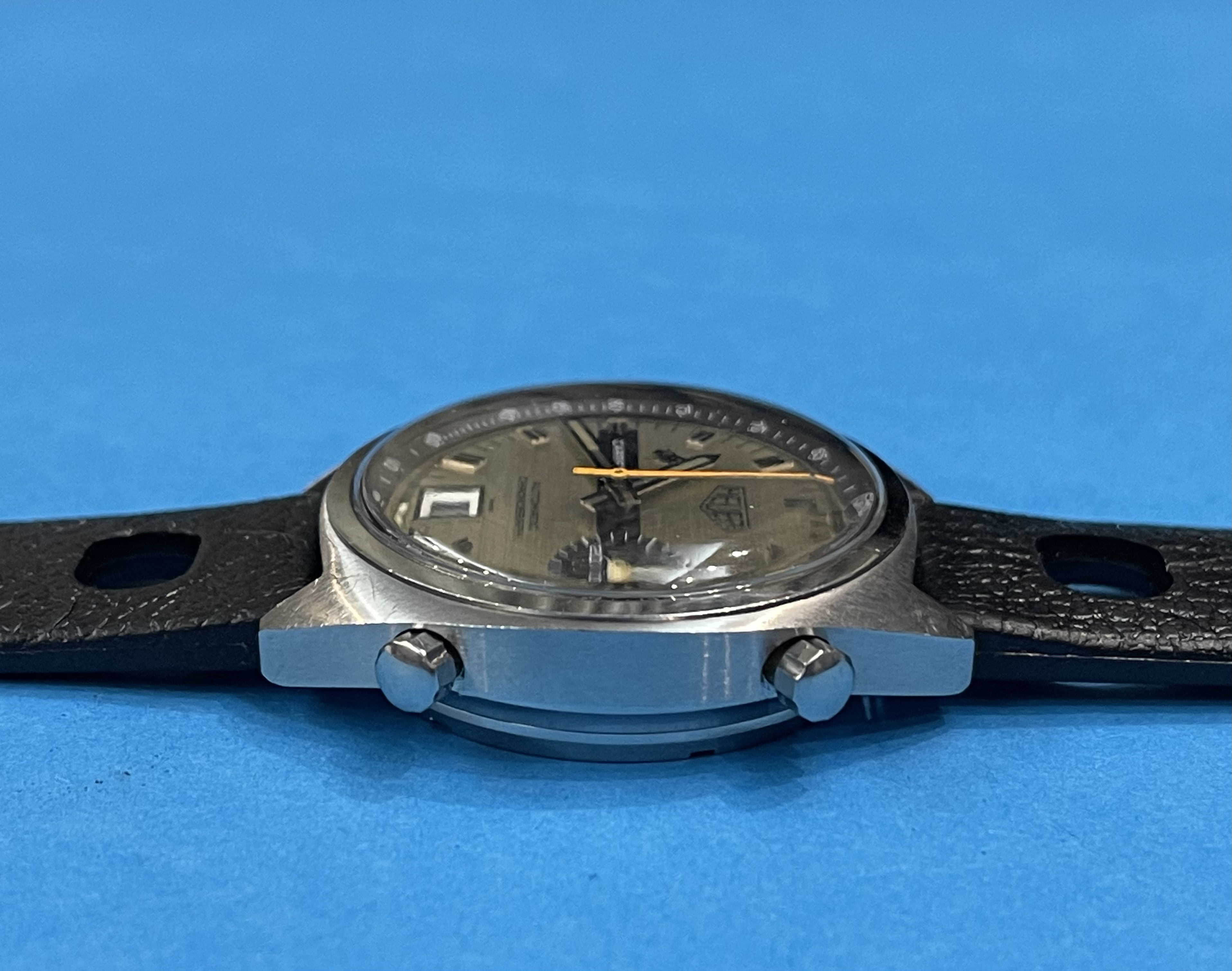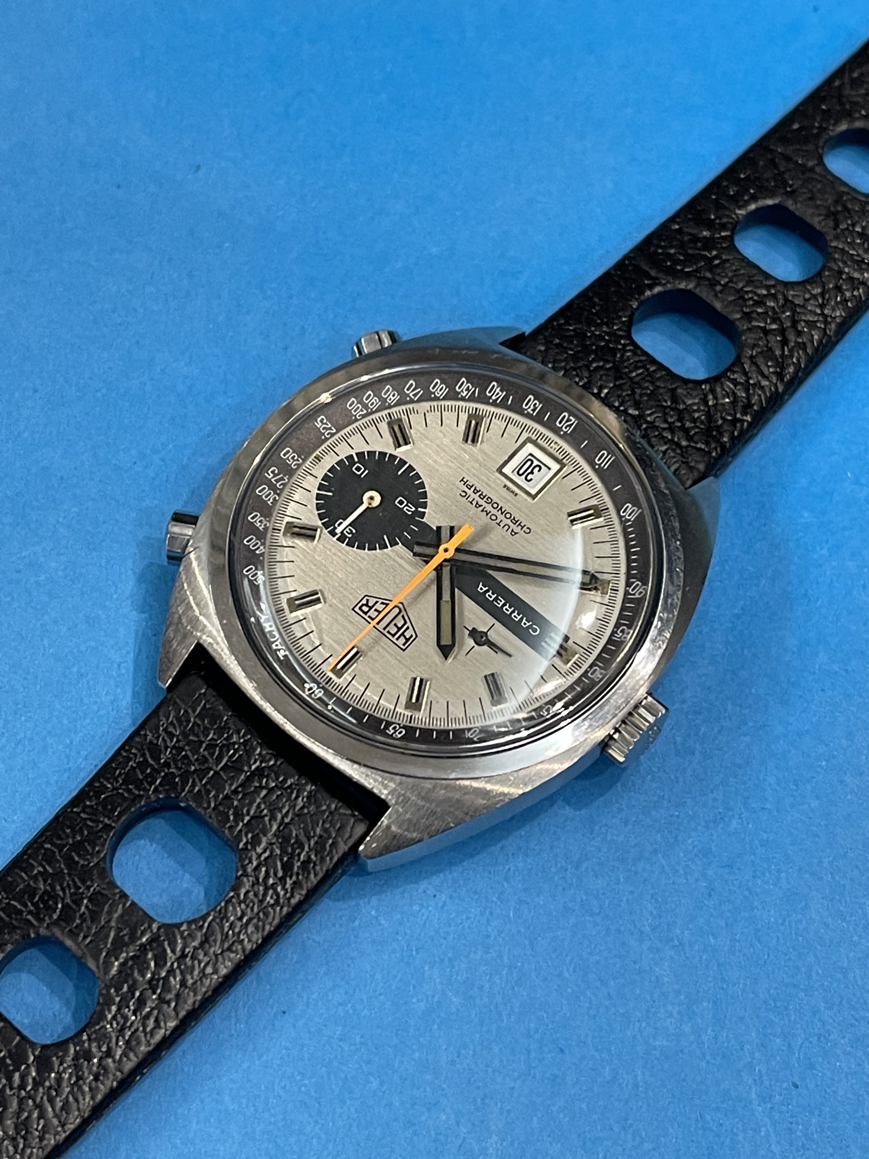 Nicest thing here is the dial, it is horizontally brushed silver colored which S stands for in ref 1553S. Tachymeter scale, chrono subdial and Carrera logo are on dark blue background. Dial has Heuer logo, Automatic Chronograph, Swiss inscriptions,