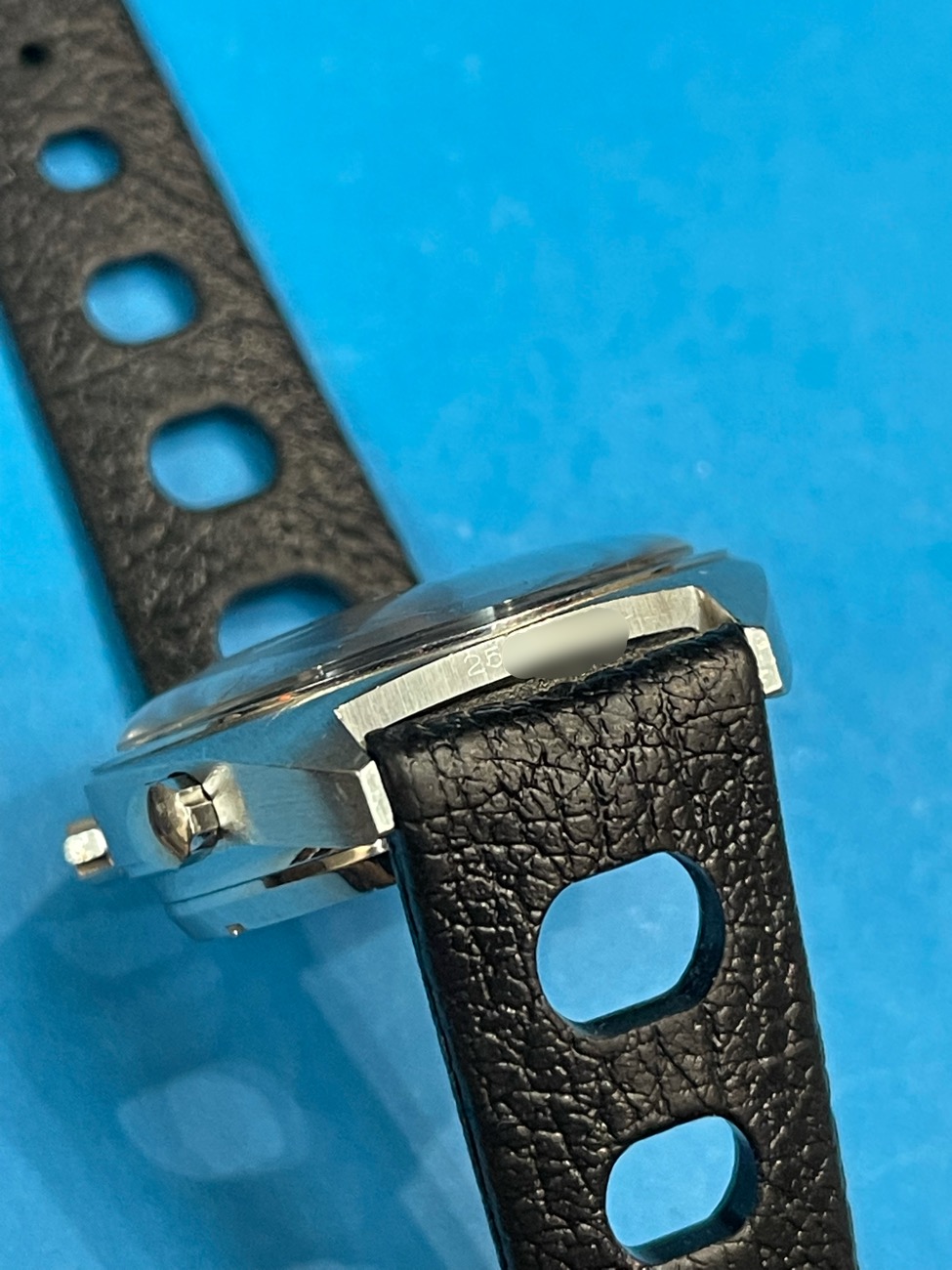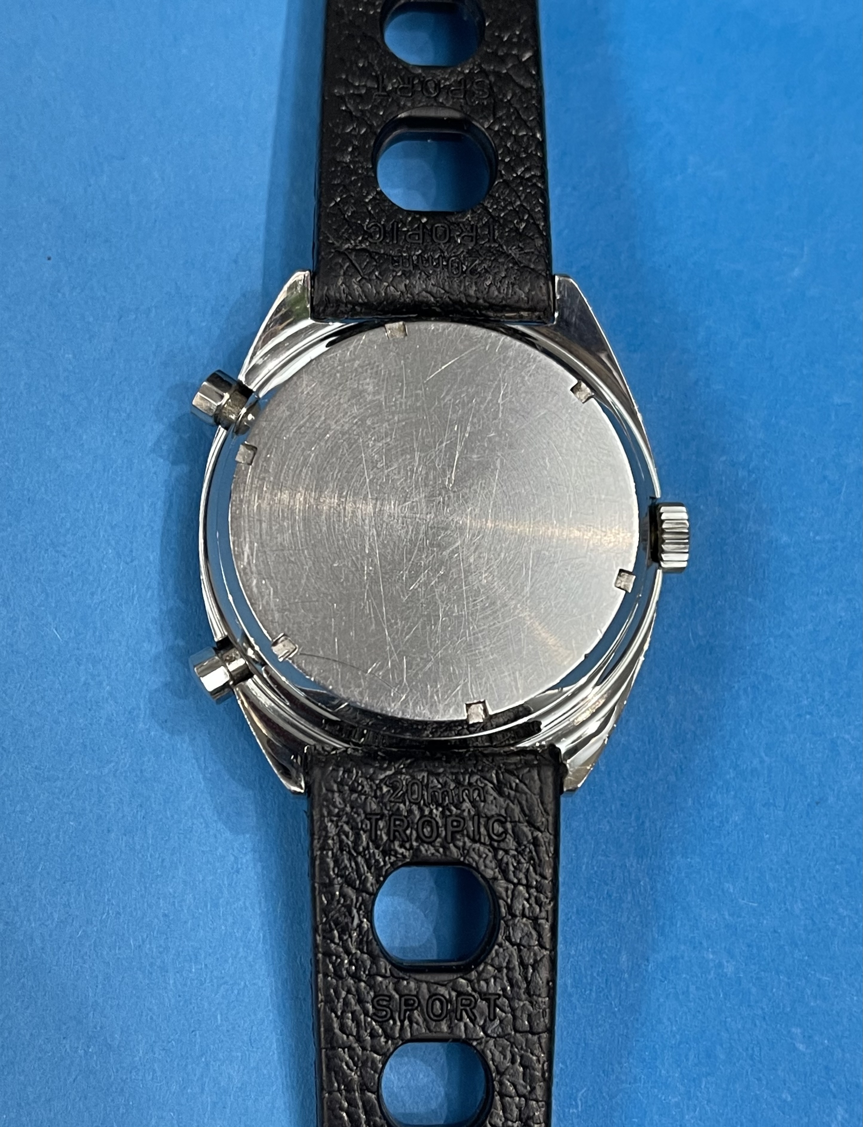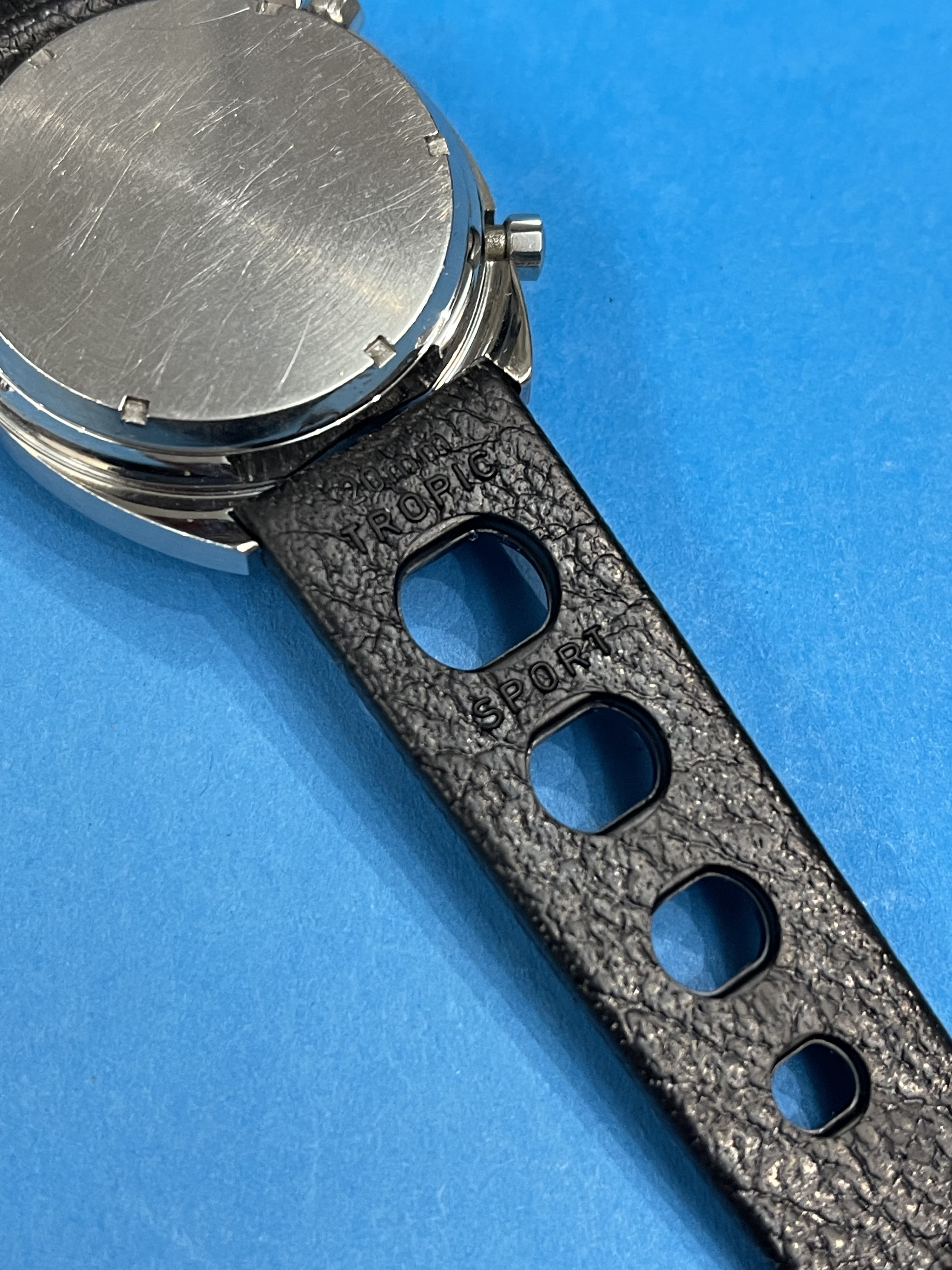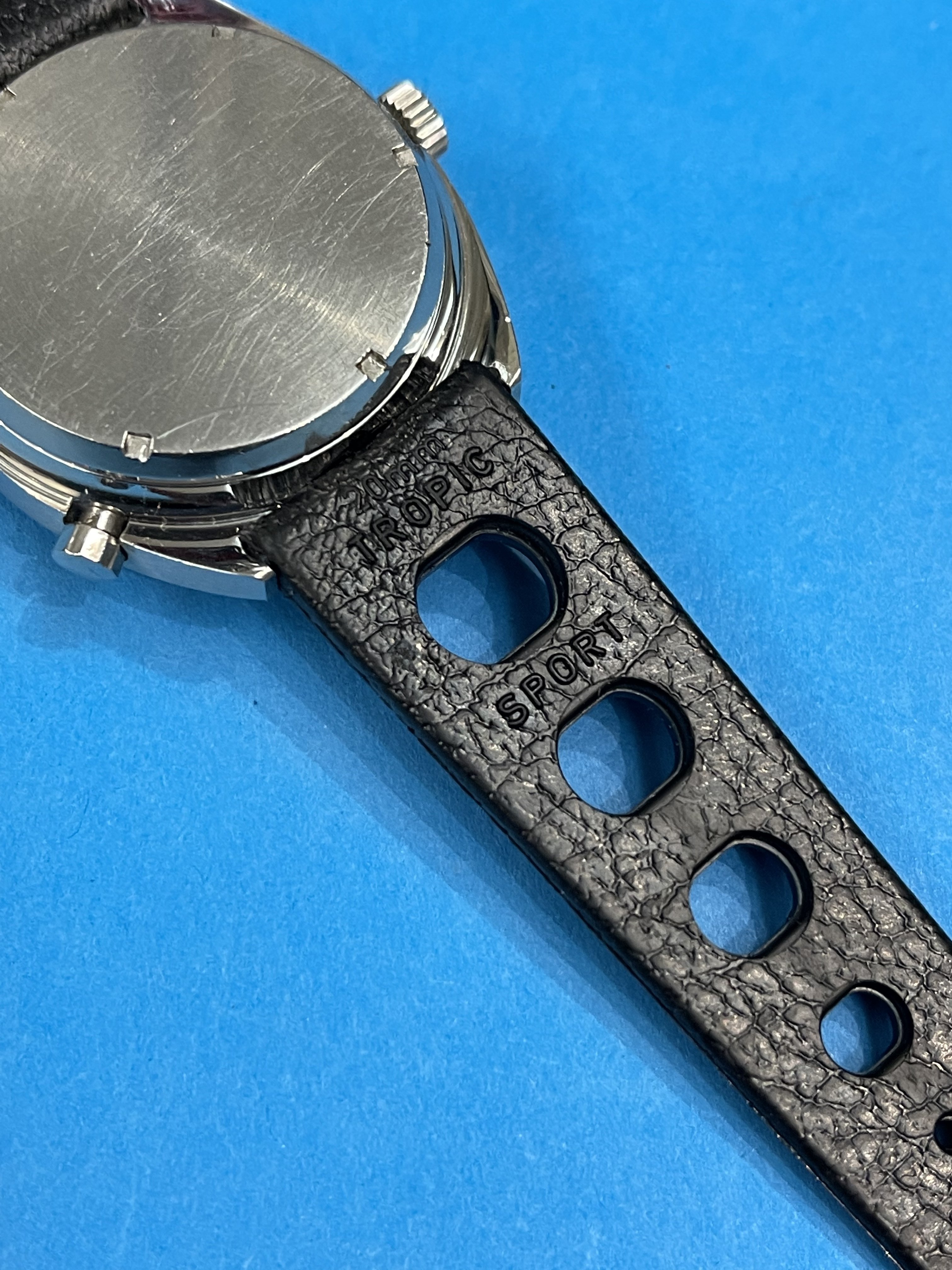 Watch comes on authentic black rubber Tropic Sport 20mm strap with specific to these straps buckle, strap is in very good condition.