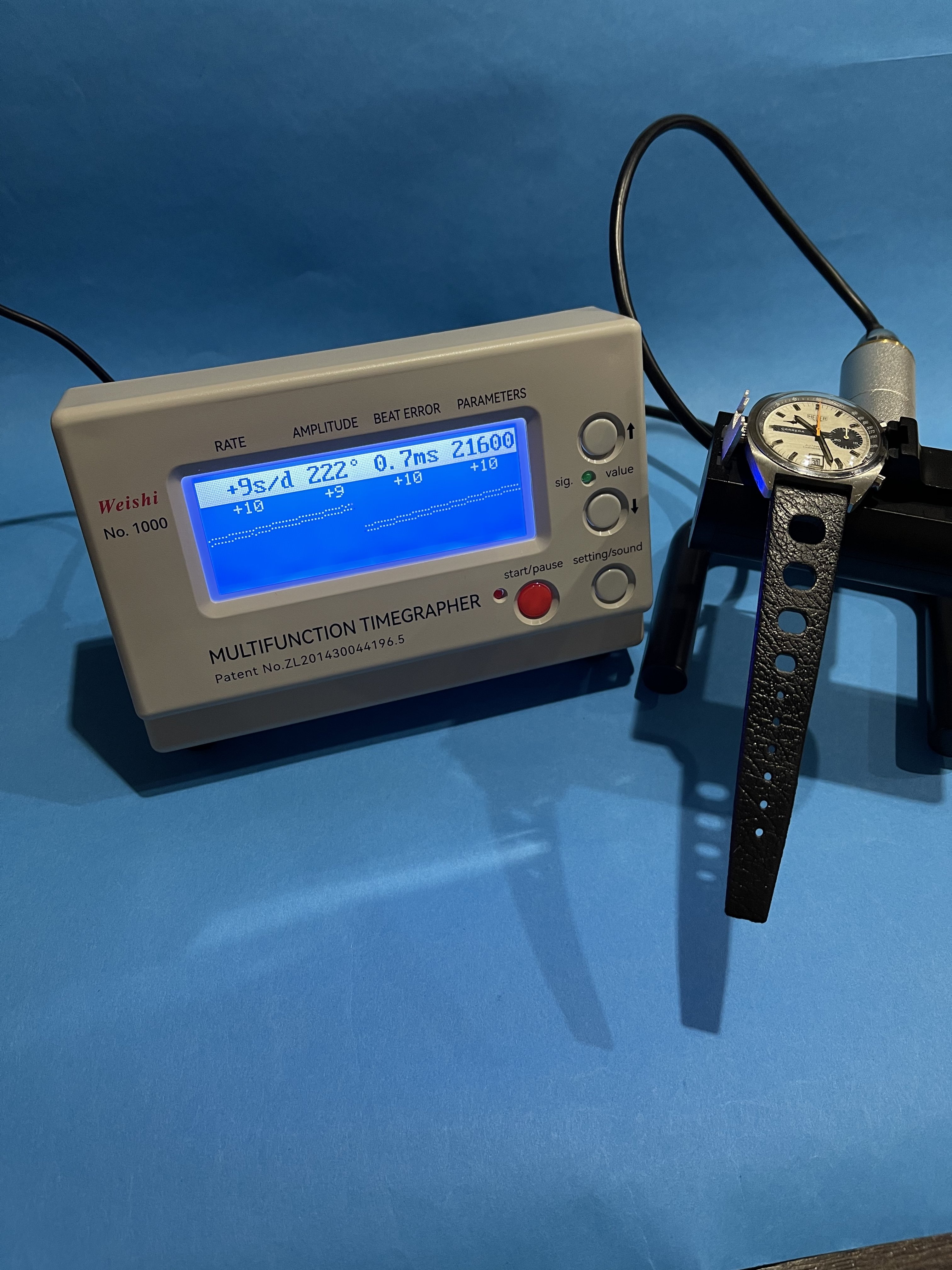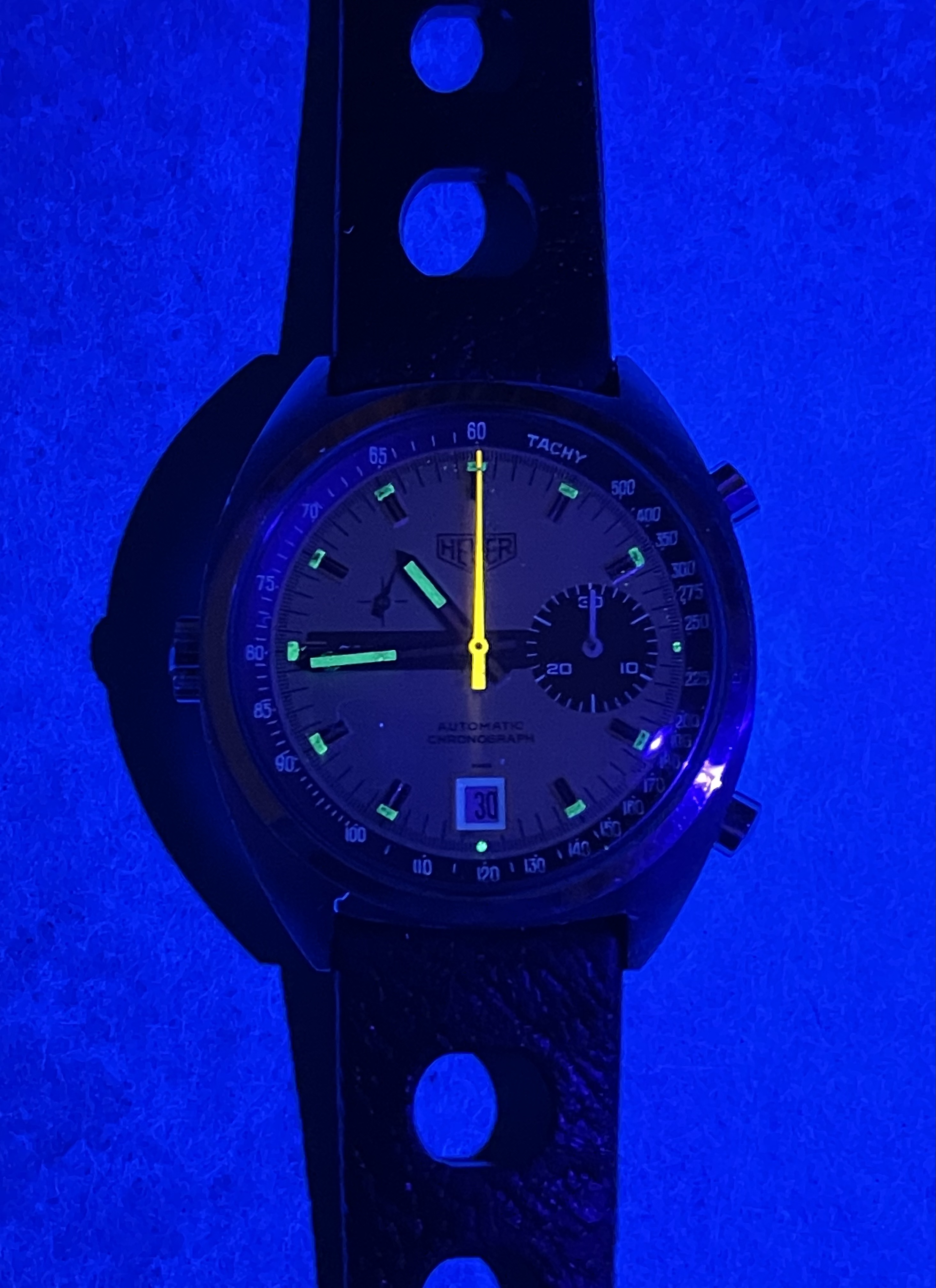 Handset’s lume matches the lume on index hourmarkers, chrono hand is orange, please check UV pic in gallery.