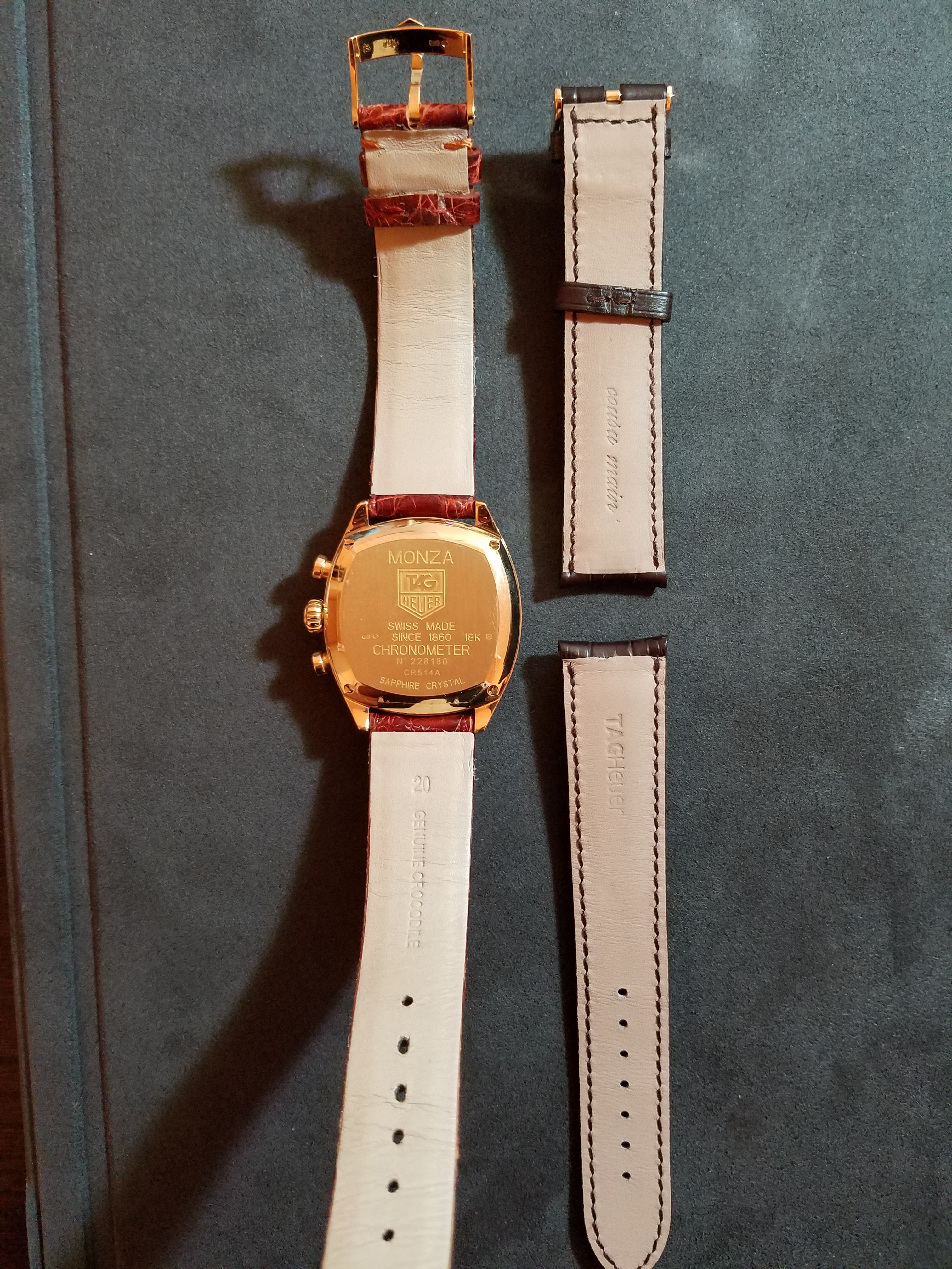 Watch is matched with crocodile leather strap in chestnut color as seen in photos and I will also include Tag Heuer original Croc Leather strap in dark brown color, check pictures.