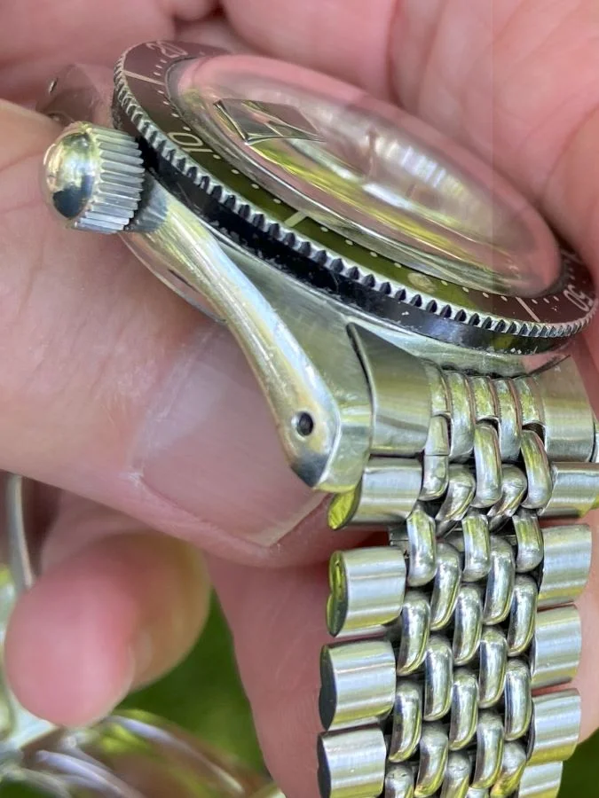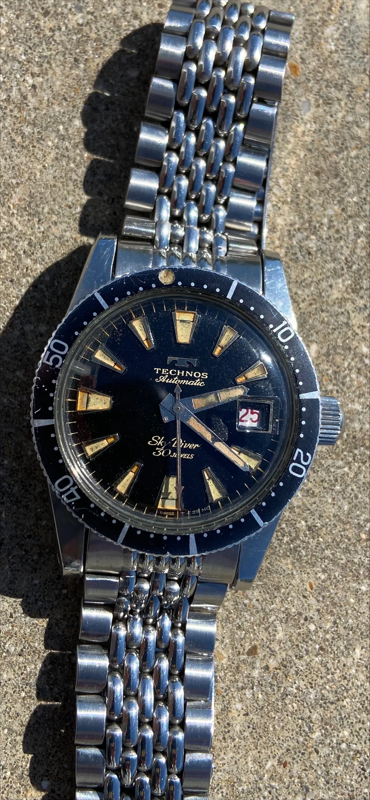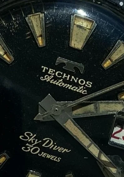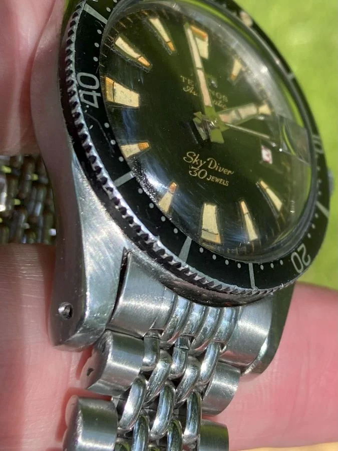 DIAL & HANDS: Stunning factory gloss dial turning matte, gilt text, matching creamy tritium on hands and markers, red date wheel. Very good condition.
