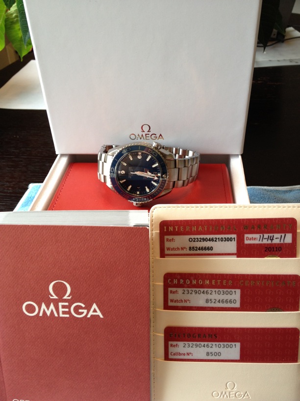 ยทVery hard to find New Release Omega Titanium Planet Ocean Ref #023290462103001. 45.5 MM case, new style bracelet with screws, caliber 8500 movement, sapphire case back, stunning blue dial and blue bezel. LNIB. Keeps perfect time. Watch was set on 11/14/11 and has gained +1 second since. Comes with all boxes and warranty cards $7,990. Open to trades for NIB Rolex Ceramic Submariner or Explorer II (216570). I can be contacted at [email protected]