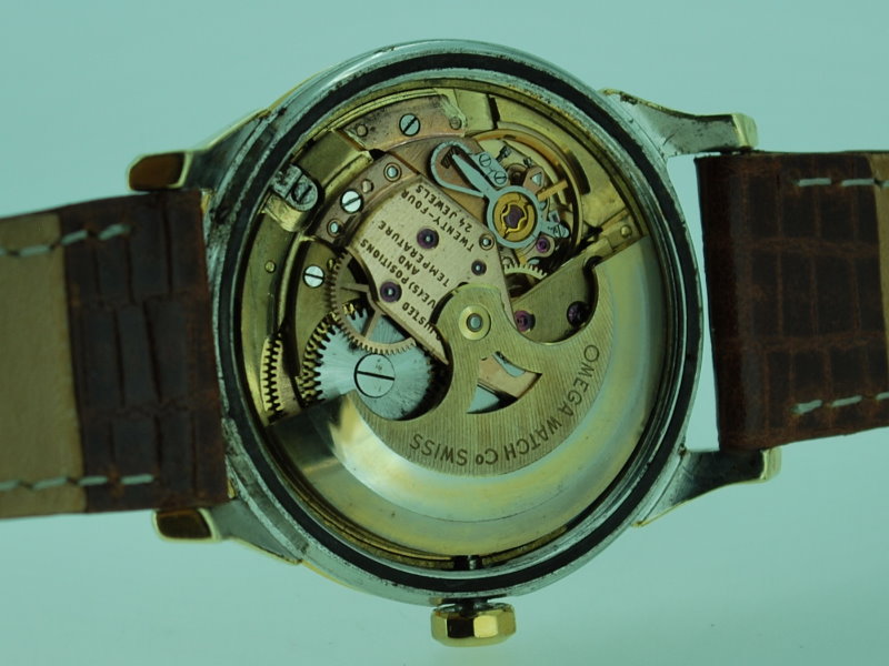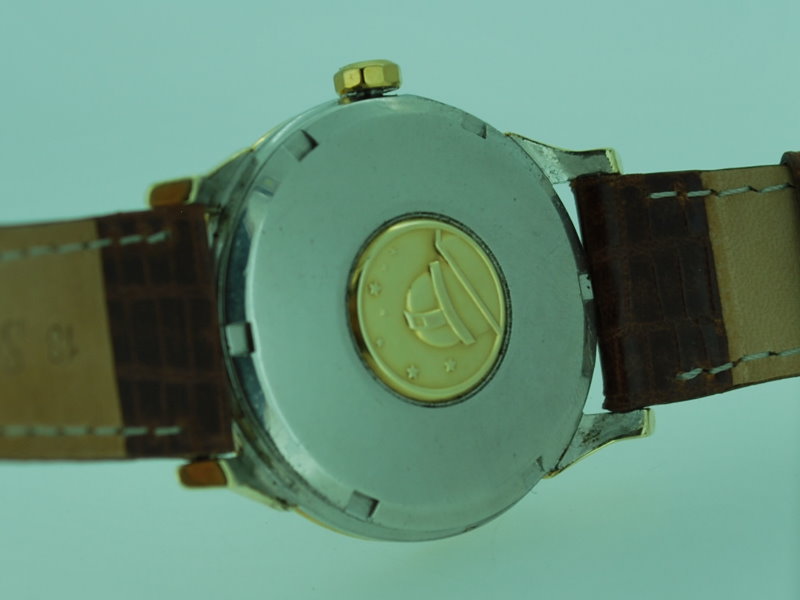 Automatic and Manual Winding. Has Been Service Recently and Runs Well. The Case is Gold Plated and Stainless Steel Caseback with 18k Solid Gold Bezel. Watch measurement: Width 34mm excluding crown, Length is 42mm from lug to lug and thickness is 11mm from crystal to caseback. Original Gold Colored Dial texts on the Dial with the word " AUTOMATIC CHRONOMETER OFFICIALLY CERTIFIED CONSTELLATION Has Been Retouched ", Original Hands, Original Crown. Replacement acrylic crystal.