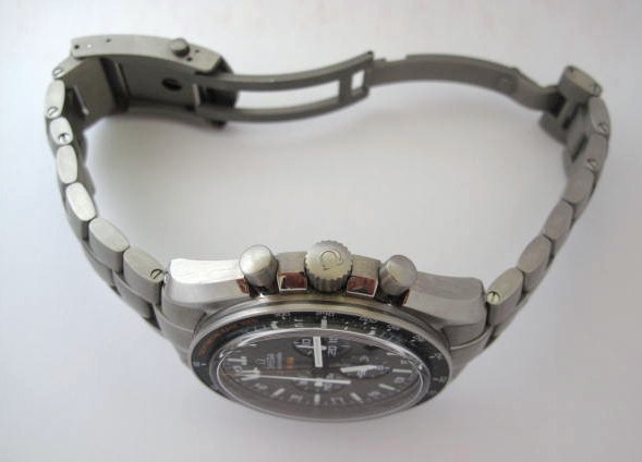 This titanium automatic Speedmaster chronograph GMT is complete as shown in the picture including all 3 of the Omega plastic cards.