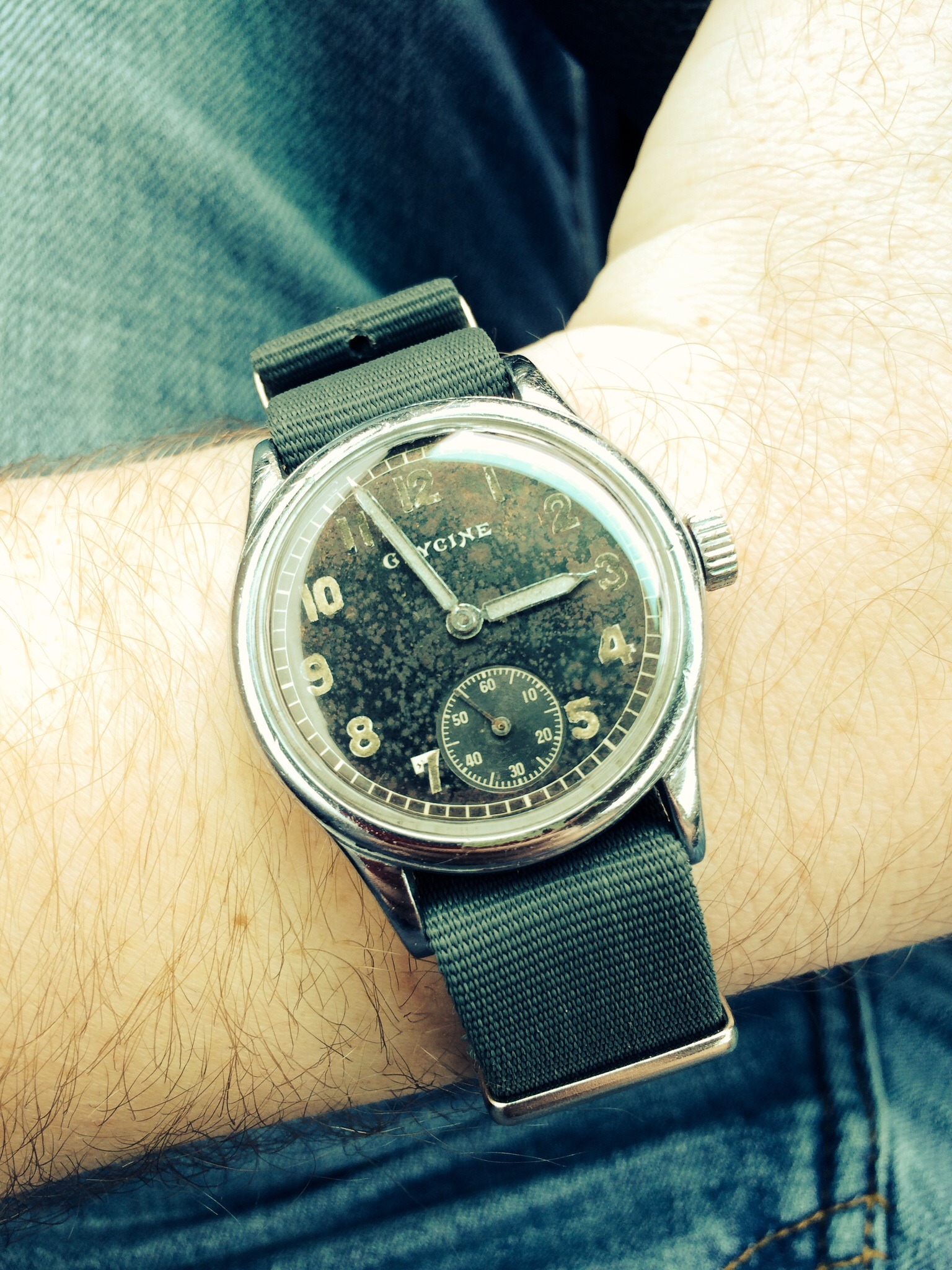 ·I recently had the opportunity to purchase a Glycine Dienstuhr Heer German issued Wehrmacht watch. The "DH" watches were contracted by the Germans during the war to meet the needs of the military for jobs requiring a watch. Many companies provided watches to the German military including names we all know like Glycine, Zenith, Longines, and about 20 more. All of the DH issued watches have the same general characteristics similar to mine below.
