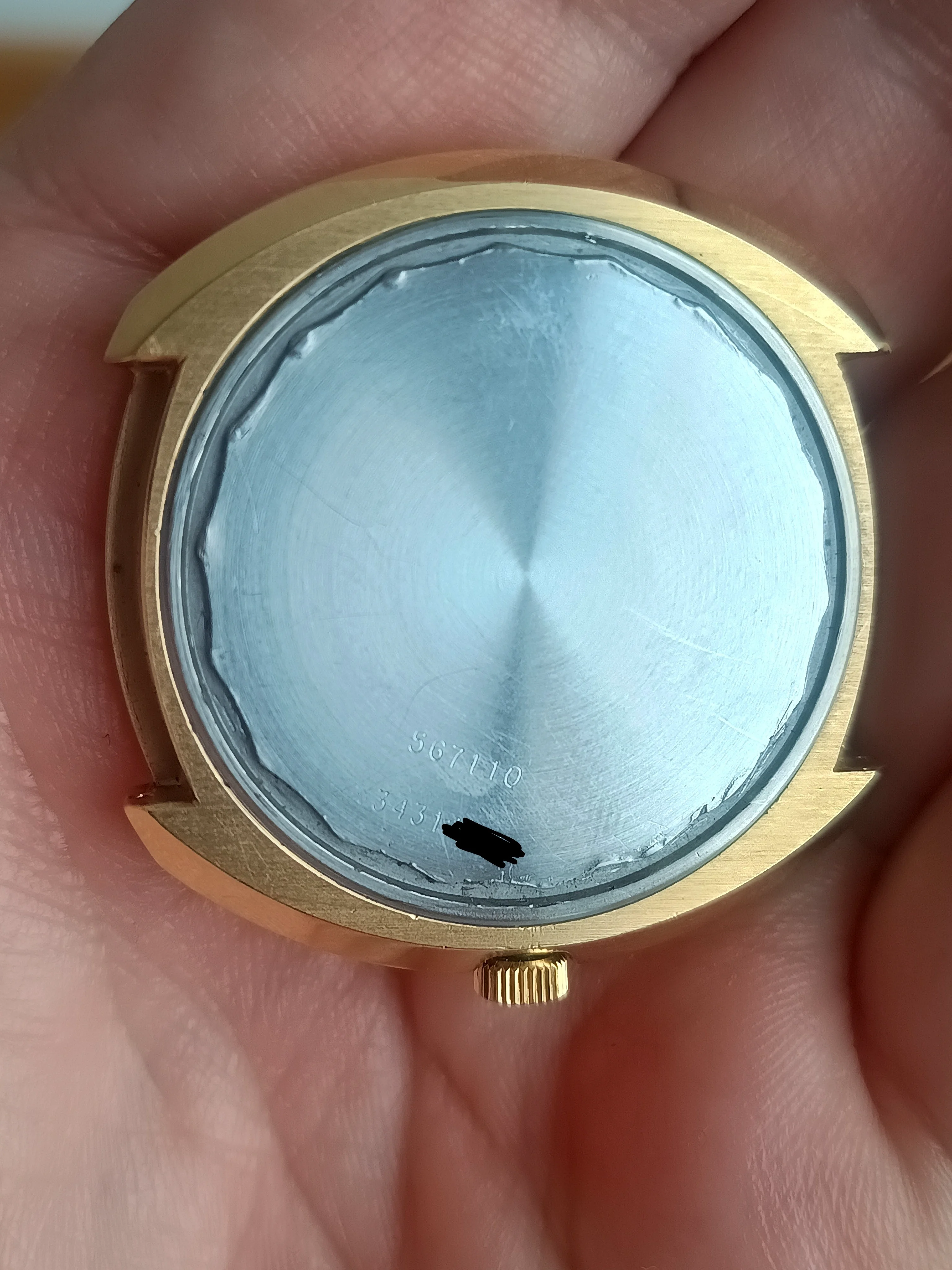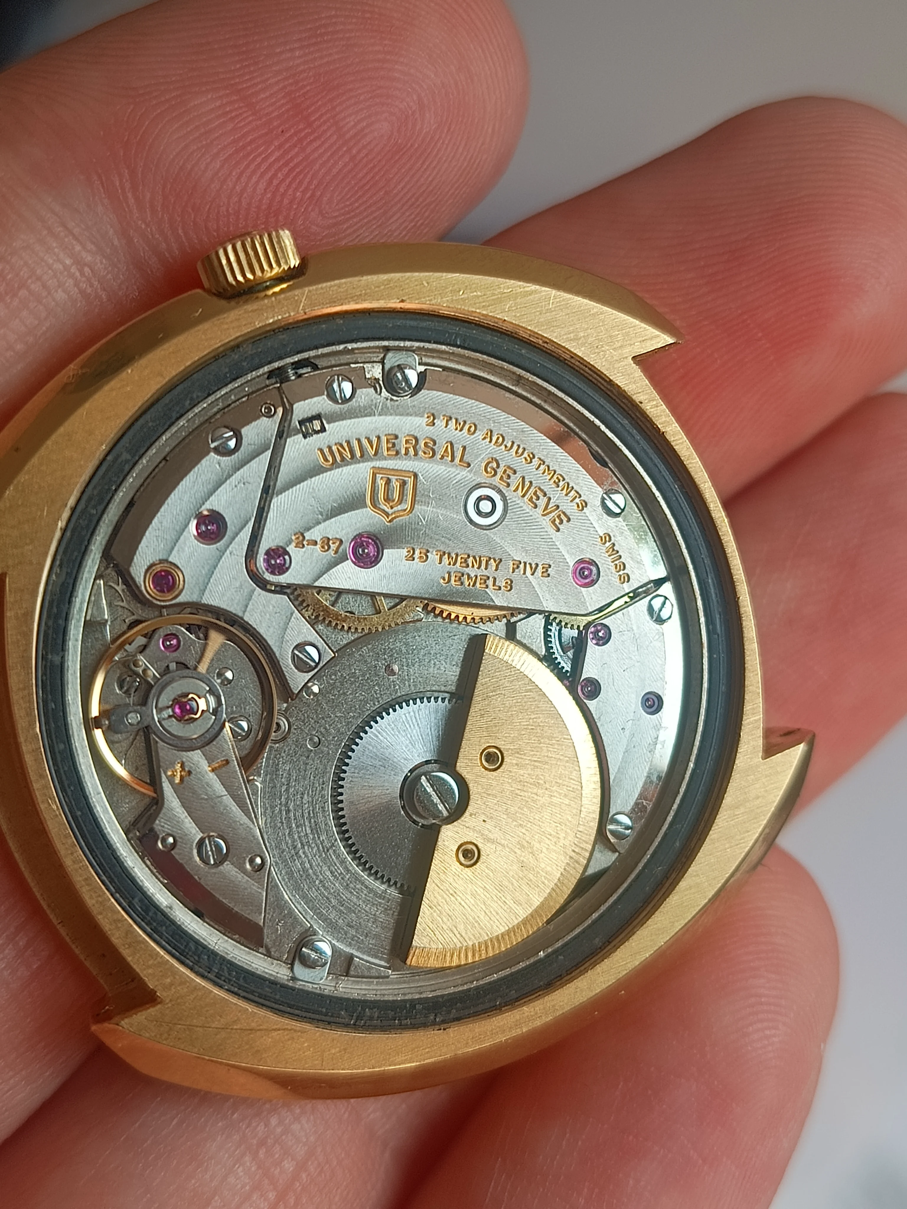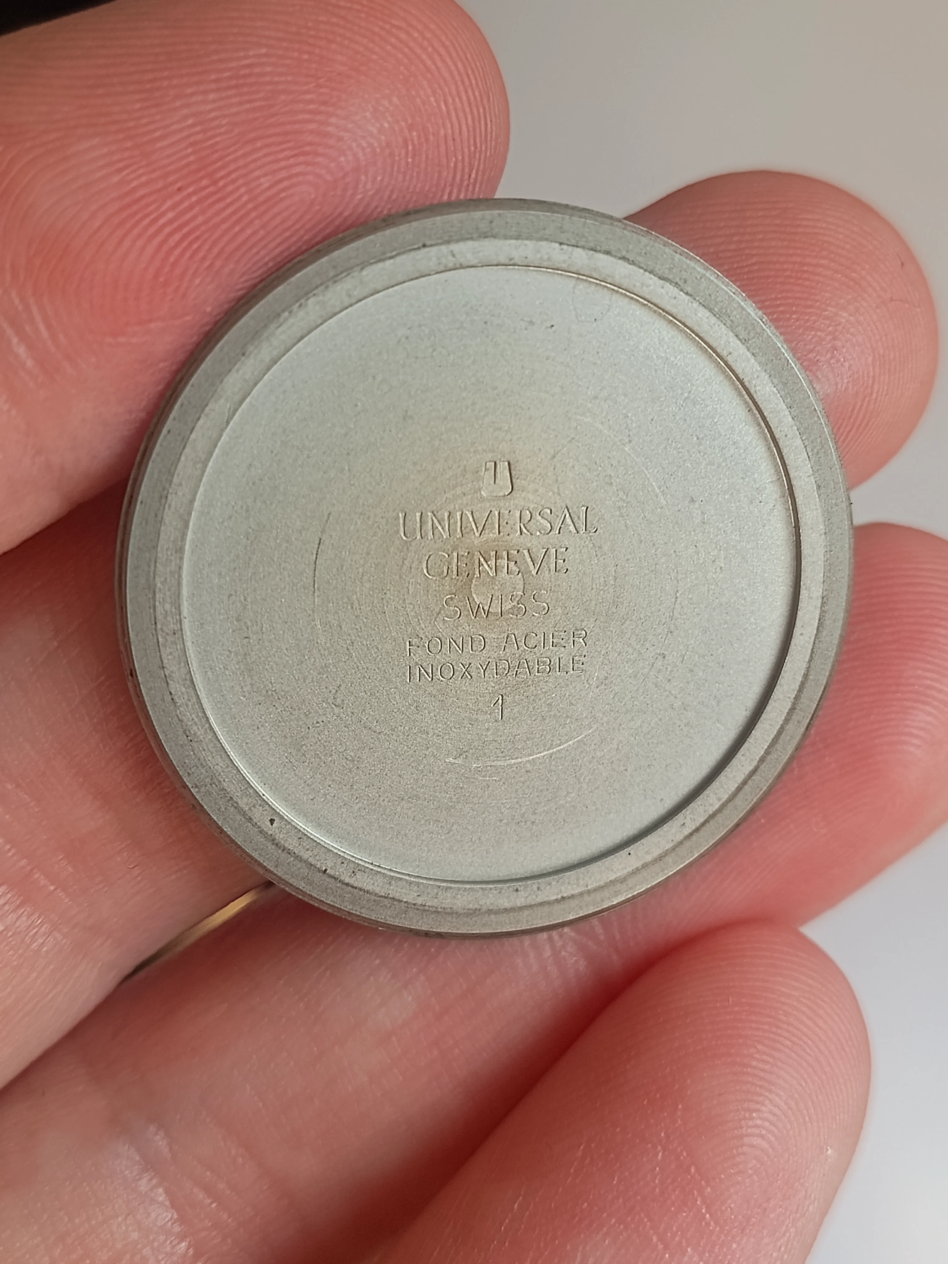The Dial is flawless and has no cracks in the stone, the date window is nicely executed with a golden frame and the printing is executed flawlessly and 100% consistent with what we see on other Universal Geneve models from the era. The Reference Number also makes sense:
