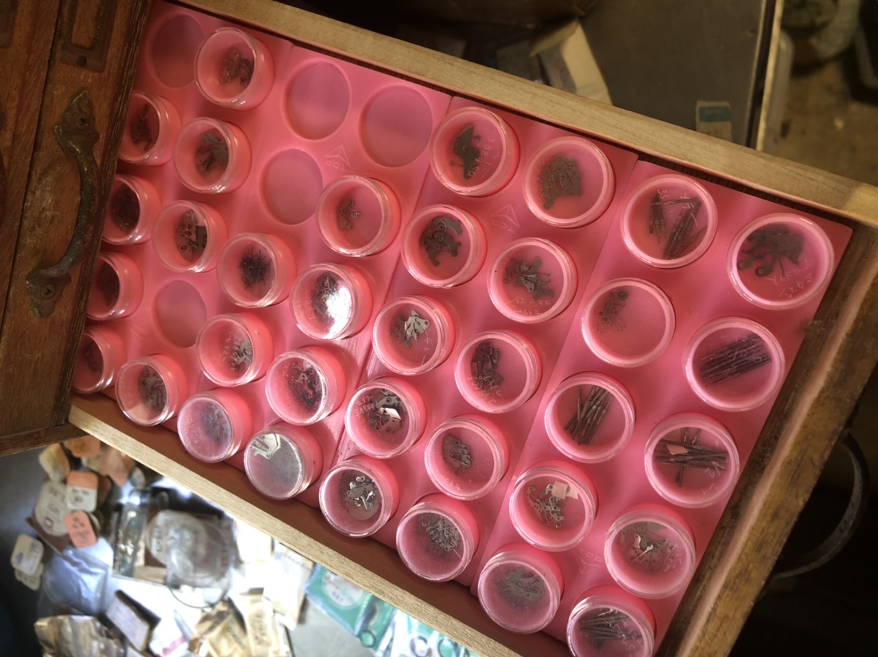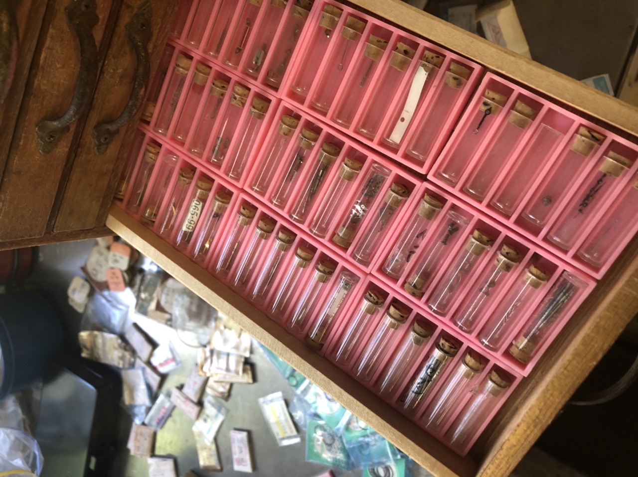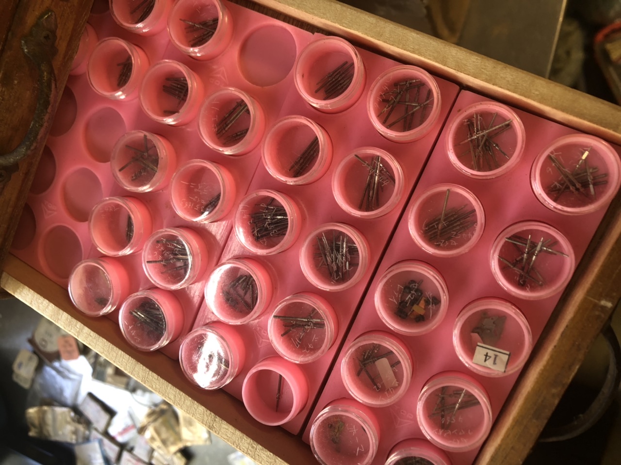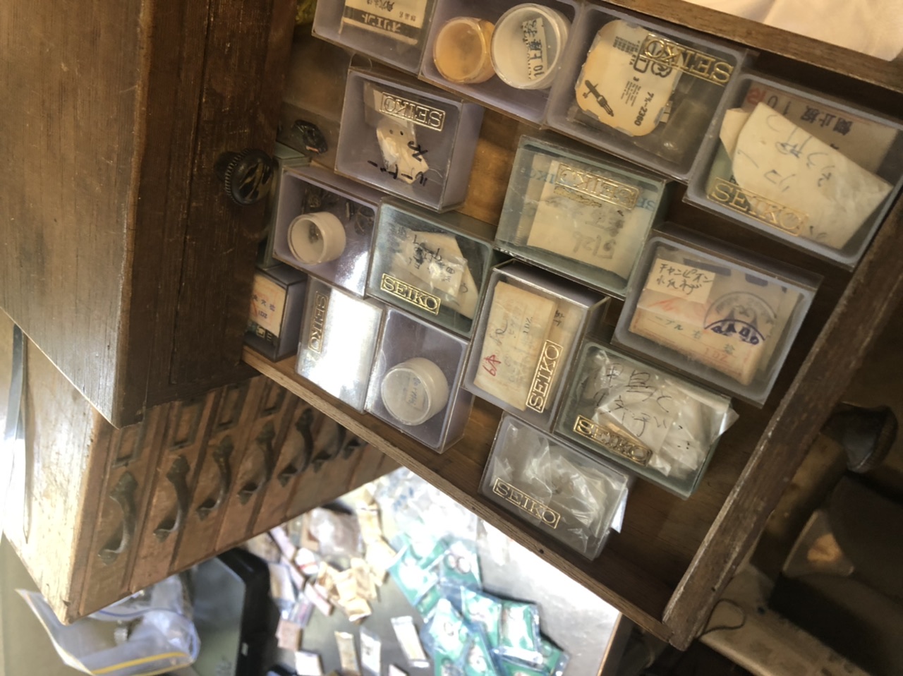·I recently bought a couple ofvintage watchmaker’s drawers for cheap and was happy just to get the drawers for storage of my watch bits. It might be a slow process working out what the many pieces are since it’s all in Japanese or unlabeled.