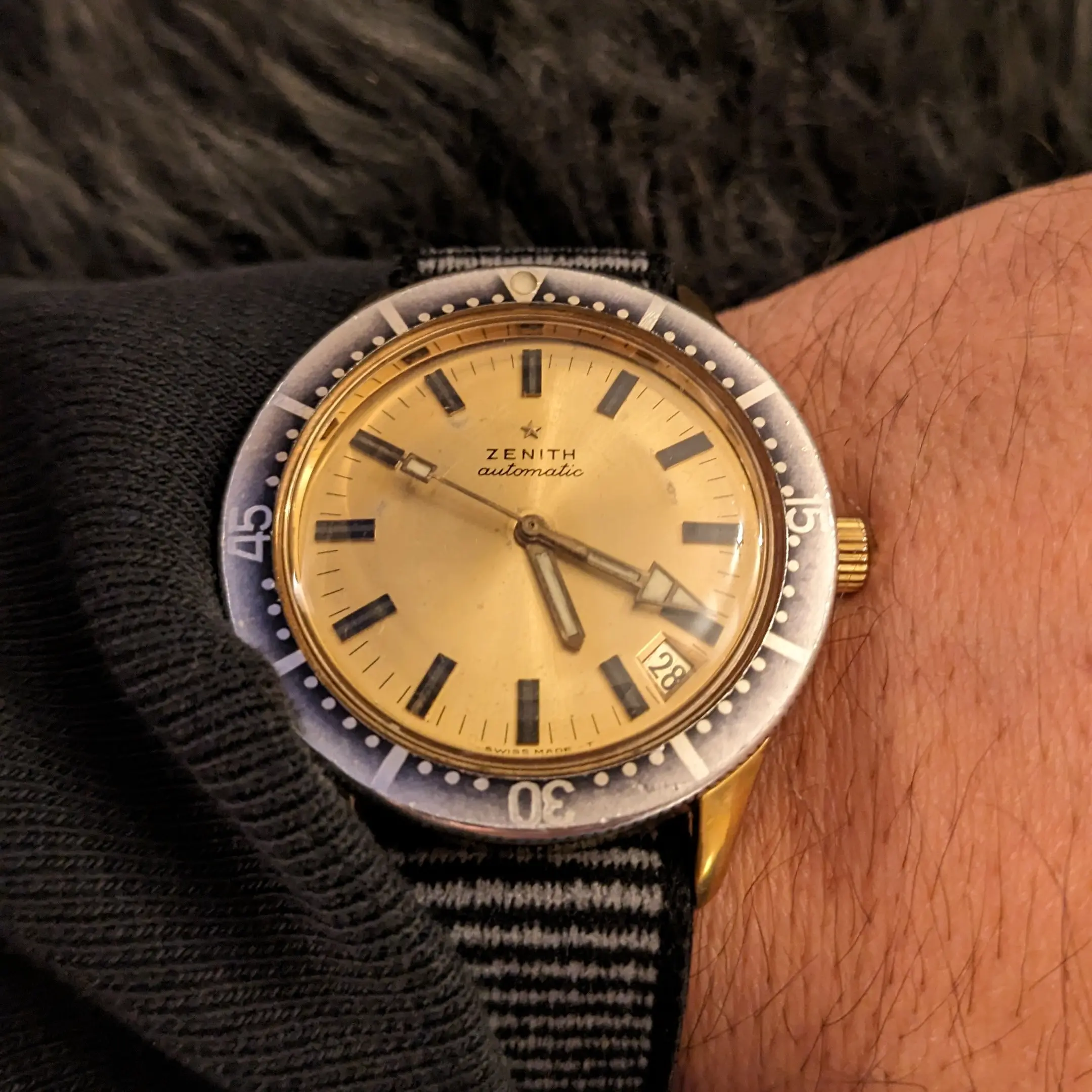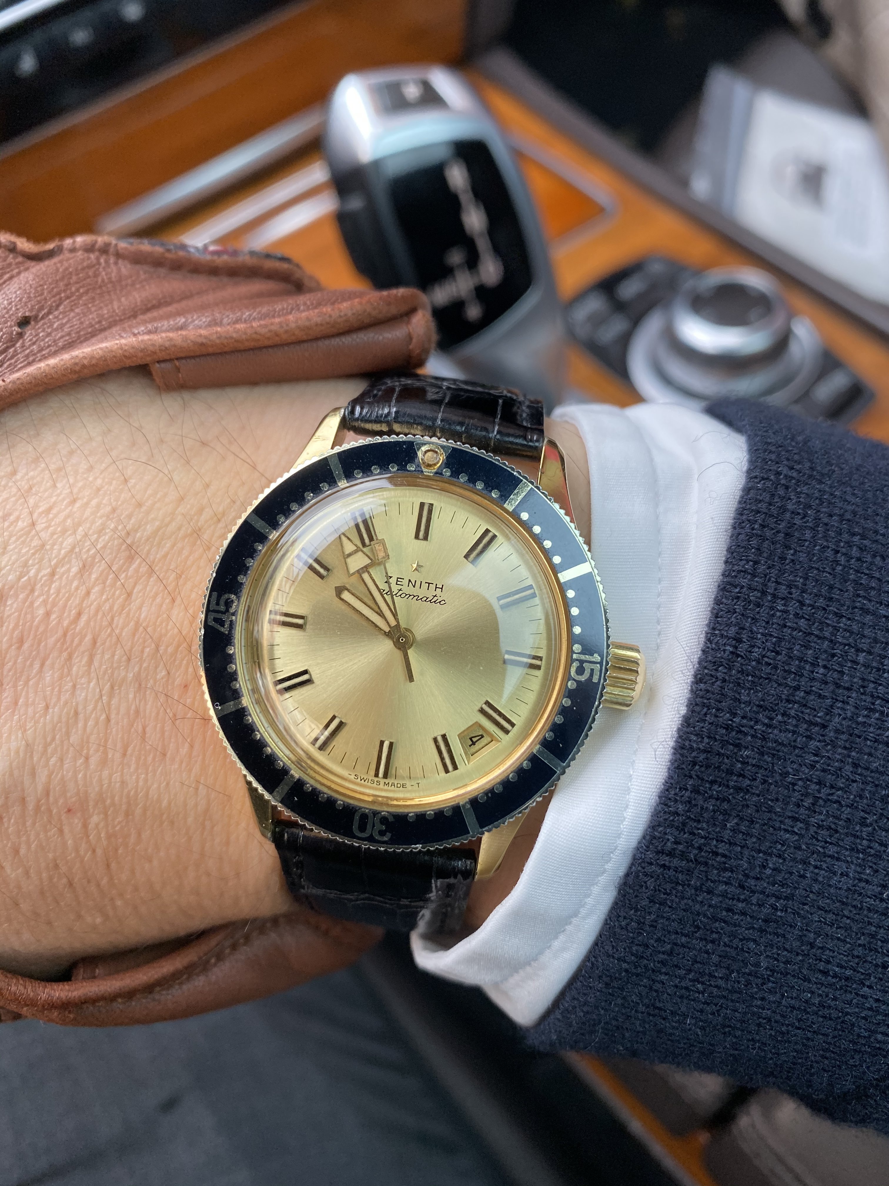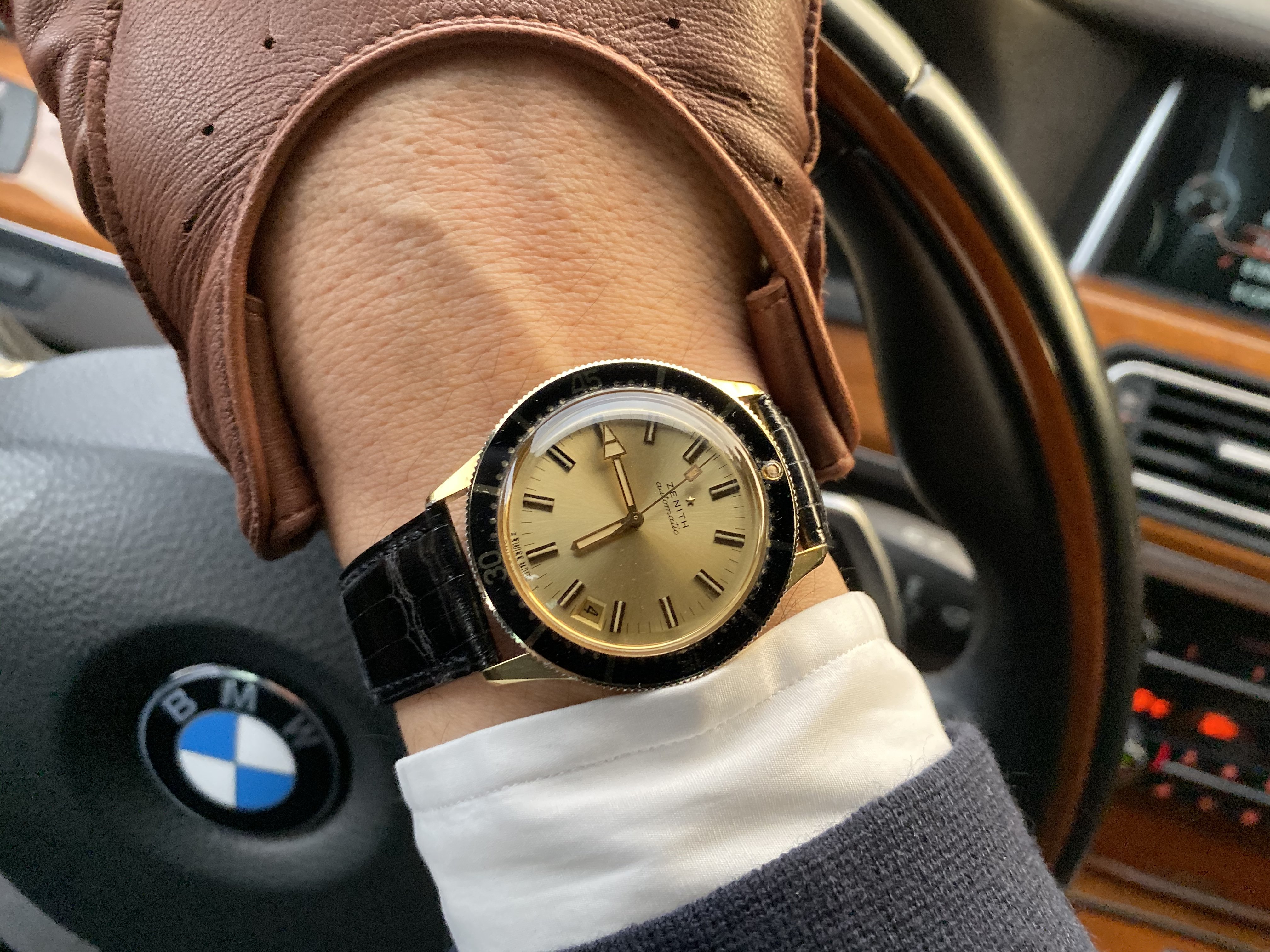 I have to say I use it with leather straps, instead of NSA gold plated bracelet ... in my opinion, it is an excellent watch, with a diver look, but gold offer an elegant version of it, so you can easily wear it with a suit (I do!)